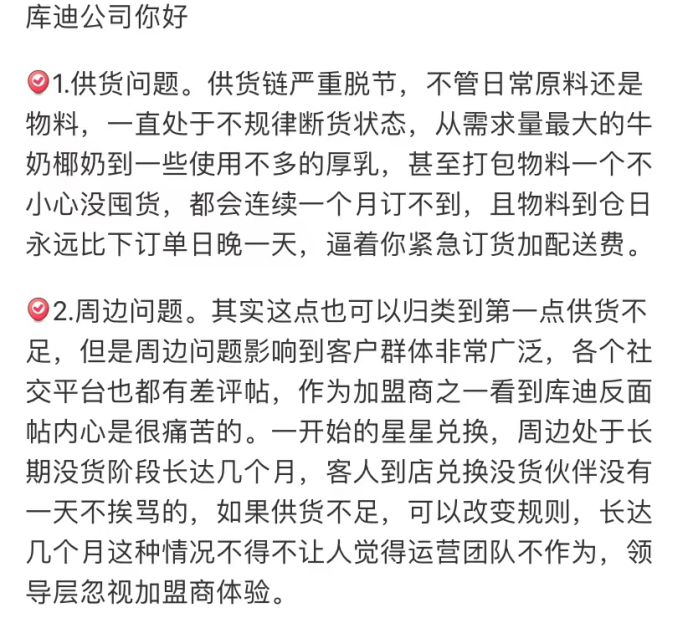 来源|极点商业 缺乏资本助力,联营商又不愿继续流血陪跑,库迪靠蒙眼狂奔抢夺的规模优势或将面临崩塌。 刚刚迈入2024年,咖啡茶饮赛道围绕联名就卷起来了。 据了解,包括沪上阿姨、库迪、奈雪等在内的品牌都将在1月份推出新的联名:沪上阿姨合作魔道祖师、库迪签约王一博作为新代言人、奈雪合作鲨鱼猫。 这之中,又以近期频频推出新联名的库迪尤为活跃。 在王一博之前,库迪曾签约了另一流量艺人范丞丞作为品牌代言人,并与过去几个月的时间内先后和粉红小熊、《甄嬛传》、《间谍过家家》等热门IP牵手,推出了联名系列产品。 遗憾的是,这些联名均未在全网掀起太大水花,反倒是周边时不时缺货的吐槽会将大众关注点再度引向其尚不成熟的供应链,让他们对品牌的印象分日渐走低。 ![]() 眼下,供应链问题仍未得到有效解决,新代言人能为库迪带去新的曙光吗? 01联名频频哑火,口碑不升反跌 从范丞丞到粉红小熊、《甄嬛传》、《间谍过家家》等,库迪过去两个月合作的IP基本都自带热度,甚至横跨了二次元粉、电视剧粉、流量明星粉数个圈层,结果却是没有一次联名收获到了现象级出圈的热度。 诚然,合作的IP不具备太高的国民度是原因之一。 像是同样联名动画IP的瑞幸选择的就是国民度明显更高的《猫和老鼠》,在社交平台微博的话题广场,二者相关话题的热度差异十分明显。截至目前,#库迪咖啡间谍过家家#话题总阅读为389.6万,#瑞幸 猫和老鼠#话题总阅读则以达到2.3亿。 ![]() 《间谍过家家》本就源自相对小众的二次元圈层,热度不及《猫和老鼠》尚情有可原。但,在国内已翻红无数次的《甄嬛传》也没能带火库迪的联名,品牌就很难完全置身事外了。 在电视剧讨论热度相对较高的抖音平台,#甄嬛传已超700亿次的播放量与#库迪甄嬛传联名刚过百万次的播放量,实在相去甚远。 ![]() 联名哑火在消费行业也不算新鲜事,但至少,不能让本是为提升品牌口碑和销量的联名沦为消费者扣除品牌印象分的审判大会。 可跑出6000家门店规模的库迪,因疏于供应链建设和管理,正在让自身陷入“联名越多、吐槽越狠”的困境。 在频繁推出联名以前,库迪就曾因店内热狗、厚乳拿铁等产品时不时断货或者过早售罄引发过消费者的不满,直呼“烦死了”。 ![]() 联名以后,周边缺货更是成为常态,那些期待已久的粉丝朋友因为没能拿到想要的周边产品只能忍不住抱怨,“库迪怎么联名都做不好”。 ![]() 供应链不给力,经常性订不到货的联营商也是有苦难言。 早前就有联营商表示自己店内麦芬等甜品以及单杯打包袋经常缺货,联名活动上线后,周边更是订不到。 这一次,王一博的联名活动尚未开启,就有联营商在内部群开始“忧心”订不到相关产品。再次印证了联名周边缺货已是常态。 ![]() 早些时候,业内盛传库迪在6月已经开始通过银行承兑汇票给供应商做结算,由此可推测库迪当前的现金流状况可能并不乐观。如此一来,供应链建设需要耗费的真金白银在短时间内也恐怕很难得到彻底解决。 而在那之前,再火爆的IP大概率都难救库迪的口碑。 02无效联名背后,狂奔隐忧难解 于消费品牌而言,联名能否掀起国民级热度的确存在一定玄学,但可确定的是,若能兼具合作品牌的国民度够高、联名新品的口味够好这两点,联名热度并不会太低。 库迪之所以数次出现对口碑、销量无太大助力的无效联名,本质还是受累于疏于提升的供应链能力、研发能力和营销能力。 成立初期,库迪靠着长时间的低价以及对联营商的补贴策略,在连锁咖啡这片尚未发展成红海的市场疯狂攻城略地,达成了如今的6000多家门店规模。 但这个过程中,其不论是供应链、研发还是营销都没能同步精进,为后续的长远发展埋下了巨大的隐患。 供应链能力的不成熟,导致“缺货”成为不少门店的长期问题。在非联名阶段,缺货会影响消费者的消费体验;在联名阶段,缺货会辜负粉丝群体对联名IP的期待。长此以往,消费者对库迪的印象分只会一跌再跌。 不止消费者,夹在中间的联营商日子也不好过。 在前段时间热度较高的《致库迪咖啡公司管理的另一封信》里,该联营商就明确指出过周边缺货的问题,并表示,“周边问题影响到的客户群体非常广泛,客人到店兑换没货,店里小伙伴没有一天不挨骂的。”他认为“库迪领导层忽视加盟商体验”。 ![]() 产品研发层面,库迪早期选择“像素级复刻”瑞幸的菜单,什么生椰拿铁、瑞纳冰等产品,都能在库迪的菜单里找到,缺乏辨识度。品牌做起来之后倒是开始推出有自身特色的产品了,但不仅至今未出一款爆品,还经常被吐槽新品难喝。 即便有《甄嬛传》联名加持,仍旧被吐槽难喝的桂圆红枣阿胶燕麦拿铁,某种程度上就是印证了库迪研发能力的不足。 ![]() 多轮联名均未在全网掀起太大的水花,除开部分IP受众相对较窄以外,库迪自身对营销的忽视也是可能原因之一。毕竟,在这个消费品牌都争着成为显眼包的年代,不舍得在营销上砸钱是很难得到“花心”的新时代消费者的关注的。 但这就又回到了“库迪现金流可能不乐观”这一老生常态的问题。更残酷的是,不论是外部环境还是内部发展,都难以在短时间为库迪的现金流“回血”。 从外部环境看,在资本市场对消费项目考核趋严,并且以陆正耀为首的“前瑞幸财务造假团队”背负着一众黑历史的背景下,库迪
