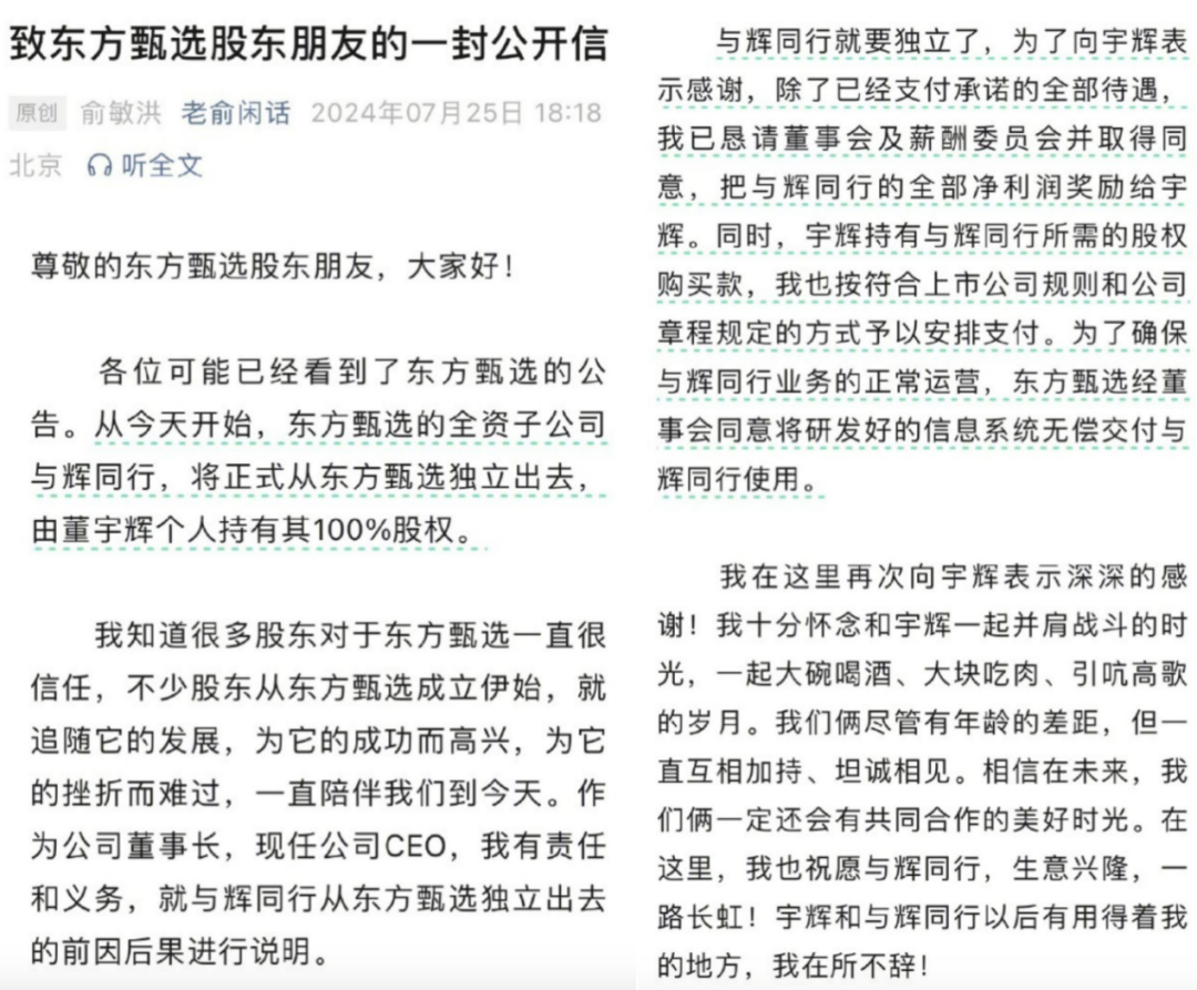 作者:RBF内容组 出品:零售商业财经 7月25日消息,东方甄选在港交所公告,董宇辉已决定不再担任公司雇员及公司一个合并联属实体的高级管理层,该离任乃由于董宇辉的职业抱负、对彼其他事业的投入及个人时间安排,并于2024年7月25日生效。 东方甄选表示,除向董宇辉悉数支付所承诺的福利及补偿外,董事会主席俞敏洪已寻求董事会及董事会薪酬委员会批准将与辉同行的所有余下未分配溢利分派予董宇辉。此外,根据上市规则及本公司组织章程细则,俞敏洪已就董宇辉收购与辉同行的结算代价作出安排。为维持与辉同行的正常运营,公司将向与辉同行免费提供自主研发的信息系统。 ![]() 图源:港交所 与此同时,东方甄选提及,7月25日,董宇辉(买方)、北京新东方迅程网络科技有限公司(卖方)及与辉同行(北京)科技有限公司(目标公司)订立出售协议,据此,卖方同意出售,而买方同意收购目标公司的100%股权,代价为人民币7658.55万元。 就在不久前,与辉同行抖音官方账号官宣搬家的消息。7月21日晚,“自立门户”的与辉同行直播团队完成新办公地址的首次直播,稳居当晚抖音直播带货榜首。据第三方平台飞瓜数据统计,21日晚的直播带动“与辉同行”抖音账号一夜涨粉16.79万,通过直播间吸粉达到了14.7万,创近一个月单日涨粉规模新高。 事实上,早在今年3月份,董宇辉便在直播中透露其独立工作室“与辉同行”要搬家了,他直言,更换场地后房租要飙升5倍,使他压力骤升。 ![]() 图源:与辉同行 空间不足或许只是与辉同行搬家的一个表层原因,深层次的原因在于“搬家”也有利于与辉同行建立“独立”的公司体系。 “自立门户”早已为董宇辉的正式离职埋下伏笔,而东方甄选“去辉化”在经历由暗向明的过程后,最终已成定局。 1、东方甄选切割“套中人” 去年12月,“小作文”风波让一场由资本精打细算、半路被“粉圈文化”裹挟的剧本拉开帷幕。 彼时的董宇辉,已成长为超级头部,是东方甄选的功勋主播。而聊到董宇辉,俞敏洪更直言其为公司发展所做的贡献,且成为头部后依旧沉得住气。俞老师的一番评价,绵里藏针。 直播中,冯唐虽以开玩笑的方式为董宇辉“翻译”道,别飘,不要停,别想着分钱。但云里雾里的董宇辉还在尬笑,不明就里。 于俞敏洪而言,东方甄选想要的是镜头前带货的傀儡,而不是有思想的傀儡,流量的利器和精明的团队想要推谁,几乎都能成功,董宇辉只是恰巧被选中的那一个。 一身光环齐聚,或许让董有了“舍我其谁”的错觉。功高震主,明则唇枪舌剑,刀斧相向,暗则“杯酒释兵权”。 ![]() 图源:微博 至此,“去辉化”的领导层基调初见端倪,这大概也是东方甄选深受董宇辉掣肘时的无奈选择。 流量的时代,长久的噱头是带货直播的护城河。新东方教育的背书和董宇辉式的带货模式走红网络,东方甄选出现一夜涨粉百万的互联网流量带货奇迹。于东方甄选来说,开创“文化背书式”带货模式的董宇辉,就是其核心竞争力。 然而,头部主播的位子,注定坐不长久。头部固化导致直播生态“亚健康”,已经成为平台和MCN公司左右为难的症结。 尤其在“人货场”的逻辑递推下,人的作用逐步凸显,主播不再是平台和MCN公司的“打工人”,而是一颗随时都有可能爆炸的“定时炸弹”。 一方面,主播流量小,平台和MCN公司获利不多,推流成了平台和MCN公司惯用的手段,意在“养肥了薅羊毛”。另一方面,粉丝流量的粘性,让获得推流迅速成长的主播积累起一定的话语资本,马太效应下资源加速集中,形成头部大主播并逐渐固化,大有超越平台、MCN之势。 某种程度上,“小作文”事件运营下场互怼,意在直接拆解董宇辉的“才子诗人”人设,拉下神坛,并最终实现流量与头部脱钩。买通平台推流,神不知鬼不觉实现头部主播更新换代。 此后,东方甄选壮士断腕式地切割头部能否安全着陆,董宇辉驱虎吞狼式地放纵流量能否顺利转场,成为业内探讨的焦点所在。 3、董宇辉欲摆脱“困兽之斗” 从当下的选择来看,董宇辉并未更换“新东家”,而是选择了一条自创山门,培植自家品牌,利用自身流量为品牌引流,实现头部主播向MCN公司或品牌阶级跃升之路。正如坐拥上亿粉丝的小杨兄弟那样,发展自家矩阵,实现长期主义的流量套现。 随着新直播间的启用、团队建设日益完善,预计董宇辉也将全力投入到直播间、团队的建设中。据董宇辉今年6月在直播间透露,其团队规模已从1月成立之初的70人左右,壮大至如今的150人左右,拥有法务等较为完善的组织架构。 对于7月25日港交所公告内容,俞敏洪、董宇辉分别作出回应。 俞敏洪发布《致东方甄选股东朋友的一封公开信》表示:从今天开始,东方甄选的全资子公司与辉同行,将正式从东方甄选独立出去,由董宇辉个人持有其100%股权。 ![]() 图源:老俞闲话公众号(节选) “与辉同行就要独立了,为了向宇辉表示感谢,除了已经支付承诺的全部待遇,我已恳请董事会及薪酬委员会并取得同意,把与辉同行的全部净利润奖励给宇辉。同时,宇辉持有与辉同行所需的股权购买款,我也按符合上市公司规则和公司章程规定的方式予以安排支付。为了确保与辉同行业务的正常运营,东方甄选经董事会同意将研发好的信息系统无偿交付与辉同行使用。”俞敏洪表示。 董宇辉也发长文回应从东方甄选离职,称很庆幸生命某段时刻曾一起度过。 ![]() 图源:
