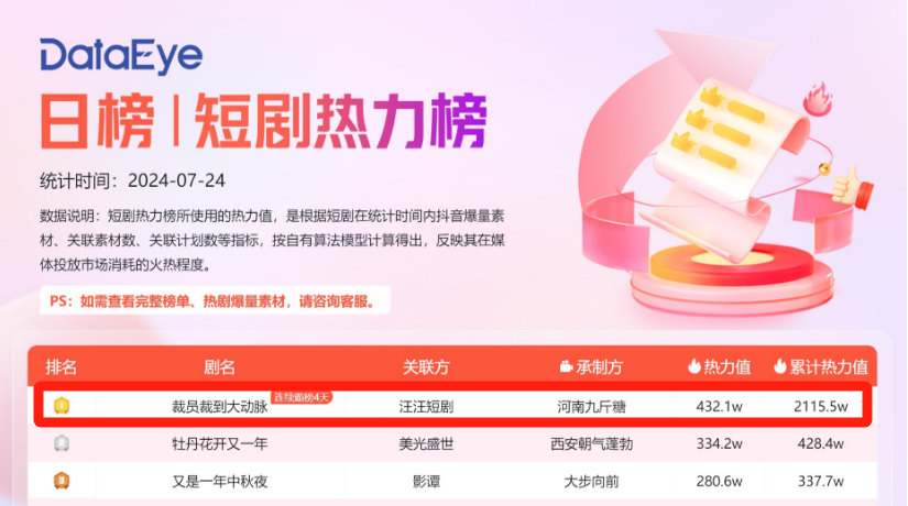 近日,有一部职场题材的短剧连续4天登顶DataEye短剧热力榜。![]() 值得关注的是,这部热播短剧出自一家新面孔——汪汪短剧。 今年来,国内短剧市场竞争趋于白热化,头部企业开始占据半数市场份额。DataEye短剧热力榜TOP10,基本是头部平台的天下,很少能看到新面孔。 DataEye短剧观察独家获悉,截至目前,《裁员裁到大动脉》整体消耗在2000万左右,单日充值突破500多万。 对于一家新兴平台来说,一部作品上线4天消耗2000万,这个成绩可圈可点。 汪汪短剧是怎么脱颖而出的? 汪汪短剧三位创始人分别拥有互联网、影视、营销三个领域的工作经验。创始团队的复合背景,也使得汪汪短剧的发展路线不同于传统短剧公司。 近日,DataEye短剧观察专访了汪汪短剧创始人韩艳成,就市场现状、内容制作等方面进一步剖析短剧行业现状。 以下是采访实录整理: 一、关于汪汪短剧新剧表现 DataEye短剧观察:这部剧整体消耗情况?对于该剧的表现还满意吗? 韩艳成:这部剧整体消耗在2000万左右,还在持续增长中,单日充值突破500多万。 对于这样的成果确实出乎意料,但我们对该剧的表现不算太满意。因为是新题材的尝试,在整体投资上会略有控制,直接会影响最终的拍摄质量,我们将持续提升制作水平,争取越做越好。 DataEye短剧观察:这部剧为什么能快速起量?在您看来,一部短剧能否爆火,剧本、导演、制作、演员、投流等因素,各占多少比例? 韩艳成:快速起量的关键因素我觉得是题材,因为目前整个行业题材多元化,短剧前期的核心聚焦点在于爽点,让人欲罢不能,当前逐渐趋于创新、结合社会热点、精细化创作等,投流我觉得每个公司都差不多,主要根据市场数据和消费者反馈来调整和优化我们的推广策略。 一部短剧能否爆火我个人觉得,主要是题材的去重化,在当下阶段能否与其他剧做出一些差异,符合逐渐趋于冷静的消费者心理,再结合导演的专业性、演员的演技、投放的快速响应和勤劳等因素。至于占比,我觉得一部好剧的成功在于把握时机,前面说的阶段差异,近期流行什么,是否要跟风取决于每个公司的部署和题材的储备。我个人认为,一个好的、新颖的题材占比在50%,导演与演员的专业性占比30%,投流和剪辑占比20%。 DataEye短剧观察:这部剧成功捕捉了职场热点话题,编剧团队是如何洞察到这一现象,并决定将其作为短剧题材的? 韩艳成:每个公司的题材规划,我认为有相通之处,也有各自的特色。当然我们公司也差不多,比如当下流行题材的延伸、性转版创新、差异题材的创作等。 《裁员裁到大动脉》作为我们公司的重点项目,就是结合了当前的社会环境,通过真实的故事情节,让观众产生共鸣,唤起他们对现实的思考和对当下的珍惜。 DataEye短剧观察:编剧在构思这部剧时,有哪些特别的考虑或挑战? 韩艳成:编剧在构思本剧的时候主要考虑到时下的经济环境、就业问题以及近几年出现的地产危机、大厂“毕业”等涉及民生的话题,最大的挑战就是不确定这种课题能否会引起共鸣以及过审。 DataEye短剧观察:这部剧拍摄周期多长?拍摄成本大概多少? 韩艳成:拍摄周期3天,拍摄成本在23万左右。 DataEye短剧观察:为什么选择制作仅30集的短剧?这是出于成本控制的考虑吗? 韩艳成:30集的短剧可以更快节奏的构建完整的故事线,并且可以更多的充实受众的碎片化时间,从成本到周期上可以实现高效运转。 二、市场现状及趋势 DataEye短剧观察:今年短剧行业发生了哪些变化?目前短剧行业处于一个什么样的阶段? 韩艳成:今年短剧行业最大的变化点就是短剧走向精品化,随着竞争的加剧,要求各方必须要不断提升自己产品品质才能赢得市场,赢得口碑。 目前短剧市场还处于发展阶段,短剧渠道的增加会让市场变得更加平稳,政策也在引导市场的有序竞争,未来依旧可期! DataEye短剧观察:您所理解的短剧精品化是什么?怎样平衡好短剧质量与成本? 韩艳成:短剧精品化我个人的理解主要是:第一,内容精品化,第二,制作精良化,第三,演员专业化,第四,成片影视化。 对于汪汪短剧来讲,质量优先,成本辅助支持即可。 DataEye短剧观察:今年来,短剧在题材上出现了哪些新趋势?您认为还有哪些新题材值得尝试? 韩艳成:近年来短剧题材日趋多元化,各方下场也给短剧题材注入了新活力。 我们认为短剧带给观众的除了传统的爽点、情绪点之外,我们还希望能更多的去给观众提供正能量的情绪价值,所以我们会从民生及弱势群体关爱上进行尝试。 DataEye短剧观察:如何看待当下的短剧市场?新入局者如何脱颖而出? 韩艳成:短剧市场依然很广阔,我们对此持积极态度。 随着市场渠道的增加,IAP、IAA、IAAP及其他渠道的出现,将使整个短剧市场变得更加平稳和健康。未来短剧发展空间一定会是精品化市场,更多新题材、精品化或者影视化的涌现会使短剧产生更多的竞争,也在逐步提高短剧的口碑,我们希望短剧不仅仅给观众带来爽点等,也希望短剧可以真的传播对社会、对观众有价值的正能量。 其实汪汪短剧也是刚起步,没什么资格去做出评判,从我们自身发展这一路走来,我只能是分享给大家:坚持内容创作,把握剧本品质,提高作品质量,合理布局公司业务板块,真诚对待每一个合作伙伴,合作共赢未来! 三、关于汪汪短剧 DataEye短剧观察:公司是何时决定进入短剧市场的?团队核心成员是什么背景?目前团队有多少人? 韩艳成:汪