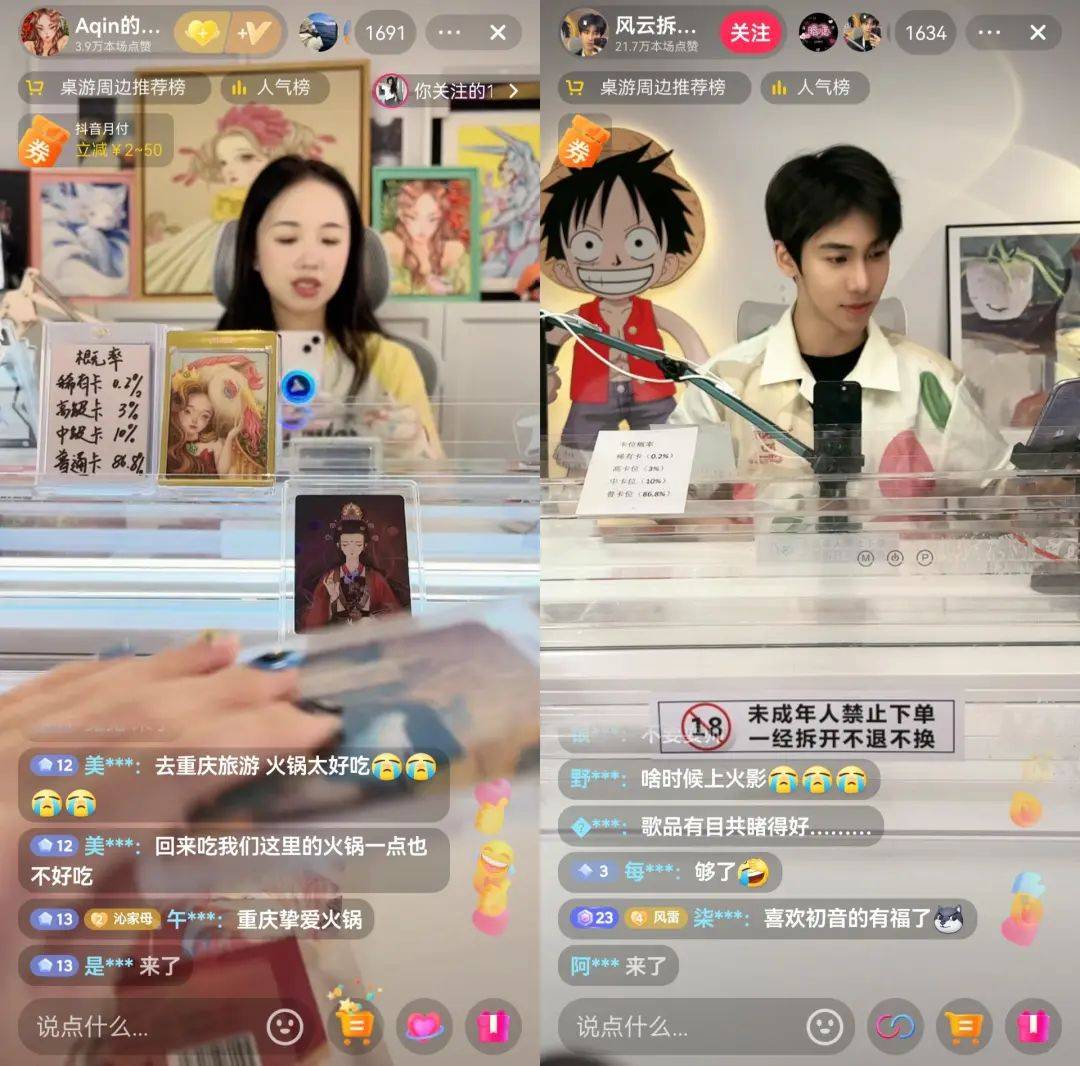 文|王崭 “没自制力的千万别碰!”“家人们谁懂,一个月花了两万多……”“不要碰拆卡直播,会变得不幸!” 社交平台上,关于“拆卡”的讨论越来越多。有人调侃“一代人有一代人的破烂”:“80后”“90后”收集水浒卡、三国卡,“00后”收集小马宝莉卡、奥特曼卡。 不知不觉间,曾经被称为小学生社交货币的卡牌,一跃成为泡泡玛特后的Z世代“顶流”。不同IP的卡牌借助着直播间快速走红,让成百上千的观众“上头”,有人一晚上就花几千上万元让主播“代拆”,有人把直播间当成助眠直播间,还有人成了拆卡主播的粉丝…… ![]() 一张小卡片,给直播间带来百万销售额,也让背后的卡牌公司飞速成长。 仅2024年上半年,卡牌公司卡游在抖音的销售额就达到2.78亿元,仅次于潮玩巨头泡泡玛特,而2023年全年,卡游在抖音的销售额不过8000多万元。 当财富神话出现在拆卡直播间,无数嗅到财富气息的玩家纷纷入局。 “很多人都想分一杯羹。”陈豪在今年4月做起拆卡直播间,在他看来,拆卡直播间低门槛、来钱快。在各个社交平台和副业群里,无数人称拆卡直播间是“2024年暴利赛道”,花上2万—3万元就能做起来,利润率高达30%—40%。 抖音、小红书和淘宝等社交平台和电商平台上,涌现了一个又一个拆卡直播间,就连曾经的偶像丁泽仁,初代头部网红阿沁,小演员黄梓颀,也顶着“风云拆卡”“aqin的拆卡日记”“九欧拆卡”的名字开启拆卡直播。 年轻人再次养大一个圈子,也让直播间有了新的故事。只是,这场追逐财富神话的游戏中,主播更像参与的玩家,有的赢,有的输,真正能在这场游戏中稳赚不赔的,是幕后拿着筹码的庄家。 01、两万元,做出百万生意? “恭喜老板!71/188编!” 凌晨两点,苏苏的直播间还有近一百位观众在线。她拆开几包卡牌,熟练地过着一张张卡片,随后惊喜地按响桌上的按铃,恭喜下单的老板抽中一张限量编号卡,弹幕也齐刷刷地刷起“恭喜老板!”“老板太欧了!”“蹭蹭好运!” 这是一个典型的拆卡直播间。 拆卡直播间的小黄车链接中,价格低的卡片几元一包,价格高的“端盒”“端箱”上千上万元。直播间的流量巅峰在晚上,直播到凌晨两三点是常态,主播在直播间拆着卡片版盲盒,说着各种“黑话”,“编”指的是编号卡牌;“71/188”的意思就是这种独特的卡牌一共生产了188张,这张卡是第71张;“奶一口”指的是主播额外送一包;“端箱/抬箱”指的是顾客直接下单拆一箱卡牌…… ![]() 拆卡直播间的设置 和复杂难懂的黑话不同,拆卡直播间的设置堪称“简陋”:一个“未成年禁止下单”的小告示牌,一个摆着各种卡牌的透明亚克力置物架,一张桌子,一把剪刀,一部手机,镜头对准主播的手和桌面。 小红书、抖音等社交平台上,有不少主播分享自己花两万元、三万元或者五万元打造拆卡直播间的经验。 “当初我搭直播间,就花了几千块。”苏苏是个人拆卡主播,投入小,门槛低,是她入行的一大原因。经营着直播公司的陈豪也透露,“搭一个拆卡直播间,各种设备算上可能就花了一万多元”。 表面看似“低门槛”的拆卡直播生意,实际上却有着不低的隐形门槛。 “最开始至少要备五六箱货。”陈豪透露,直播间早期需要靠用户体量大的卡牌吸引流量,进货也要选卡游、集卡社和卡宝文创等大厂的热门IP卡牌,“小马宝莉,三丽鸥,第五人格,都是早期能带动直播间流量的卡牌”。 拆卡主播Kiki也表示,直播间启动至少需要准备五六个IP的卡牌,每个IP至少一箱,“要是流量好,一天拆一箱是常态,进货少,那第二天就没卡能拆了,卡游的进货价是零售价的五五折,一箱便宜的卡牌要1500元左右,贵的要4000元左右”。 多位受访拆卡直播从业者都表示,早期备货就需要花费2万—4万元,并且平台存在一定的回款周期,后期还需要不断投入备货资金,需要10万元左右的流动资金。看中低门槛入局的苏苏,不知不觉中就花了近4万元做拆卡直播,陈豪的两个拆卡直播间,半个月就投入了近17万元。 ![]() 但这样高昂的隐形门槛,依旧没有阻挡众多新玩家,最大的原因,就是利益。 蝉妈妈数据显示,近30天,九欧拆卡、烧鸡拆卡、七夜拆卡社和六小雯·拆卡等多个拆卡账号的直播间销售额在100万—250万元。头部拆卡主播“九欧拆卡”,仅2024年上半年在抖音的销售额就达到了1000万—2500万元,这一成绩堪比腰部带货主播。 有人称拆卡直播的毛利动辄能达到40%—50%,净利润也有30%。而卡牌行业的头部公司卡游在今年1月向港交所递交招股书,招股书显示,卡游在2021年、2022年、2023年前三季度,集换式卡牌的毛利分别为59.5%、69.9%、71.2%。 低门槛,高收益,诱惑着众多想要进入或者已经进入拆卡直播行业的玩家,拆卡直播教程在社交平台上传播,一个个拆卡直播间涌现在社交平台和电商平台上。 02、“疯狂”的卡牌,快速破圈 陈豪做过秀场直播,也在义乌干过直播电商。 早在2020年,他就在抖音做过拆卡直播,但不到一个月就宣告失败,“早期的卡牌大多还是球星卡,男性消费者比较多,商家很多都有自己的私域,要不是QQ群、微信群,要不是贴吧、卡淘APP。抖音上也有人做,但市场小,竞争激烈,球星卡的进货价格门槛也比较高,做起来很难”。 ![]() 彼时,卡牌是小圈层的小众文化,虽然已经有了一定受众,有着一级市场和二级市场,但整体仍处于萌芽阶段,用户教育不足。 陈豪感受到变化,是在2022年—2023年。 2022年,