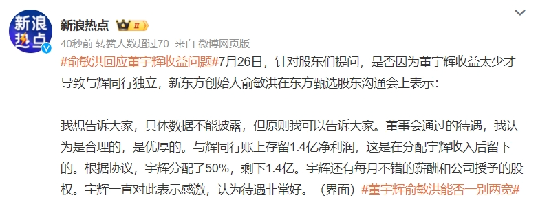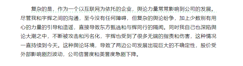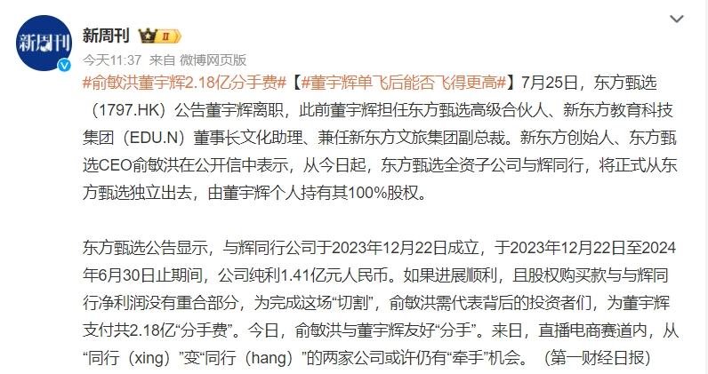 俞敏洪尝到了“流量的毒”。 作者 | 郝闻 编辑 | 趣解商业消费组 7月26日下午,在东方甄选官宣董宇辉离职的第二天,俞敏洪亲自举行了一场股东沟通会。会上,对于董宇辉的离开,俞敏洪表示自己和董宇辉还是忘年交,只可惜这个“世界并不是我们两个人的世界”;这番诚恳的言论为这场分析增加了满满的“BE色彩”。 ![]() 图源:微博截图 自从去年“小作文事件”发酵之后,董宇辉的离开似乎已经只是时间问题,这次的官宣是情理之中,更是意料之内。 问题是,剥离了董宇辉的东方甄选未来如何前行,而离开东方甄选的董宇辉又能红火多久呢? 01.分手应该“体面” 7月25日,东方甄选控股有限公司(东方甄选,01797.HK)发布公告称,董宇辉已决定不再担任公司雇员及公司一个合并联属实体的高级管理层,该离任乃由于董宇辉的职业抱负、对彼其他事业的投入及个人时间安排,于当天生效。 东方甄选还公告称,董宇辉(买方)、北京新东方迅程网络科技有限公司(卖方)及与辉同行(北京)科技有限公司(目标公司)订立出售协议。据此,卖方同意出售,而买方同意收购目标公司的100%股权,代价为7658.55万元。 ![]() 图源:微博截图 比起这份略显冰冷的声明,俞敏洪在自己公众号老俞闲话写的《致东方甄选股东朋友的一封公开信》中关于董宇辉的单飞就充满领导者与大功臣之间充满无奈的“BE色彩”了。 俞敏洪提到“被网友定义为“小作文事件”的突然爆发,让人措手不及,暴露出了诸多问题,我和宇辉陷入了尴尬的境地,公司也陷入了动荡之中。” 可见“小作文”事件让不论是公司治理还是两人之间的关系都产生了裂痕。而“小作文”之后,许多声音也开始纷纷猜测董宇辉单飞的可能性了。 一位董宇辉直播间的消费者就提到,“支持董宇辉的直播间其实和整个新东方转型有莫大的关系,这个过程中,作为消费者我们看到企业的艰难和对于直播的用心。但是‘小作文’事件之后,接连暴露出了整个企业的问题,也会影响品牌在消费者心里的形象,直接就从一个‘田园风’的直播间变成‘甄嬛传’了,观感非常不好。当时我就在和朋友讨论,董宇辉估计是待不住了。” 实际上,俞敏洪自己似乎也意识到了公司管理中的问题,他说,“舆论力量常常影响到公司的发展。尽管我和宇辉之间的沟通,至今没有任何障碍,但复杂的舆论纷争,加上少数别有用心的力量的引导和造谣,直接导致东方甄选和与辉同行的隔阂。”甚至表示,自己作为老板都“不敢”出现在董宇辉的直播间。 ![]() 图源:公众号截图 “小作文事件”背后也反映出除了公司治理上引起的员工心理的不平衡之外,更反映出了在紧急事件面前,东方甄选团队并不令人满意的公关对策。 整个事情发酵之后,东方甄选似乎有种听之任之的感觉,当时的CEO孙东旭的发言更是让网友们锐评“上网买东西然后被‘爹味’领导开了一场会”,可见当时整个团队对于事态的发展以及如何做出更抓得住人心的回应都好像没什么深入探讨。事件最后以孙东旭的离职草草收场,也并没有“爽文男主”的感觉,反而是让人觉得像是公司内讧严重,孙东旭被当成“弃子”,董宇辉也“受尽委屈”,是个双输结局。 就好似这次董宇辉的离开,面对铺天盖地的热度,东方甄选除了冰冷的公告也没什么太多回应,只有俞敏洪的文字中有体面和不舍。 02.“海水”与“火焰” 董宇辉和东方甄选的分手后,两者的境遇可谓是“一半是海水,一半是火焰”。 一边是东方甄选暴跌的股价。截止到北京时间7月26日收盘,东方甄选(1797.HK)股价已经下跌到了9.5港元/股,跌幅达到23.39%,总市值跌到了100亿港币之下。 ![]() 图源:百度股市通截图 另一边,与辉同行账号一晚上狂涨了十万多粉丝,与辉同行抖音账号的粉丝数已经达到了2167.8万人。就在今天中午,与辉同行抖音账号还在热热闹闹的进行直播,观看人数超过4万人,粉丝们都在直播间留言道“恭喜与辉同行”“支持与辉同行”“与辉同行长虹”...... ![]() 图源:抖音截图 东方甄选股价的下跌和董宇辉之于东方甄选的重要性是有决定关系的。 2022年6月,董宇辉爆火,之后董宇辉对东方甄选的贡献虽然难以量化,但可以从几个数据维度就对比。 二级市场上,东方甄选的股价从2022年6月开始暴涨,一路从3.7港元/股暴涨到最高的75.7港元/股,市值直接翻了20多倍;到了2023年,东方甄选股价开始回弹,一直到去年底“小作文事件”之后,股价开始呈现强下滑趋势。 ![]() 图源:百度股市通截图 据海通国际证券统计,2022年8-12月,董宇辉对于东方甄选的观看次数、GMV的提升均有明显的带动作用。到2023年3月,董宇辉的直播日观看人次均值为950万,增长31.6%,GMV均值为1745万,增长率为35.8%。 不仅如此,如果去看东方甄选2023年的年报,可以发现,2022年东方甄选营收6亿元的时候,销售费用有2.7亿元,占比45%,也就是说公司赚的每一块钱都是用将近5毛钱的广告和促销折扣换来的。到了2023年,东方甄选营收达到45.1亿元,同比增长了652%,而其销售费用仅有6.2亿元,同比增长130%,占总营收只有13.7%。这说明,董宇辉的爆红给东方甄选带来了极大的自然流量,这不仅增加了其营收,更节省了其对于流量投入的费用。 ![]() 图片来源:财报截图 类似的现象在瑞幸咖啡也发生过,推出了生椰拿铁之后瑞幸的营销费用占比从超过80%的程度下降到了个位数,这就是实至名归的爆款。所以可以说董