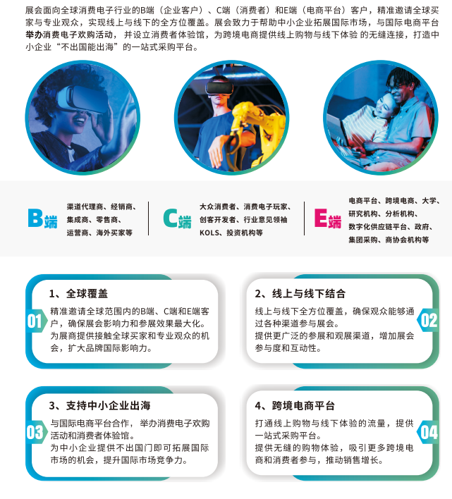 2024年11月28日-30日,由深圳会展中心管理有限责任公司和深圳市平板显示行业协会主办的全球首个融通产业链、消费链和生态链的国际性消费电子盛会——2024世界消费电子展(World Consumer Electronics Expo,中文简称“消电展”,英文简称CEE)即将在深圳会展中心(福田)盛大开幕。 展会以“智创未来,联动世界”为主题,聚焦人工智能引领下的最新应用和场景创新,涵盖智能网联汽车、低空经济和人形机器人等前沿领域,将联合全球消费电子制造商、采购商、销售商、电商平台和行业组织,共同迎接人工智能新时代的机遇和挑战,引领消费电子科技新纪元。 展会亮点: 本届展会聚焦人工智能引领下的最新应用和场景创新,涵盖智能车、低空经济、人形机器人等前沿行业热点,汇聚全球最新技术和产品,掀起一场消费电子科技的新革命。深圳作为中国窗口城市之一,世界消费电子展将实现“不出国就能出海”的目标。展会为企业开拓国际市场、寻找海外合作伙伴提供了绝佳平台,助力企业提升全球贸易新高度。 展会将面向国内外专业观众和买家,同时结合西方“黑五”消费季举办线上线下全球消费电子欢购节。参展企业将快速获得市场反馈,验证产品市场接受度,并能及时调整产品策略。通过精准邀约全球买家、分销商、代理商和专业观众,帮助参展企业迅速提升品牌知名度,开拓国内外市场销路,助力企业实现品牌价值最大化。展会将整合消费电子产业链、消费链、金融链和人才链资源,帮助展商优化供应链,寻找新商机,构建全球消费电子新生态圈。 展会期间将举办国际技术热点主题论坛、高端圈层交流、超级新品发布会、采购对接会和创新技术评奖活动。我们为企业搭建起与行业同仁、上下游供应商及研发机构之间的交流桥梁,进一步促进商贸合作和交易。 加入世界消费电子展,不仅是一个展示创新和技术的平台,更是一个连接全球市场的桥梁。期待与您相约深圳,共同迎接智能科技的新时代!