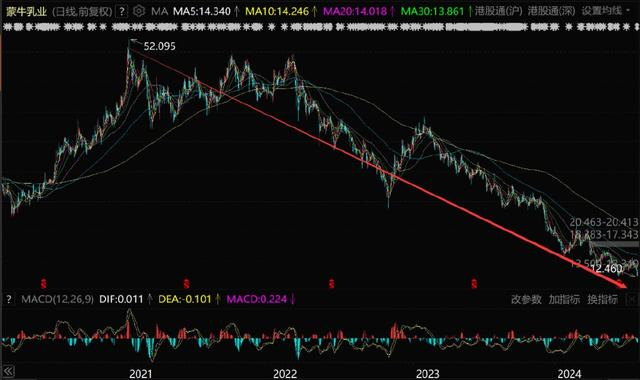 蒙牛股价自2021年1月的历史峰值52.095港元跌至当前的不足13港元,三年内跌幅惊人,高达75%以上。