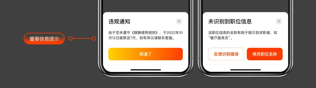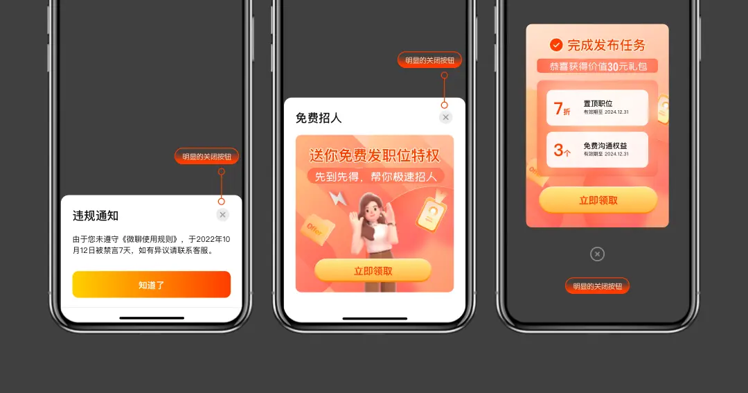 在APP应用的广阔领域中,尽管弹窗看似微不足道,但它在优化用户体验上肩负重任。凭借其直截了当且引人注目的特质,弹窗设计能即时抓住用户的视线,成为强化用户体验的关键策略。 伴随AI技术的迅猛发展与广泛渗透,设计行业正遭遇前所未有的转型。 ![]() APP弹窗是一种流行的用户界面元素 用于在不干扰用户当前操作的情况下,提供信息、请求用户反馈或引导用户进行特定操作。 ![]() 场景一:用户在执行某些特定任务操作时,向用户展示重要信息、通知或警告。 ![]() 场景二:用户在退订某些重要功能时,向用户展示二次确认弹窗,用于重要操作的操作确认。 ![]() 场景三:用户在执行某种操作过程中,由于无法继续任务向用户展示认证状态和信息指引,引导用户进行相关认证。 ![]() 场景四:在某些特定需要获取用户相关决策的场景下,引导用户完成具体任务的选择。 ![]() 场景五:平台进行某种活动促销,在特定的场景下向用户展示营销内容,引导用户参与平台活动。 ![]() 场景六:用户购买产品需要进行支付时,向B端用户展示支付相关的明细与路径。 ![]() ![]() 在B端APP中,弹窗设计时需要考虑内容的视觉层次、内容的多少、品牌一致性以及不同设备的屏幕尺寸适配,以确保良好的用户体验。 1. 尺寸限制为保证内容可读性和操作便利性,弹窗应有最大最小尺寸限制,以保障平台体验的一致性。以招聘B的弹窗规范为例,根据弹窗样式分别进行规范,如: ![]() 2. 边距和间距弹窗内容与弹窗边缘应保持适当的边距,通常建议至少16像素的边距,以确保弹窗内容不会被屏幕边缘遮挡。 ![]() 弹窗的高度适配弹窗高度应能够根据内容的多少动态调整大小,确保尽可能多的内容可以在弹窗内完整显示。减少滑动操作路径,提升浏览效率。 弹窗的宽度适配同一平台的弹窗宽度应该保持一致,以便保证整个平台体验的一致性。 ![]() APP弹窗设计中的文字、按钮和图标布局是确保用户界面清晰、直观且易于使用的关键。首先弹窗中的元素应与APP的整体设计风格保持一致,包括字体、颜色和图标风格。 以此来保证整个APP的视觉一致性。其次,确保弹窗中的文字、按钮和图标具有清晰的视觉层次,让用户能够快速理解信息的重要性和操作的先后顺序。 1. 间距各元素之间应有足够的间距,以避免拥挤感,确保每个元素都容易被识别和点击。 ![]() 2. 按钮位置·将主要操作的按钮放在用户期望的位置,通常是弹窗的底部或靠近内容的右侧。·提供明显的关闭按钮,通常位于弹窗的顶部右上角,让用户可以轻松关闭弹窗。 按钮应按照逻辑顺序排列,如“确定”和“取消”通常并排显示,且“取消”在左侧。 ![]() 3. 突出重点使用大小、颜色和加粗等手段突出显示最重要的信息或操作按钮。 ![]() 随着业务的发展,为了满足各种业务场景在站内的触达及转化效果,产品运营侧持续在迭代新的不同的规格,不同交互形式的弹窗控件,数量越来越多。 在这种背景下,避免弹窗对用户操作的干扰是提升用户体验的关键。需要多个方向共同努力。 第一,弹窗必须要提供明显的关闭按钮,让用户可以快速关闭不需要的弹窗,最大程度减少弹窗对用户的影响。 ![]() 第二,根据实际场景需要,对不需要用户即刻反馈的信息提示内容类弹窗,可以设置其在一定时间后自动消失,减少对用户的持续干扰。 第三,弹窗内容简洁明了,对文字语义表达尽量简单直白。降低理解成本,让用户快速获得关键信息。 ![]() 第四,平台整体管控,合理权衡利弊,避免过度使用弹窗,否则容易造成负面的品牌形象。 最后,引入AI合理使用。利用AI分析用户行为并进行学习,合理预测用户的行为习惯。弹窗只在最恰当的的时机出现。最大程度降低干扰。 ![]() 随着AI技术的不断进步,B端APP弹窗设计正经历着持续的演进,以便更好地满足用户的需求和期待。 比如将AI智能助手融入商业产品中,从而在业务流程中提供智能化的决策辅助与任务自动化解决方案。 同时,我们可以挖掘创造新颖且引人入胜的交互方式与功能,以提升用户体验。如: ![]() 场景一:招聘B端智能推荐弹窗利用AI分析B端的职位发布频率、浏览的简历类型、搜索关键词、沟通记录等,形成一个B端用户的招聘需求、偏好等信息。 当B端用户在平台上进行职位管理或简历搜索时,AI助手可以通过弹窗推荐相关度高的求职者给B端。提升B端招聘的效率和准确率。让用户体验想什么来什么的魔力。 场景二:招聘B端个性化问候弹窗利用AI收集B端在平台上的活动数据,如登陆频率、常用功能、职位发布情况。位置信息如城市。时间天气等数据。通过巧妙的弹窗交互,向用户传递个性化的关怀与提示。 例如:在一个寒冷的冬日早晨,B端用户首次登陆,AI助手可以问候“早上好,李经理!冬日寒冷,记得保暖。愿您今天心情愉快,工作顺利。为您推荐了几位优秀的物流专员,希望对您有帮助。”这种人性化的互动让B端用户体验更为温暖与周到。 ![]() 当然,融合Ai技术的弹窗互动蕴藏着无限可能,它能巧妙地适应并提升各类B端业务的特定场景体验,等待我们一起探索,共同创造更优质的服务体验。 ![]() B端APP弹窗正在经历一场革新,这不仅提升了它的智能化水平,还赋予了其高度的个性化能力。 这种创新设计旨在优化用户体验,使之更为细腻入微,同时灵活应对日新月异的市场期待。 通过AI的介入,弹窗不仅能更