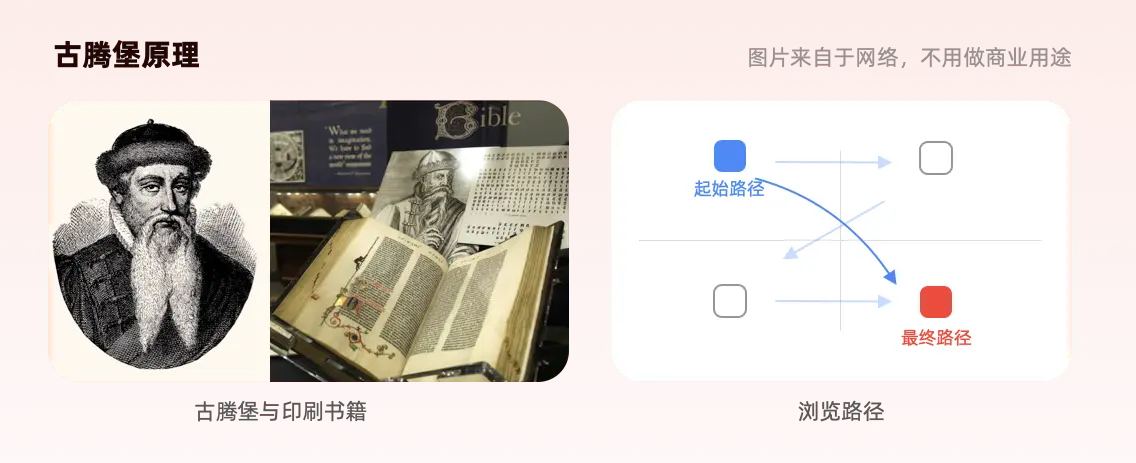 在当今快节奏的数字时代,用户的注意力成为了最宝贵的资源。PC端的首屏设计,作为用户与网站或应用交互的第一站,其重要性不言而喻。它不仅定义了用户对品牌的第一印象,更是决定用户是否愿意深入探索的关键。首屏的设计质量直接影响着用户的停留时间、参与度以及最终的转化率。因此,深入理解并有效运用设计原则,对于实现首屏流量的最优分发至关重要。 本文将带你走进PC端首屏设计的深层逻辑,从古腾堡原理的视觉流动讲起,探讨如何通过科学的布局和视觉引导,构建出既符合用户直觉又能促进用户行为的有效界面。我们将分析不同的布局模式,如瀑布流、左右布局以及井字布局,每一种都有其独特的优势和适用场景。同时,我们也将探讨如何通过动效、色彩和文案等设计元素,进一步引导用户的注意力和行为,以实现流量的高效分发和业务目标的最大化。 一、古腾堡原理——流量与视觉动线的基础 古腾堡原理(Gutenberg Principle),又称为“古腾堡图表”,是排版设计中的一个重要概念。 这个原理是以15世纪德国发明家约翰内斯·古腾堡(Johannes Gutenberg)的名字命名的,他发明了活字印刷术,对印刷和排版设计产生了深远的影响。 古腾堡原理的核心内容:
