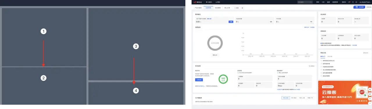 ![]() 2)适用场景: 上下布局的流量自上而下逐步衰弱,适用于企业官网、单页应用、新闻网站和在线教育平台等,信息有层次,有递减的,信息内容相对结构化又完整的门户网站。这种布局有助于用户快速找到所需信息,提升用户体验和浏览效率,如阿里巴巴官网和网易云课堂。 样式1——整体视觉动线从上往下 ![]() 对流量分发的影响: 流量按照优先级逐步递减 例如:百度云的门户首页将品牌LOGO、主要功能入口、登录注册按钮和引导用户点击的banner放在页面上部,确保用户进入后首先看到这些重要内容,提升关键功能的访问率。次要内容则放在页面下部,引导用户在完成主要任务后继续浏览,确保重要内容优先传达,同时保证各功能区域有合理的访问量。 上方的门户首页也是如此,按照内容优先级呈现,最重要的内容和服务被放在首页最显眼的位置,确保用户首先看到并点击,随着用户滚动页面,次要内容和功能按照优先级依次展示,确保核心内容获得最大的流量。 样式2——整体视觉两个区域从上往下 ![]() 对流量分发的影响: 这种方式布局利用页面的垂直空间,适合展示较多内容和信息,同时给用户多个信息内容,用户可以快速选择想要的信息,不易错过关键信息。然而,这种布局可能需要用户频繁滚动页面,影响整体浏览体验和信息的一致性。 如京东云,同时展示相对较为重要的“费用概括”和“待办事项”模块,用户可以根据自己所需快速流量对应的内容。相对上一张“从上往下”的布局结构,这种结构能在流量较高的区域满足用户更多的场景。 样式3——内容区域呈井字形宫格块,视觉动线类似“Z”字型走向 ![]() 对流量分发的影响: 散点式的传递信息,给用户传递更多的信息模块。对于网页布局而言,Z字形布局利用用户习惯的视觉阅读路径,有助于引导用户自然浏览页面内容。然而,不考虑视觉焦点时,Z字形布局可能导致信息层次混淆,使得某些重要内容难以突出,影响用户获取信息的效率。 例如抖音的学习中心的内容布局,整体大模块的划分按照优先级从上到下,而每个大模块又切分成多个小模块,这些小模块的视觉顺序从左到右,这些布局方式都顺应了用户的浏览习惯。重要信息通过特殊样式(色块)来突出,比如中间的banner。 对公CRM系统的聚合页也是利用Z字型的视线来阅读,信息分布比较均匀。 2、左右布局1)布局特点与适用场景: