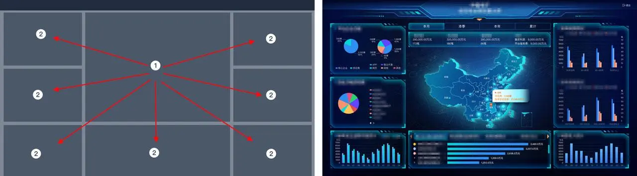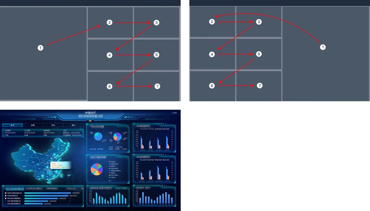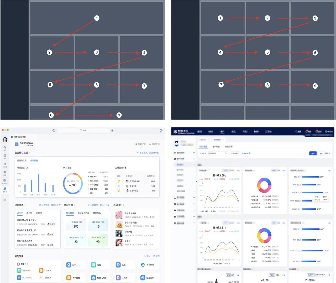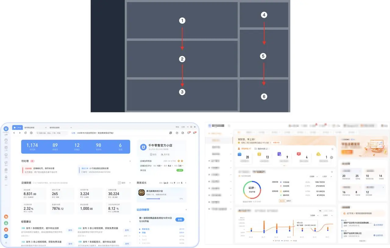 ![]() 另外,跟左右布局类似的,对于内容复杂、层级较多的系统,常常会顶部导航+侧边导航的”T型“布局。全局导航栏位于页面顶部,包含所有主要功能入口和子菜单。页面主体部分分为侧边栏和主内容区,侧边栏通常包含次级导航或功能入口,主内容区展示详细内容或主要操作界面。全局导航、侧边导航、主内容区明确分工,信息层次分明。 ![]() 2)适用场景: 这种布局比较适用于一些业务逻辑和场景简单管理后台,比较常规的布局,视线从左往左,从上往下。一般适用于B端金融平台数据类、功能操作后台、电商商品类展示。 样式1——整体视觉动线从上往下 ![]() 对于流量分发的影响: 重要信息优先展示:例如微信的管理后台,将用户关注的数据信息优先放在头屏,使用户在进入页面后首先看到这些内容,提高关键功能的访问率。确保这些区域获得更多流量。 较次要的信息和功能放在页面下部,用户在处理完主要任务后可以继续浏览次要内容,确保重要内容的优先传达。确保不同功能区域均有合理的访问量。 样式2——整体视觉氛围两个区域从上往下 ![]() 对于流量分发的影响: 根据谷腾堡原理分析,左侧大区域优先级>右侧区域,大区域关注度优先级>小区域,视觉动线先从左侧区域往下流量,再从右侧区域往下浏览。一般根据内容重要层次依次先从左侧从上往下布局,再从右侧从上往下布局。确保重要信息优先被关注。 例如在千牛后台,最重要的订单数量被放在左侧,并占据较大的区域,紧接着是待处理违规和店铺营收情况等较重要的信息。右侧的小区域则显示次要的商家个人信息。 大资金系统的首页也是如此,重要的数据依次先从左侧从上往下布局,再从右侧从上往下布局。确保重要内容优先被关注。 样式3——内容区域呈井字形宫格块,视觉动线类似“Z”字型走向 ![]() 对于流量分发的影响点: 1)提高页面清晰度:井字型布局将页面划分为多个区域,每个区域都有明确的功能和内容,使得页面结构清晰,易于用户理解和导航。从而可能提高用户在页面上的停留时间,增加页面的流量。 2)增强模块化:清晰的模块和分类可以帮助用户更快地找到他们感兴趣的内容,减少跳出率,增加页面的访问深度,进而影响流量分发。 例如飞书和对公CRM系统的页面,每个区域的功能和内容都非常明确,页面结构清晰,用户能够轻松理解和导航。这种设计有助于延长用户在页面上的停留时间,并增加页面的访问量。 3、井字布局(大屏应用)1)布局特点: 模块化设计:大屏布局通常采用结构清晰的模块化设计,将不同类型的信息和数据分成多个独立的模块展示,便于用户快速找到所需信息,同时支持灵活调整和扩展。 中心突出:通常将最重要或最关键的信息占据模块中的最大块,吸引用户的主要注意力。确保关键数据和信息首先被用户注意到,增强信息传递的有效性。 全屏显示:充分利用大屏的尺寸优势,采用全屏显示模式,减少边框和装饰,最大化展示内容,提供更广阔的视野,使用户能更全面地浏览和分析数据。 ![]() ![]() 样式1——视觉点在中心,视线从中间分散至四周 ![]() 对流量分发的影响: 1、中心突出:居中布局通常将最重要或最关键的信息放在屏幕中央,吸引用户的主要注意力,确保关键数据和信息首先被用户注意到,增强信息传递的有效性。 2、信息层次清晰:中心展示关键内容,周围展示详细信息和次要数据,形成明确的信息层次,用户能快速识别和理解重要信息,同时在需要时获取更多细节。 样式2——视线分为2大区域,先从左到右,再呈Z字形往下走 ![]() 对流量分发的影响: 1、双焦点引导:左右布局将用户视线引导至页面的两侧,使用户在浏览时注意力在左右两边切换,均衡展示多项重要信息,避免单一焦点信息过度集中,确保各关键数据得到关注。 2、增强信息对比:左右布局便于将相关信息并列展示,用户可以轻松进行对比分析,帮助用户更好地理解数据之间的关系和差异,提高信息的可视化效果。 3、明确信息层次:左右布局可以通过对称结构,将主要和次要信息分别展示在两侧,层次分明,用户能够快速识别和理解信息的重要性,提升信息传递效率。 三、流量引导的特殊样式 在布局和尺寸相同的情况下,还可以通过动效、色块、微文案来影响流量分发。动效通过动态视觉变化能更强烈地吸引用户注意力并有效引导用户行为;色块通过颜色对比突显重要信息,使用户快速识别关键内容;而微文案则提供补充说明,帮助用户理解和使用界面功能。因此特殊样式在流量引导排序中的优先级为:动效>大色块>小色块>微文案。 1、动效1)页面中强引导大动效 页面中的强引导大动效可以显著影响流量分发。这些动效吸引用户的注意力,推动他们优先关注特定内容或功能,从而有效引导流量向关键区域集聚。然而,如果使用不当,过于频繁或突兀的动效可能会分散用户的注意力,导致信息过载或用户体验下降,从而影响整体的流量分配效果。 ![]() ![]() 2)引导用户操作小动效 引导类动效就是通过动效的方式聚焦用户的视线,引导用户进入某一个流程的操作。在界面设计时,把最想让用户注意并操作的元素添加合适的动效,可以有效的提升该元素的点击转化率。 目的是助力业务达成指标,或者是促使用户跑通新功能。产品中常见的就是新手引导、新功能提示等。 ![]() 今日要闻消息内容以小动效形式提高