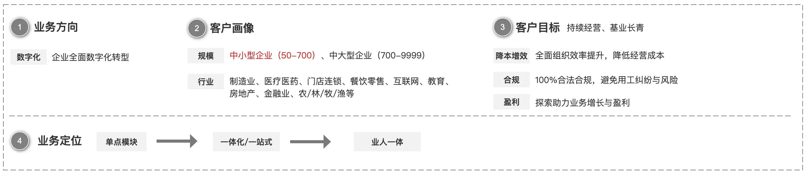 ![]() 第一步:业务定位:根据业务方向、客户画像和客户目标,明确业务定位 管理大师德鲁克说:“企业是社会的器官……任何企业得以生存,都是因为它满足了社会某个方面的需要,实现了某种特殊的社会目的。”换句话说,企业存在的目的就是为了解决社会问题,一个社会问题就是一个商业机会。 模糊的商业机会是业务方向,清晰的商业机会就是业务定位,而业务定位的本质是目标客群的需求与满足对应需求的产品或服务的匹配关系,而业务就是核心经营者围绕单一(或多个)商业机会所展开的经营活动。 所以在确定业务定位前,需先明确业务方向、客户画像和客户目标。 ![]() 以HR SaaS为例。业务方向是助力企业数字化转型,客户画像可从行业、规模和企业性质三个维度划分(比如聚集中大型企业(700人以上)或中小型企业(50-700人)、零售餐饮或制造业、门店连锁等) 企业目标都是追求创造客户,期望持续经营(甚至是基业长青),它主要包含三个方面:降本增效、合规、盈利。其中降本增效和合规是HR SaaS产品的基本预期,而盈利和增长则是提升竞争力的关键。 业务定位的提炼基于对业务方向、客户画像和客户目标的清晰理解。例如,在HR SaaS领域,不同的企业根据自身特点和市场需求,选择了不同的业务定位:
