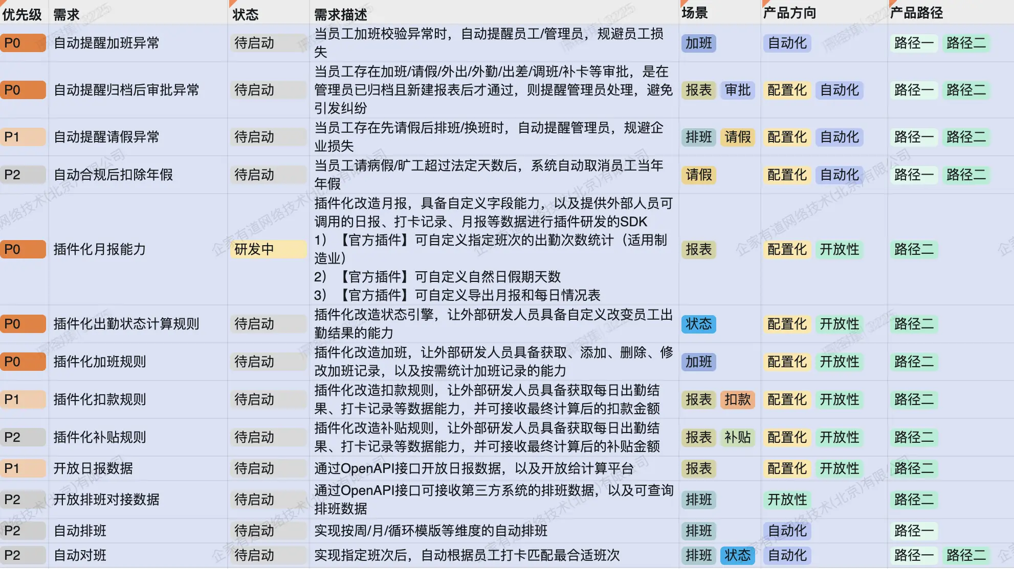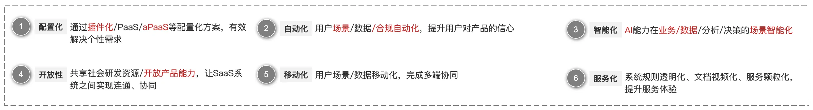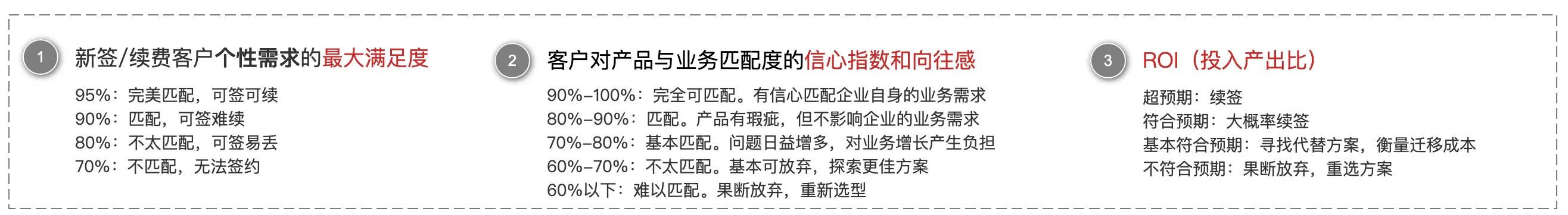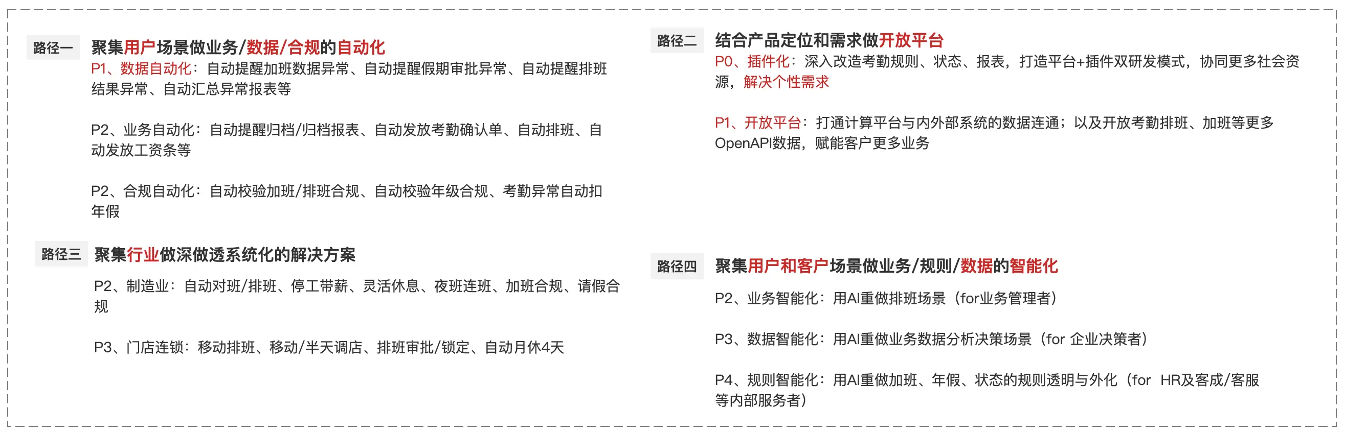 业务定位是确定市场机会,即客户需求与产品(或服务)供给的契合点。产品定位则是决定如何满足这种需求,即选择特定的方式来响应市场需求。 产品定位考虑三个维度:业务定位、客户向往感和竞争策略。 ![]() 以HR SaaS为例,关键词“HR、一体化、一站式、业人一体”反映业务定位,即提供全面、集成的人力资源管理服务。关键词“新一代、智能化、AI”表达客户对新技术趋势的向往,突出产品创新和技术优势。而“中大型企业、以XX为核心”是基于市场竞争的战略选择,明确目标客户群和产品核心功能,以区分于竞争对手。 所以北森是“一体化HR SaaS及人才管理平台”、“6000+中大型客户的选择”; i人事是“新一代一体化智能HR系统,业人一体HR SaaS+aPaaS+AI”; 薪人薪事是“新一代一体化HRSaaS智能系统”、“X-AIM战略性人力资源规划平台”; MoKa是招聘及人事管理一体化HR SaaS等。 第三步:产品决胜点:识别客户和行业痛点,确定产品决胜点 识别客户和行业的痛点,以及竞品情况,明确自身产品的决胜点。 ![]() 以HR SaaS为例,产品决胜点有三个: 第一,功能满足度。它要寻求最佳模式,最大化解决客户的个性需求; 第二,对产品的信心指数和向往感。它代表新签/续签客户对你产品的信心,以及你的产品是否让其具有向往感; 第三,ROI(投入产出比)。它是客户续签决策的关键,需衡量每年所花的订阅费,是否如预期取得了效果。 第四步:基于产品定位和产品决胜点,探索所有可能的产品方向 产品定位是目标,是期望,决胜点是核心问题,是关键,产品方向则是突破点。 ![]() 以HR SaaS为例,有六大产品方向: 方向一:配置化。根据用户需求,实现插件化/aPaaS升级。解决客户个性化需求,提升功能满足度; 方向二:自动化。基于用户场景、数据和合规要求,实现场景自动化。通过响应智能化,增强用户对产品的信心和向往; 方向三:智能化。结合用户和业务数据,升级智能化,自动分析、诊断,辅助决策,增强产品信心和向往; 方向四:开放性。连接客户上下游系统(如业务、运营、OA、财务、供应链等),促进数据和业务协同,实现业人一体化; 方向五:移动化。摒弃PC优先,实现多端协同,提升用户信任和向往; 方向六:服务化。透明化产品规则/逻辑,深化产品细节体验,视频化文档,内外兼修提升服务体验; 第五步:产品路径:从产品方向中,选择关键的产品路径 产品方向是突破点,产品路径则是实现路径和策略。 ![]() 以HR SaaS为例,至少有四条路径 路径一:聚集用户场景做业务/数据/合规的自动化。