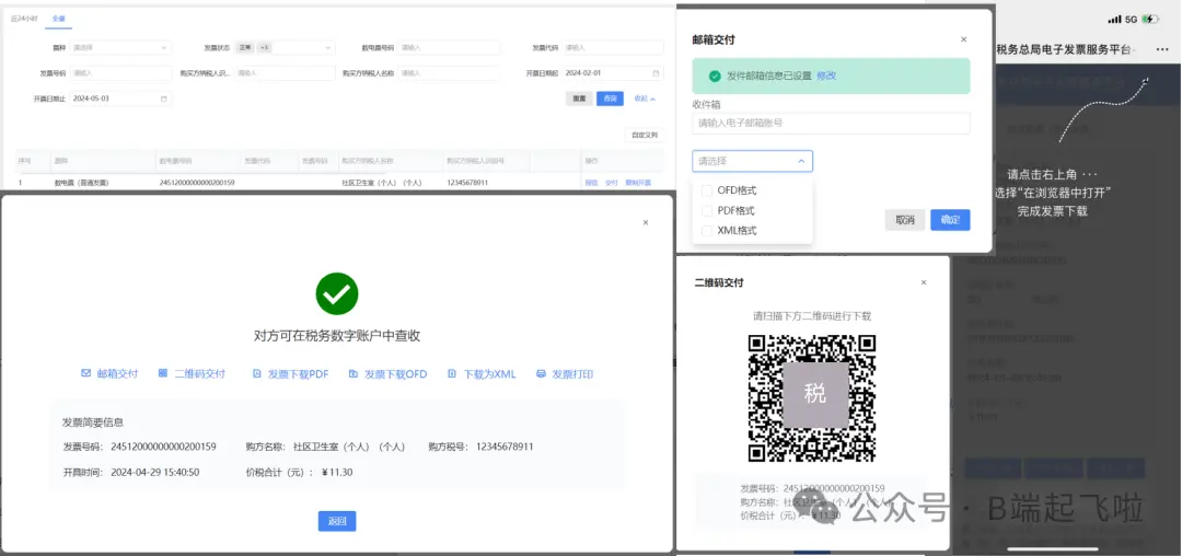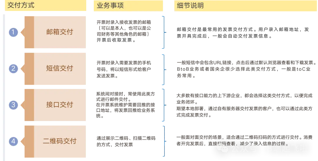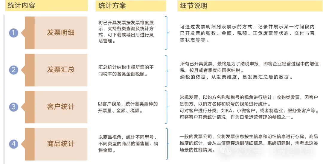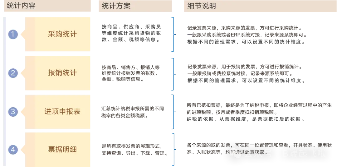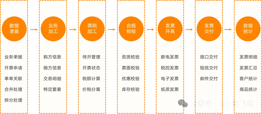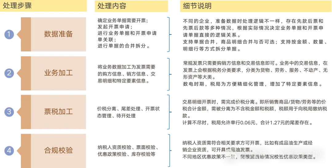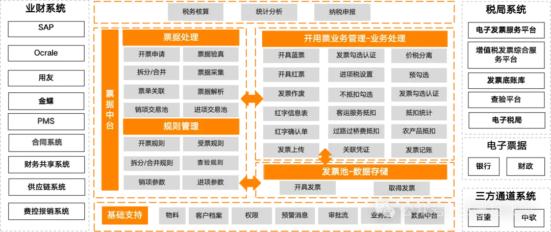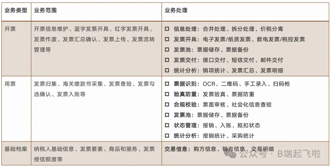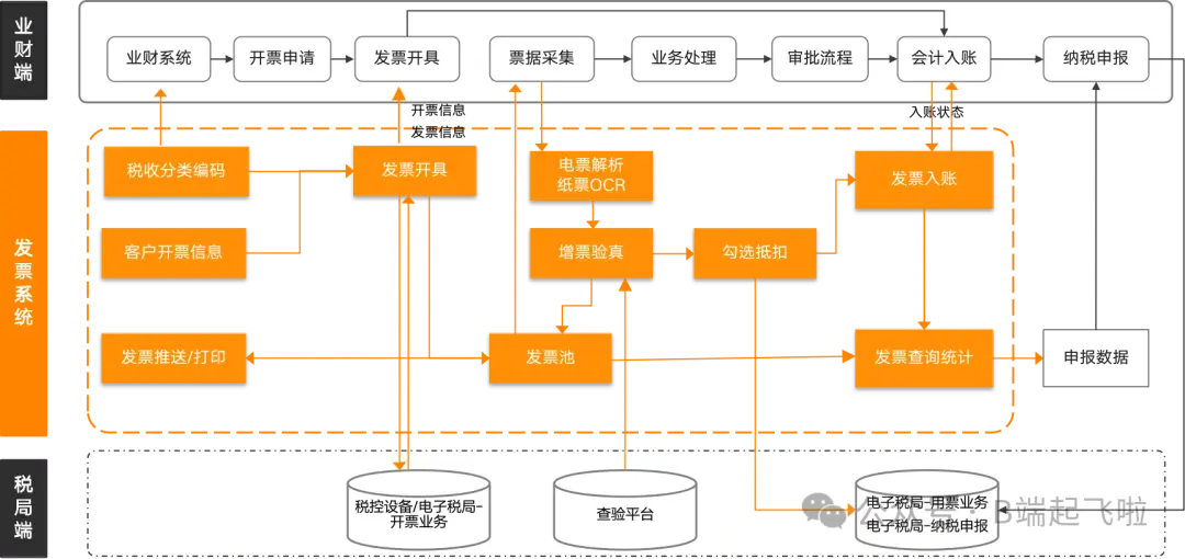 不同类型的单位,关注点不一致,共同点是需要理解经济活动中的业务形态和任务形态,需要有将业务形态转化为任务形态,并通过软件系统的形式进行展现、与经济活动关联,并记录经济活动的流转。 ![]() ![]() 在我们的日常生活中,衣食住行都离不开经济流转;只要有经济流转,就需要纳税;大多数需要纳税(增值税等)的情况,都需要开具发票,以发票的形式承载纳税信息。 如下图所示,对于发票系统来说,客户群体既有奥特莱斯、全聚德、亚朵酒店、滴滴出行这类B端企业,也有在这类场所消费的消费者。 当然,一些事业单位、学校等机构,也存在需要开具、使用发票的场景,比如到医院就医,可以开具医疗服务的常规发票,用于补充医疗报销,最终消费者所在公司的财务人员,可以完成财务入账处理,将发票作为一类财务凭证存储。 ![]() 典型应用场景 PART.02 发票系统业务流程与架构 数电阶段,电子税局将发票系统分为开票和用票2个模块。金税三期时,一般的服务商会把发票系统分为销项发票和进项发票2个模块。相对来说,两种分类方式,都是根据发票开具和发票使用进行的区分,但细微层面是有一定的区别的,这里不做扩展,本文将按开票和用票的分类方式进行讲解。 发票系统的业务范围主要包括下表所示的几部分: ![]() 发票系统业务范围 搭建发票系统时,可以根据实际业务诉求,建设发票系统架构。 一般而言,企业的发票系统,业务流程如下图所示,当企业进行货物、劳务、服务等的销售或转让时,可从业务系统或者财务系统(存在财务人员在财务系统审核后开票的场景)发起开票申请,待开票信息完整、数据校验无误后,可开具发票并交付给收票方。 收票方可以是企业,也可以是个人。当收票方是企业时,采购了对应的产品,需要将票据信息采集、验证、入池,确认无误后,增值税专票等可抵扣的场景,需要做勾选抵扣处理,以抵扣本公司的销项税,从而降低企业经营成本。 无论是开具还是接收发票的企业,均需对发票做纳税申报、财务入账处理,最终完成财务、税务、票据数据的对应关系,保证账务的准确性。 从管理角度,企业也有很多报表类需求,通过对数据的查询、统计、汇总、分析,更清晰的知悉本公司的运营情况,以便在后续经营过程中,更好地决策。 ![]() 发票系统业务流程 基于上述的业务场景和业务流程,可以考虑如下产品架构,将发票系统分为票据中台、发票业务、发票池3个模块。 票据中台负责连接外部系统,业财系统需要开票时,可将数据传入票据中台,通过票据中台的票据处理和规则处理,形成标准的开票和用票数据,进入开用票业务处理模块,进行发票开具或发票勾选抵扣等业务处理。最终所有开具发票和取得发票均在发票池中存储,以备各个系统及模块调用和分析。 在发票开具和勾选抵扣业务中,需要与多个系统打交道,比如通过税局的系统开票、查验、抵扣认证;通过银行、财政等系统,获取非税票据信息。全流程自动化闭环时,有的企业也会选择第三方通道系统一次性完成发票业务的对接,相当于发票系统外包。 ![]() 发票系统产品架构 PART.03 发票系统产品设计 企业在搭建发票系统前,需完成一些前置准备工作,比如需要获得开具、使用发票的纳税人资质,一般纳税人或者小规模纳税人均可,根据企业实际情况向当地税务机关申请即可。 申请完成后,需要选择使用哪种方式处理发票业务,目前市面上存在的方式包括:金税盘、税控盘、税务ukey、税控服务器、电子税局(增值税综合服务平台、电子税务局)等。 ![]() 发票开用前置准备 硬件设备在逐渐退出市场;在增值税综合服务平台进行业务处理的企业,在逐渐向电子税局过渡,选择时需要谨慎。 电子税局包括web端、乐企接口服务、APP等多种产品形态,一般大型企业对接时,可考虑申请乐企接口,直接对接税局。 3.1 开票业务不同的企业,开票这个操作的执行人不一致,一般来说,酒店、餐饮等服务行业,是前台开票;制造、零售等行业,是业务人员发起开票申请;物业、新兴技术等行业,是财务人员开票。 在发票系统手工开票,多系统需要打通,通过接口或者导入开票等场景,具体处理方式也不一致。 总结来说,常见的开票流程如下图所示,无论是线下通过Excel、邮件还是系统间进行数据处理和数据流转,开票时,都需要经过数据准备、业务加工、票税加工、合规校验、发票开具、发票交付几个流程。大多数企业都是有数据统计诉求的,只是不同类型的企业,统计的点和深度不一致,下图举了几个简单的例子。 ![]() 开票业务流程 3.1.1 业务数据处理 基于上述开票业务流程,搭建开票系统时业务数据处理的处理步骤如下图所示。 ![]() 业务数据处理 进行数据准备时,需要: