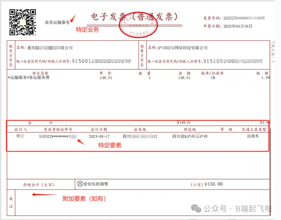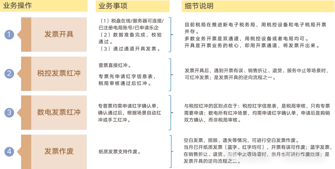 不同的企业,准备数据时处理逻辑不一样,存在先款后票和先票后款等多种情况,根据实际情况决定业务单据和开票申请单据直接的逻辑关系。 支持单据合并,商品明细合并与否可选;支持按金额、数量、明细行等方式拆分单据。 业务数据,时常跟税局要求的开票数据有出入,在准备开票前,需要进行业务加工,将业务数据加工为发票需要的购方信息、销方信息、交易明细和特定要素信息。 常规发票只需要购销方信息和交易信息即可。 业务中的交易信息,在发票上会根据税务分类要求,分类为货物、劳务、服务、不动产、无形资产等大类。 数电时期,税局为方便精细化管理,增加了特定要素信息,业务系统一般会保存这类数据,只要按照税局的要求,将数据进行转译或者映射即可。 当业务系统与发票系统交互时,还需进行票税加工,这一步,哪个系统来做都可以,只要结果符合预期即可。 票税加工的具体事项包括:价税分离、尾差处理、开票状态管理、待开处理等。 交易明细开票时,需完成价税分离。即所销售商品/货物/劳务等的价税合计金额,需被分离为不含税金额和税额,税额用于向税局缴纳税款。 计算不尽时,税局允许单行0.06元,合计1.27元的尾差存在。 一般的发票系统,主要存在两部分数据:待开票数据、已开票数据。票税加工后的数据,就是待开票数据。 合规校验,是发票开具前的最后一个步骤,有的校验点,是在票税加工前进行,有的是在加工后,上述流程里的顺序,是大逻辑的顺序,细节处理时,步骤间有交叉。 检验点包括纳税人资质校验、票面校验、优惠政策校验、库存校验等等。 纳税人资质需符合相关要求方可开票,比如有成品油生产或经销企业资质,可开具成品油发票。 不同地区优惠政策不一致,需根据当地情况校验优惠政策类型。 这里不同的开票通道,细节存在区别,比如备注的长度,数电web页面和乐企接口区别就很大,如果需要接入多通道时,需要考虑通道的特殊性。 上述业务数据处理,最终形成如图所示的发票票面信息。 金税四期以来,税局细化了30余个特定业务,不同特定业务和特殊票种的票面信息有一定的差异。 ![]() 3.1.2 发票开具红冲作废 数据准备完成后,可以发起正向或逆向的发票开具服务,包括开票、红冲、作废等,相关的主要业务操作包括: ![]() 发票开具红冲作废 这部分,是开票系统的核心。 根据不同的通道选择,在“税盘在线/服务器可连接/已注册电局账号/已申请乐企(多选一或多选二)”、“数据准备完成,校验通过”2个前提下,可对接对应的通道开具发票。 发票开具后,遇到开票有误、销售折让、退货、服务中止等场景时,可红冲发票;是发票开具的逆向流程之一。 税控发票红冲时: