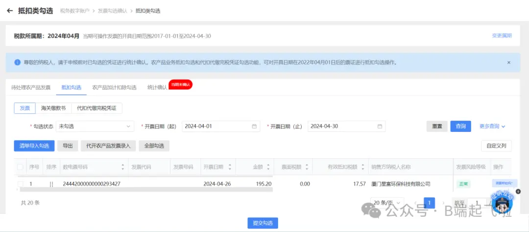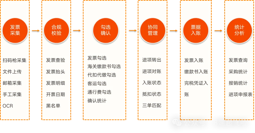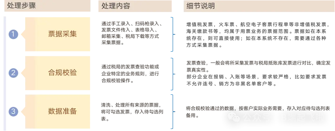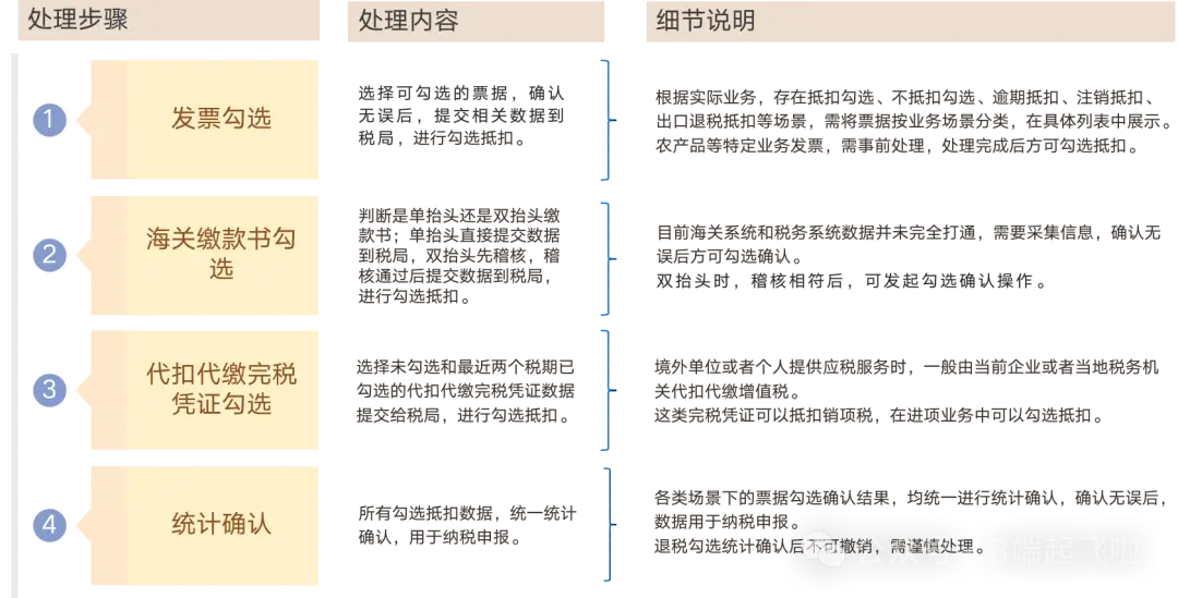 二者的区别点在于:税控红字信息表,是税局审核,只有专票需要申请;数电所有红冲场景,均需申请红字确认单,申请后是购销双方确认,而非税局审核(存在无需确认的情况)。 纸质发票支持作废。空白发票,损毁、遗失等情况,可进行空白发票作废。 当月已开纸质发票(蓝字、红字均可),开票有误可作废;蓝字发票,在销售折让、退货、服务中止等场景时,当月也可进行作废处理;是发票开具的逆向流程之二。 目前纸质发票正在逐渐退出市场,如果企业可以选择,建议选择并引导客户使用电子发票,在降本增效、快捷交付、便捷流转等方面,电票比纸票的优势都相对大一些。 以电子税局开具发票流程为例,阐述发票开具核心业务的数据流转过程: ![]() 不同的开票通道,区别比较大,有兴趣的伙伴可以后续通过进阶版本了解细节。 3.1.3 发票交付 发票开具完成后,需将其交付给企业或者消费者,常见的交付方式包括:邮箱交付、短信交付、接口交付、二维码交付等。 中国市场比较卷,交付方式丰富多彩,为了满足老年市场或部分必须有纸质化资料的公司的需求,还支持电票通过A4或A5纸打印后交付。 一般其他国家的发票交付,主要是邮件交付。 交付方式和业务事项如下图所示,细节不再通过文字赘述。 ![]() 发票交付的页面示例如下图所示: ![]() 3.1.4 数据统计 一般情况下,需要数据统计功能,是向企业运营管理负责。企业期望通过数据化管理日常运营时,会更多地关注数据统计结果,并会安排相关的岗位对统计结果进行分析,作为运营决策的支撑。 同时,系统间进行对接时,还会通过发票明细信息、发票汇总信息等内容,完成数据的比对,以及纳税申报需要的销项信息的事前汇总。 常见的统计内容如下图所示: ![]() 其中发票汇总,一般是分税率对金额、税额进行汇总,如下图所示: ![]() 发票汇总表 3.2 用票业务一般是采购人员、报销人员(企业员工)、财务、税务等角色,会时常跟用票业务打交道。 企业运行过程中,存在产品/服务等采购-加工/处理-销售等过程,销售时需要开具发票给到下游客户;采购时,需要进行供应商选型,完成采购申请,采购完成后,供应商需要给企业开具发票,这类发票是当前企业的进项发票。 另外,在企业员工出差、加班等场景时,可以发起报销,这类发票,部分需要作为进项发票做抵扣处理(比如增值税专用发票),以抵扣销项税;部分不可抵扣的发票也需要做财务入账处理。 基于上述场景考量,常见的用票流程可以抽象为如下图所示环节,在用票系统搭建时,主要考虑发票采集、合规校验、勾选确认等主要环节;如需与业财税系统对接,可以考虑协同管理、票据入账等模块的搭建;有企业管理诉求或者为纳税申报准备进项票据数据汇总需求时,可进行数据的统计分析处理。 ![]() 用票系统业务流程 3.2.1 业务数据准备 基于上述用票业务流程,搭建用票系统时业务数据准备的处理步骤如下图所示。 ![]() 业务数据准备 真正票据全量电子化后,可能不再有票据采集这个场景。但很长一段时间内,票据采集这个模块将一直存在,用票的票据类型和源系统过多,政府部门之间、政府和企业之间、企业和企业之间的真正打通,还需要longlong长时间。 可以通过手工录入、扫码枪录入、发票文件传入、表格导入、邮箱采集、税局下载等方式采集票据。 需要采集的票据类型包括但不限于:增值税发票,火车票、航空电子客票行程单等非增值税发票,海关缴款书等。 票据如在本系统存在,则可直接使用;如在本系统不存在,需要通过各种方式采集票据。 票据采集的来源各种各样,也不确定所采集票据的正确性,在票据采集完成后,需要进行合规校验。可以通过税局的发票查验功能或企业特定的业务规则,进行合规校验操作。 发票查验,一般会将所采集发票与税局抵账库发票进行对比,确定发票真实性。 部分企业在报销、入账等场景,要求较严格,比如要求发票不允许连号、销方为非黑名单客户等,这种情况可以通过企业特定的业务规则做合规校验处理,此时用票系统需要提供校验规则配置功能。 真正进入用票池的发票数据,是需要经过数据清洗、处理和分类的,即数据准备阶段。比如将合规校验通过的数据,按客户实际业务需要,存入对应待勾选列表备用。 票据采集示例如下: ![]() 海关缴款书采集 3.2.2 票据勾选确认 数据准备完成后,可以发起正向或逆向的票据勾选确认流程,包括票据勾选、统计确认等,相关的主要业务操作包括: ![]() 这部分,是用票系统的核心。 根据当前实际情况,选择发票、海关缴款书还是代扣代缴完税凭证进行勾选确认,一般先勾选,勾选完成后系统自动完成统计操作,在申报期可以进行确认抵扣逻辑。 选择可勾选的票据,确认无误后,提交相关数据到税局,进行勾选抵扣。 根据实际业务,存在抵扣勾选、不抵扣勾选、逾期抵扣、注销抵扣、出口退税抵扣等场景,需将票据按业务场景分类,在具体列表中展示。 农产品等特定业务发票,需事前处理,处理完成后方可勾选抵扣。 所有勾选抵扣数据,统一统计确认,用于纳税申报。 各类场景下的票据勾选确认结果,均统一进行统计确认,确认无误后,数据用于纳税申报。 退税勾选统计确认后不可撤销,需谨慎处理。 以电子税局票据勾选抵扣流程为例,阐述发票使用核心业务的数据流转过程: ![]() 勾选抵扣功能页面示例: ![]() ![]() 3.2.3 