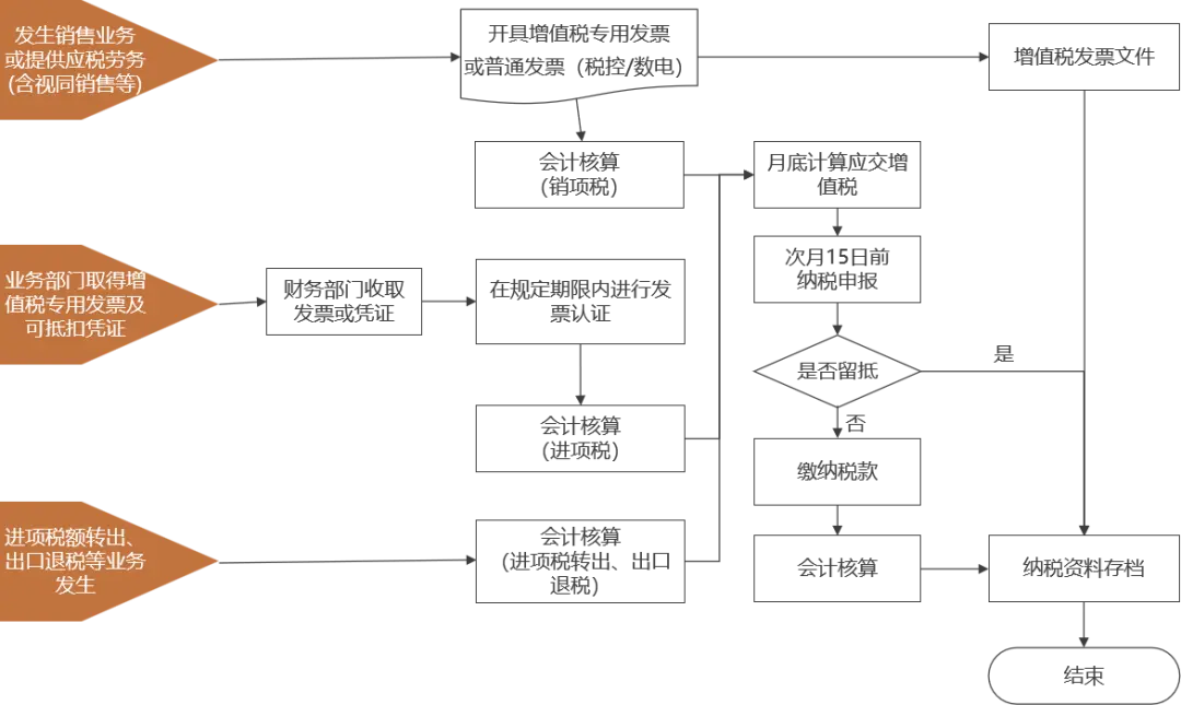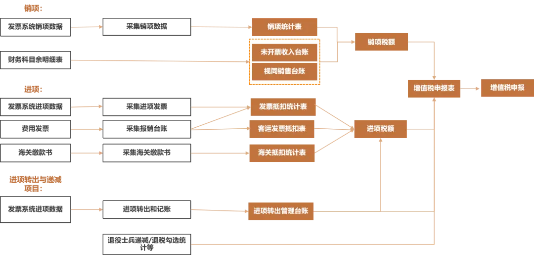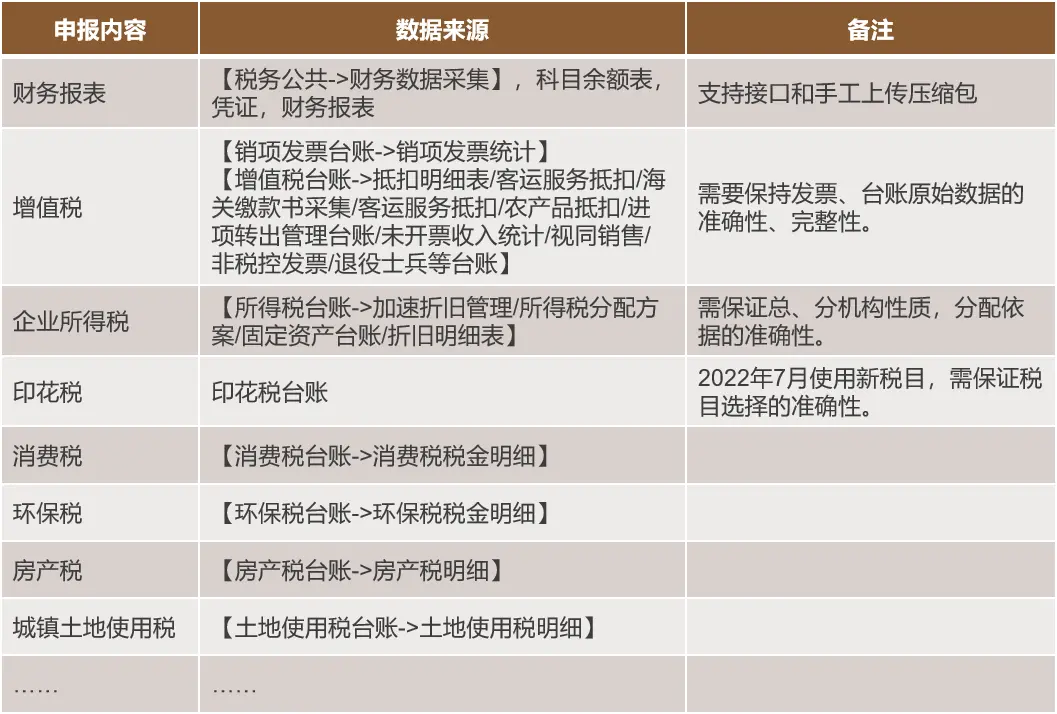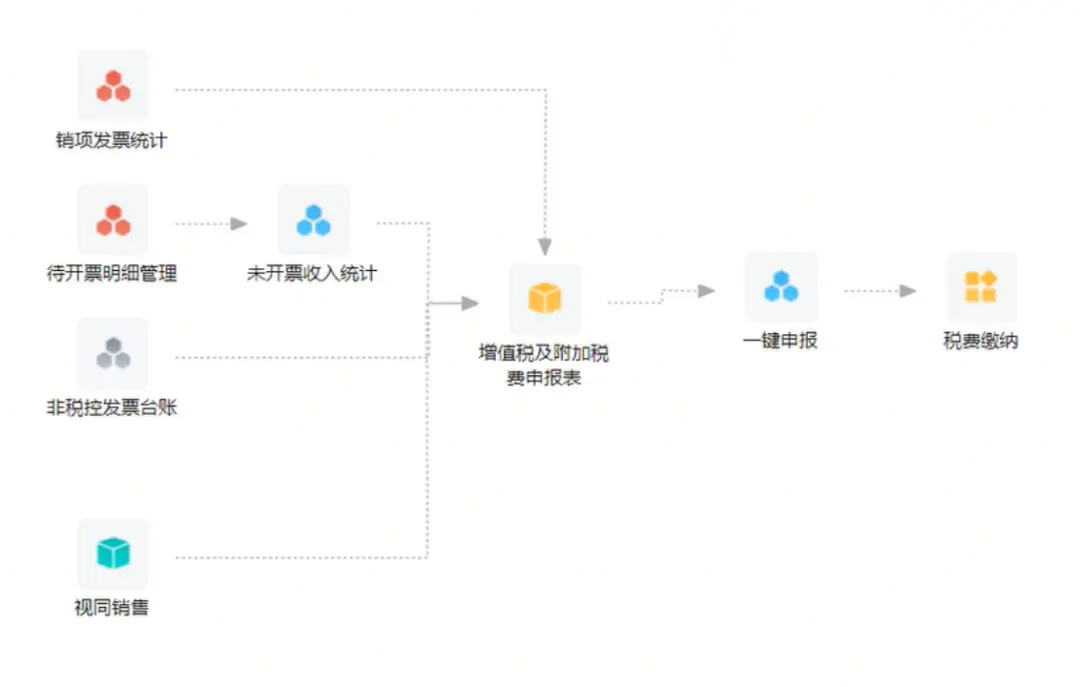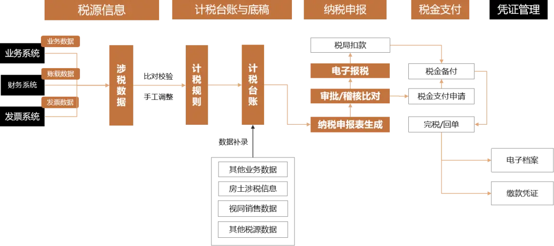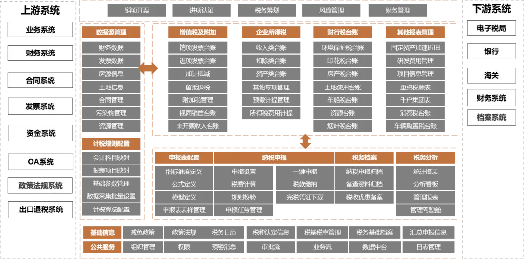 不同税种的应纳税项目、数据源、税金计算、申报表、税收优惠政策等均有区别,所以申报系统的系统配置化非常重。在真正使用系统前及税局对某些内容有调整时,都需相应的改变某些配置项。 所以,纳税申报系统,除上述与申报流程有关的主要业务类型外,对于申报配置的设计,也要着重考虑。 2.2 纳税申报的业务流程一般而言,企业的纳税申报系统,业务流程如下图所示。 ![]() 申报系统将从业务系统、财务系统、发票系统等位置获取涉税数据,按照一定的计税规则,形成对应的计税台账,若自动获取的数据信息不全,可以手工补录其他信息。 根据税金计算,形成对应的申报表,确认无误后提交电子报税,税局接收后,可以进行税金支付操作。 申报完成后,将完税凭证和银行回单等资料的归档管理。 2.3 纳税申报的产品架构搭建纳税申报系统时,可以根据实际业务诉求,规划纳税申报系统架构。 根据业务需要会将系统分为数据源管理、计税规则配置、计税台账管理、纳税申报等多个模块,如下图所示: ![]() 申报系统一般从上游系统获取数据源,根据实际需要,连接业务系统、财务系统、合同系统、发票系统、资金系统、出口退税系统等,获取对应的财务、发票、合同、土地、房源、污染物、资源等信息,在数据源中进行管理。产品中可设计数据源管理模块,管理相关内容。 可以设置会计科目映射、报表项目映射等计税规则,将数据源转为对应台账。产品中可设计计税规则配置模块,完成相关规则的配置。 需要作为台账管理的项目,可以按需设计产品台账,比如增值税及附加所需要的销项发票台账、进项发票台账、未开票收入台账等。 通过报表维度定义、公式定义、模型定义等方式,创建及管理申报表,并将数据源及台账信息,转化为申报表信息。这些一般放在申报表配置模块实现,可以放开给终端客户自行设置,也可以放在后台由系统管理或开发者设置。 申报系统需设计纳税申报模块,对申报的周期、税源等进行管理,并完成税费计算、规则校验、一键申报、税费缴纳、完税凭证管理等任务。 为备查审计及税务信息,需进行税务档案的归档,此模块可根据企业规划放在电子档案或纳税申报系统中。 至于税务层的分析,比如统计报表、管理报表、管理驾驶舱等,根据企业实际管理需求,按需规划和设计即可。 申报所需的基础信息和公共服务,可根据企业实际规划,考虑由申报系统实现还是基础支撑平台实现。其中的审批流常与OA系统打通;政策法规库,存在自研自行收集或与三方政策法规系统对接等方式实现。 申报的下游系统包括税局系统、银行系统、海关系统等,每个征期,系统间都需要进行交互,完成纳税申报和税款缴纳等工作。 三、申报通道 目前能联通税局进行申报的通道包括乐企接口、电子税局页面、增值税综合服务平台页面3种,示例如下: ![]() ![]() 企业对接时,可选择如下几种方式对接: