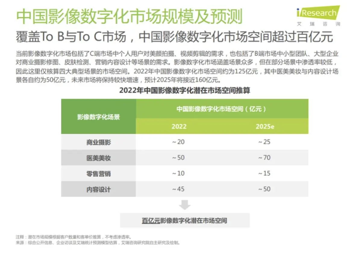 艾瑞咨询《2022 年中国影像数字化行业研究报告》显示,2022年中国影像数字化市场空间为125亿元,其中医美美妆和内容设计在数字化市场空间的占比约为50亿元。 C 端应用繁荣,B 端应用尚处于探索期,预计 2025 年市场规模达 160 亿元。 在商业摄影场景下,数字化产品比如像素蛋糕能够帮B端用户进行智能处理,提升出图效率和质量。影像产品的价值围绕这三个方面:效率提高、创意迸发、数据赋能。 ![]() 一、影像图片编辑产品有哪些优化方向? 影像处理类应用「导入到编辑流程」流程遇到的问题
