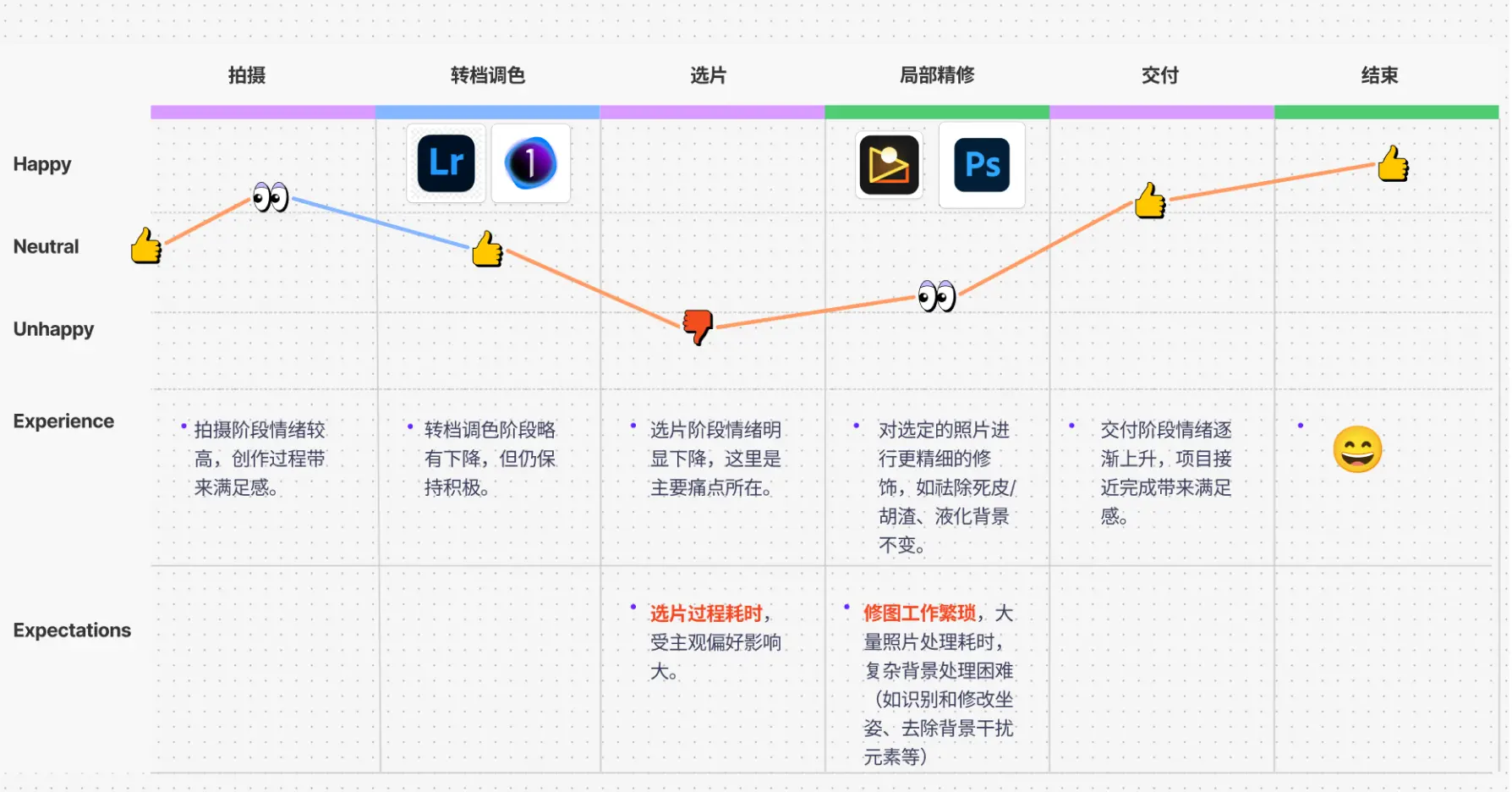 二、什么人?在什么场景?做什么事? 1. 用户操作流程用户的后期流程往往是先快速筛选照片,再通过电脑修图工具进行基础调色和修图处理。不同场景下(如旅拍、婚礼、会议等),用户对快速交付的需求较大,因此他们常常希望在像素蛋糕批量编辑缩短修图时间,并提升工作效率。 以下是用户旅程地图,切入点是图片导入到编辑这个流程。 ![]() 2. 相近领域同类型的产品「文件管理页」痛点 ![]()