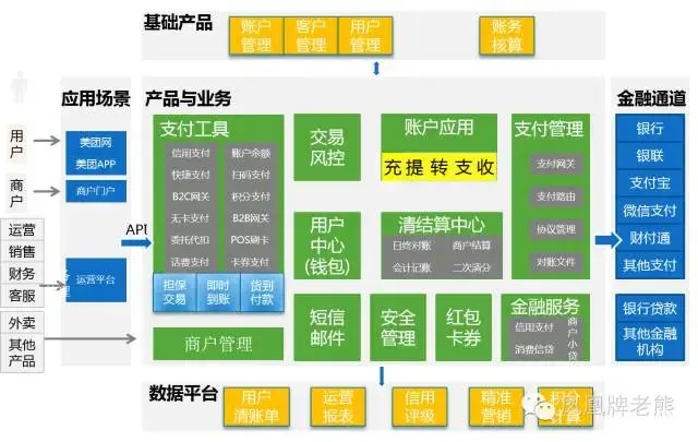 三、简明产品架构图 所谓产品架构图,简单的理解,就是站在产品角度,提供什么样的服务能力。下面是一个典型的支付系统的产品架构图。实际实现时差异会很大,尤其是上面的产品或应用层,有很多机构为特殊的行业提供一些特殊的能力,比如携程的支付就会有航空方面的B2B业务。但基础的能力基本也就这些。 ![]() 说明: