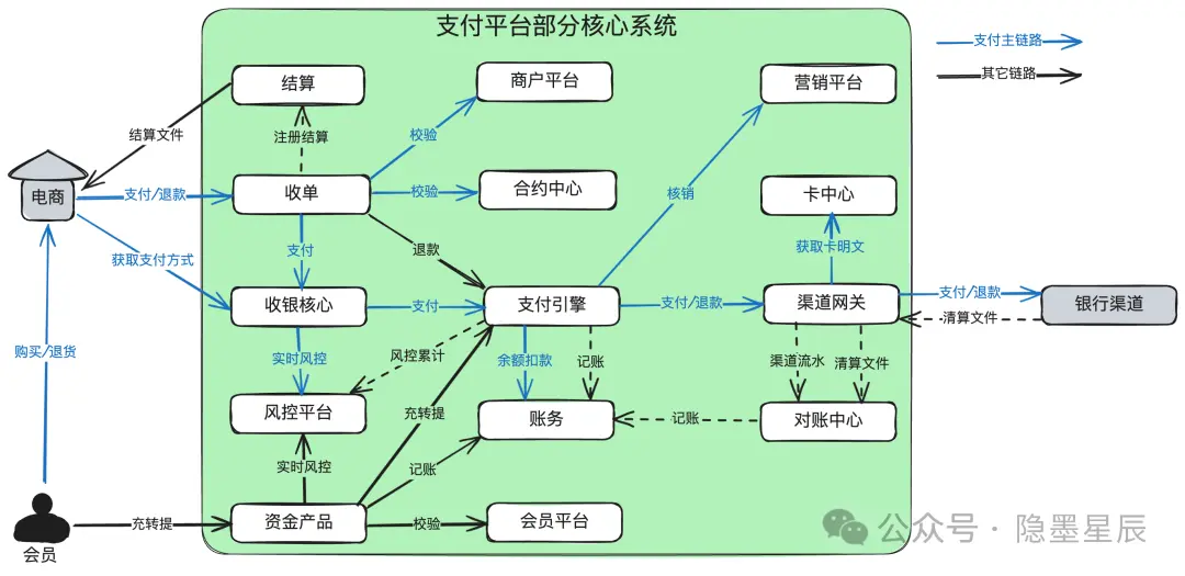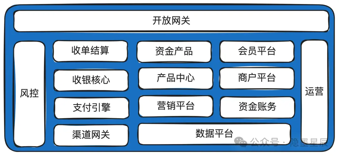 5.2. 开放网关主要对接商户,比如下单、支付等接口入口。通常要求有比较高的安全性。部分公司可能会把移动端网关、PC门户网关、商户通知等能力集成在开放网关,也可能会单独拆出部署。 5.3. 收单结算负责把商户的单收下来,并给商户发起结算。承担的收单产品包括有:线上收单,线下收单,担保交易、即时到账等,每个公司的商业策略不同,开出的收单产品会有差异。 有些公司把结算划到出款中心,对接银企直连的渠道。 5.4. 资金产品承担无买卖标的的纯资金转移能力。典型的有:充值、转账、提现、代发。和支付的区分在于支付是有买卖标的,而资金产品没有。也就是在系统中没有买卖记录发生,但在线下可能有。 资金产品一般需要独立的牌照。 5.5. 收银核心渲染可用支付方式。包括查询账户是否有余额,查询营销是否有营销券,查询渠道网关是否有可用的外部渠道,最后组合成可用支付方式,供前端渲染。 收银核心就像一个大内总管,收到请求后,找商户平台核实身份,找合约平台核实权限,找会员平台核实用户身份,找收单看一下这笔单是否可以继续支付,找账务中心获取余额信息,营销看看有没有可用的券,找渠道网关看看没有可用的渠道,找额度中心看看是否超限额了,找风控问一下当前支付是否安全,找会员平台校验支付密码 … … 5.6. 支付引擎负责真正的扣款或转账。有些公司叫支付核心。 如果是余额就调账务扣减余额,如果是红包就调营销做核销,如果是外部银行通道就调渠道网关。 5.7. 渠道网关负责去外部渠道扣款。通常还会提供渠道路由、渠道咨询等能力,做得细的公司可能会把渠道核心和报文/文件网关单独拆出来。其中渠道核心就提供渠道路由、渠道咨询、渠道开关等服务,报文/文件网关负责报文转换、签名验签等。 5.8. 会员平台管理会员的生命周期,比如注册、注销、登录等。同时还提供核身服务(比如登录密码,支付密码,短信验证码等)、实名认证服务等。 5.9. 商户平台管理商户的入驻签约、KYB、交易管理等。 5.10. 产品中心管理对外提供的产品能力,比如快捷支付,代扣等。一般大的支付系统才会独立成一个子系统。 5.11. 账务中心负责账户开立,记账等。 5.12. 会计中心会计科目管理、分录管理、日切管理等。 监管报表有时候也放在这里,有些公司也会独立出去。 很多集团公司往往有一套独立的专业财务系统,这个时候往往需要会计中心做完日切后,要把记账信息合并到集团公司的财务系统中去,简称并账。 5.13. 对账中心负责明细对账和资金对账。 5.14. 营销平台提供满减、红包等营销工具。 5.15. 风控平台针对账户和交易,提供实时、离线风控,控制交易的风险。反洗钱、反欺诈是基本要求。 通常各公司对风控规则看成是机密,研发也可能看不到运营配置的规则。经常看到有网友问:“有xx公司的人在吗?我有xxx场景下的支付总是提示风控不过,是否知道是什么原因,怎么才能通过?”,完全是浪费口舌,谁会对外公布自己的风控规则,让人去钻空子呢? 5.16. 运营平台订单管理、渠道管理、产品管理等综合运营工具。 5.17. 数据平台主要用于数据汇总和分析。当前各支付公司基本都是分布式部署N多个应用,数据都在散落在各子系统中,需要汇总到数据平台用于经营分析。 5.18. 卡中心负责管理用户的绑卡信息。需要经过PCI认证。 5.19. 额度中心累计用户、商户的额度,通常有日、月、年,单卡等各种分类。 5.20. 外汇平台负责外汇报价和兑换。 5.21. 流动性与调拨中心一些跨境支付公司,在多个国家多个银行有头寸,各头寸之间经常需要做流动性管理,提高资金利用率。 毕竟在国外不需要把备付金强制存到央行还不给利息。当资金量大的时候,这笔收益可不少。 5.22. 差错中心负责差错处理。比如渠道退款失败(银行账号销户,过了银行的退款有效期等),需要通过其它的方式退给用户。 5.23. 拒付中心处理用户的拒付和举证。在跨境支付场景下,信用卡用户联系发卡行说卡被盗刷或商品没有收到,或商品有问题等,拒绝支付给商户。 国内基本没有看到拒付场景。 六、一些拓展知识 6.1. 技术风险与资损防控一般来说,技术风险主要包含稳定性和资损两个方面。其中稳定性风险就是大家经常说的几个9,比如99.999%可用,就是5个9。资损风险就是平台或用户的资金损失。 虽然资损也是技术风险的一种,但是因为对于专业的持牌支付公司来,资损是一种非常严重的事故,容易引发客诉、网络事件、甚至监管介入,所以又较一般的风险更为严重,常常把资损防控单独拿出来说。 技术风险体系过于庞大,这里只谈几点通用知识。 识别风险来自哪里 我们通常先需要知道风险来自哪里,才知道如何去防控。而风险往往来自变化。举几个例子,抛砖引玉: