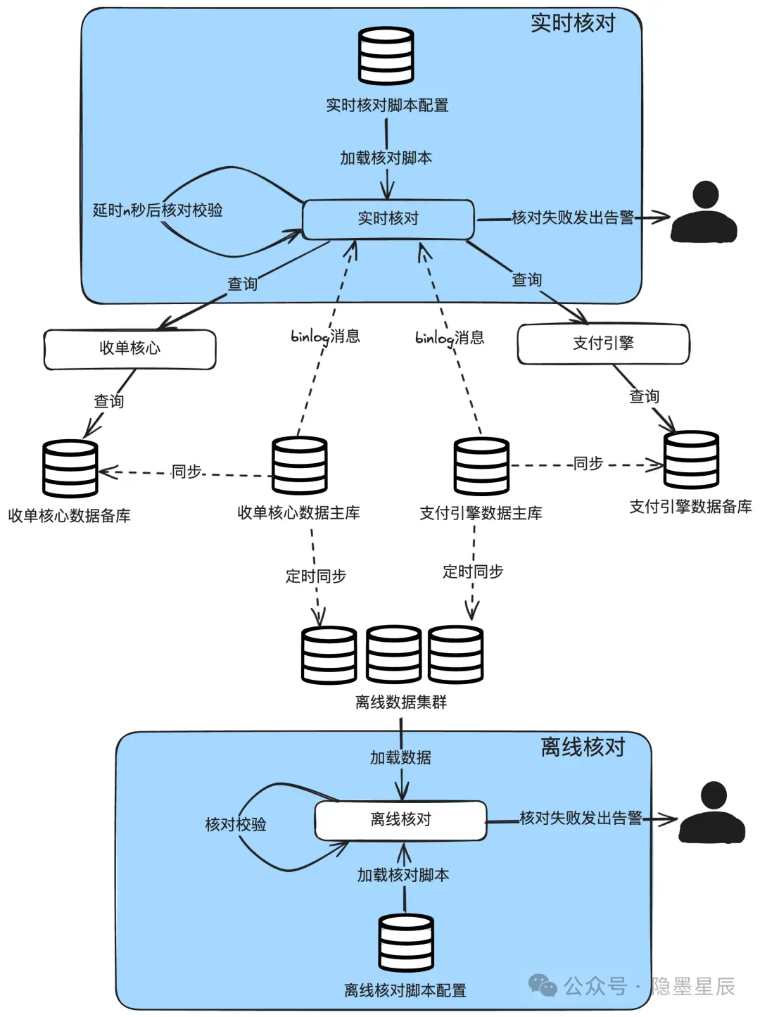 应对风险 根据变化去应对风险。比如大促引入了流量变化,那就做压测、扩容、限流、降级非核心业务等应对。比如原来只有支付,这些有了用户提现,针对用户提现,内部多个子域可能状态/金额不一致,和银行渠道的状态/金额也可能不一致,那就加入各种对账手段,以及对应的应急预案。 内部系统实时与离线对账 对账是资损防控中最效的手段之一。 前面讲过的三层对账主要是和银行渠道对账,除了这个之外,一般的支付平台还会有内部系统之间的两两核对,这种核对主要是信息流层面的核对,主要核对状态、金额的一致性。 ![]() 说明: