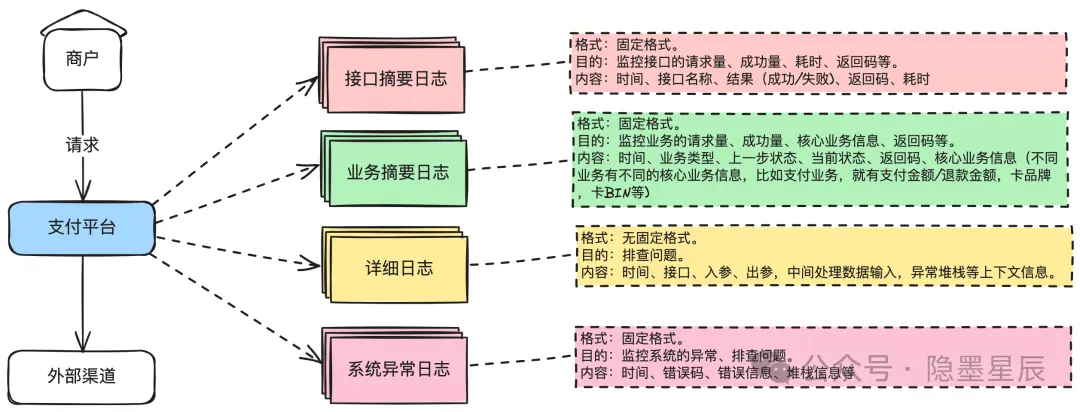 6.6. 业务ID生成规则数据库一般都会设计一个自增ID作为主键,同时还会设计一个能唯一标识一笔业务的ID,这就是所谓的业务ID(也称业务键)。比如收单域的收单单号。 也有人采用所谓雪花算法,但其实不适用于支付场景。 下面以32位的支付系统业务ID生成为例说明。实际应用时可灵活调整。 ![]() 第1-8位:日期。通过单号一眼能看出是哪天的交易。 第9位:数据版本。用于单据号的升级。 第10位:系统版本。用于内部系统版本升级,尤其是不兼容升级的时候,老业务使用老的系统处理,新业务使用新系统处理。 第11-13位:系统标识码。支付系统内部每个域分配一段,由各域自行再分配给内部系统。比如010是收单核心,012是结算核心。 第14-15位:业务标识位。由各域内部定,比如00-15代表支付类业务,01支付,02预授权,03请款等。 第16-17位:机房位。用于全球化部署。 第18-19位:用户分库位。支持百库。 第20-21位:用户分表位。支持百表。 第22位:预发生产标识位。比如0代表预发环境,1代表生产环境。 第23-24位:预留。各域根据实际情况扩展使用。 第24-32位:序列号空间。一亿规模,循环使用。一个机房一天一亿笔是很大的规模了。如果不够用,可以扩展到第24位,到十亿规模。 6.7. 状态机设计状态机,也称为有限状态机(FSM, Finite State Machine),是一种行为模型,由一组定义良好的状态、状态之间的转换规则和一个初始状态组成。它根据当前的状态和输入的事件,从一个状态转移到另一个状态。 下图就是收单子域设计中交易单的状态机设计。 ![]() 从图中可以看到,一共4个状态,每个状态之间的转换由指定的事件触发。 常见代码实现误区 经常看到工作几年的同事实现状态机时,仍然使用if else或switch case来写。这是不对的,会让实现变得复杂,且容易出现问题。 甚至直接在订单的领域模型里面使用String来定义,而不是把状态模式封装单独的类。 还有就是直接调用领域模型更新状态,而不是通过事件来驱动。 限于篇幅,这里就不给正确的示例了。有兴趣的可以去网上看看,良好的示例有很多。 6.8. 日志规范只要在公司写过代码,就一定打印过日志,但经常发现一些工作多年的工程师打印的日志也是乱七八糟的。我曾经在一家头部互联网公司接手过一个上线一年多的业务,相关日志一开始就没有设计好,导致很多监控无法实现,出了线上问题也不知道,最后只能安排工程师返工改造相关的日志。 我们要明白日志是用来做什么的。只是先弄明白做事的目的,我们才能更好把事情做对。在我看来,日志有两个核心的作用:1)监控,诊断系统或业务是否存在问题;2)排查问题。 对于监控而言,我们需要知道几个核心的数据:业务/接口的请求量、成功量、成功率、耗时,系统返回码、业务返回码,异常信息等。对于排查问题而言,我们需要有出入参、中间处理数据的上下文、报错的上下文等。 ![]() 接下来,基于上面的分析,我们就清楚我们应该有几种日志: