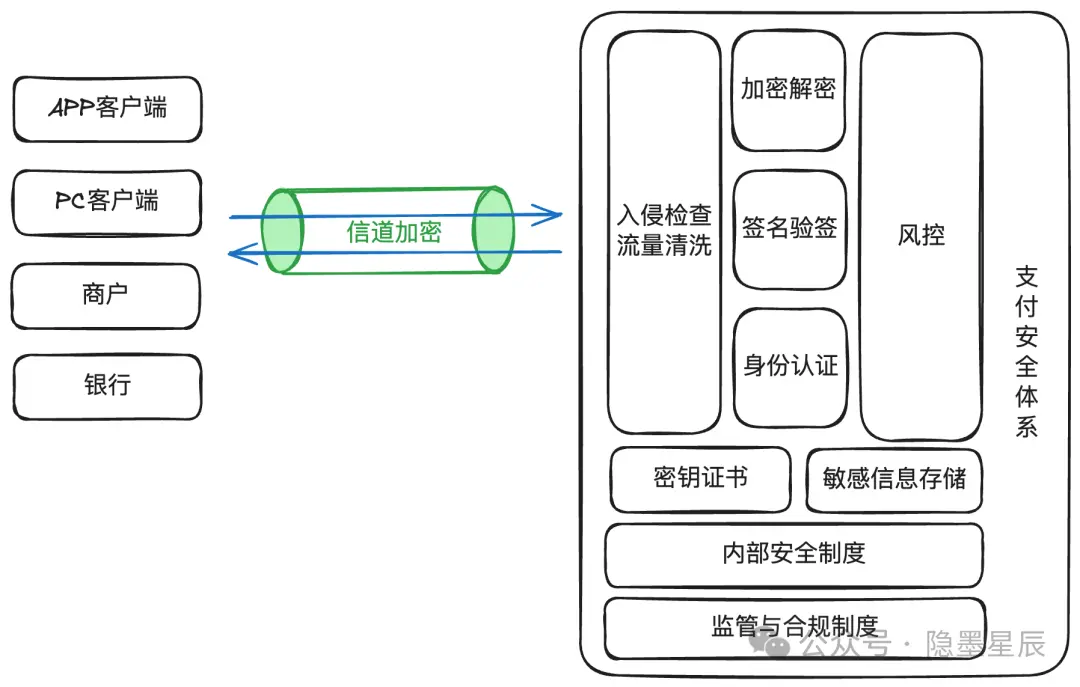 6.9. 支付安全支付安全核心关注点 ![]() 支付安全是一个很大的范畴,但我们一般只需要重点关注以下几个核心点就够: 1)敏感信息安全存储。 对个人和商户/渠道的敏感信息进行安全存储。 个人敏感信息包括身份证信息、支付卡明文数据和密码等,而商户/渠道的敏感信息则涉及商户登录/操作密码、渠道证书密钥等。 2)交易信息安全传输。 确保客户端与支付系统服务器之间、商户系统与支付系统之间、支付系统内部服务器与服务器之间、支付系统与银行之间的数据传输安全。这包括采用加密技术等措施来保障数据传输过程中的安全性。 3)交易信息的防篡改与防抵赖。 确保交易信息的完整性和真实性,防止交易信息被篡改或者被抵赖。一笔典型的交易,通常涉及到用户、商户、支付机构、银行四方,确保各方发出的信息没有被篡改也无法被抵赖。 4)欺诈交易防范。 识别并防止欺诈交易,包括套现、洗钱等违规操作,以及通过识别用户信息泄露和可疑交易来保护用户资产的安全。这一方面通常由支付风控系统负责。 5)服务可用性。 防范DDoS攻击,确保支付系统的稳定运行和服务可用性。通过部署防火墙、入侵检测系统等技术手段,及时发现并应对可能的DDoS攻击,保障支付服务的正常进行。 极简支付安全大图 支付安全是一个综合性的系统工程,除了技术手段外,还需要建立健全的安全制度和合规制度,而后两者通常被大部分人所忽略。 下图是一个极简版的支付安全大图,包含了支付安全需要考虑的核心要点。 ![]() 说明: 1)制度是基础。 哪种场景下需要加密存储,加密需要使用什么算法,密钥长度最少需要多少位,哪些场景下需要做签名验签,这些都是制度就明确了的。制度通常分为行业制度和内部安全制度。行业制度通常是国家层面制定的法律法规,比如《网络安全法》、《支付业务管理办法》等。内部安全制度通常是公司根据自身的业务和能力建立的制度,小公司可能就没有。 2)技术手段主要围绕四个目标: