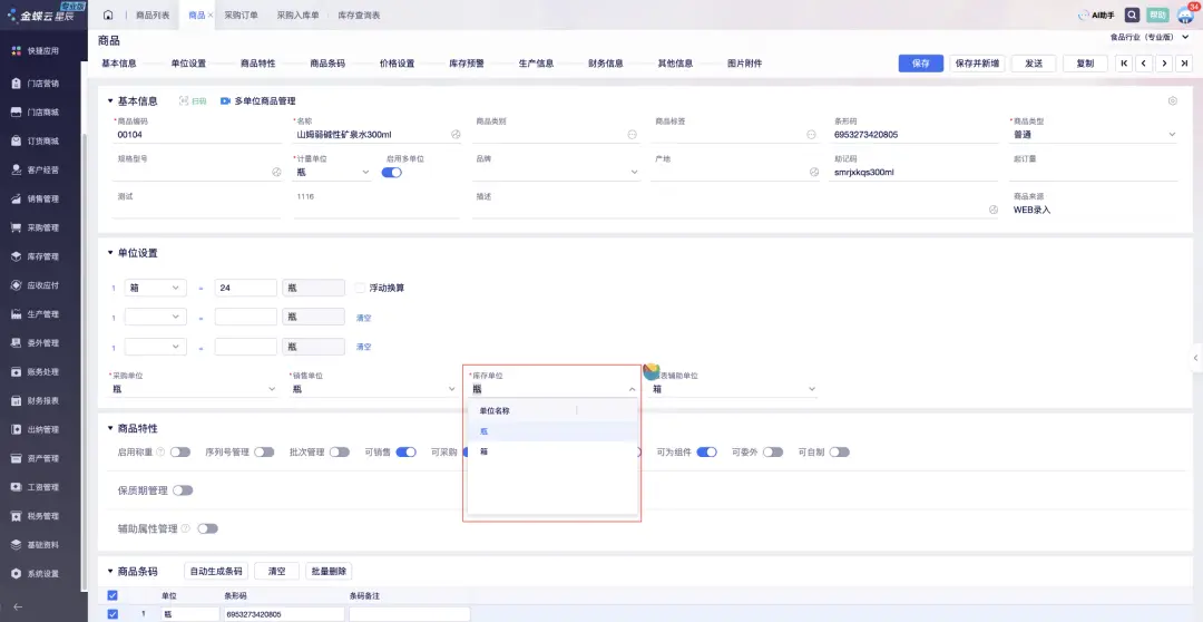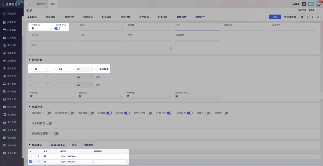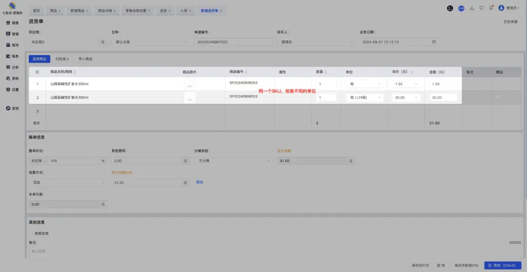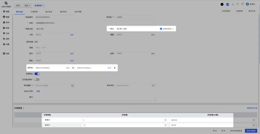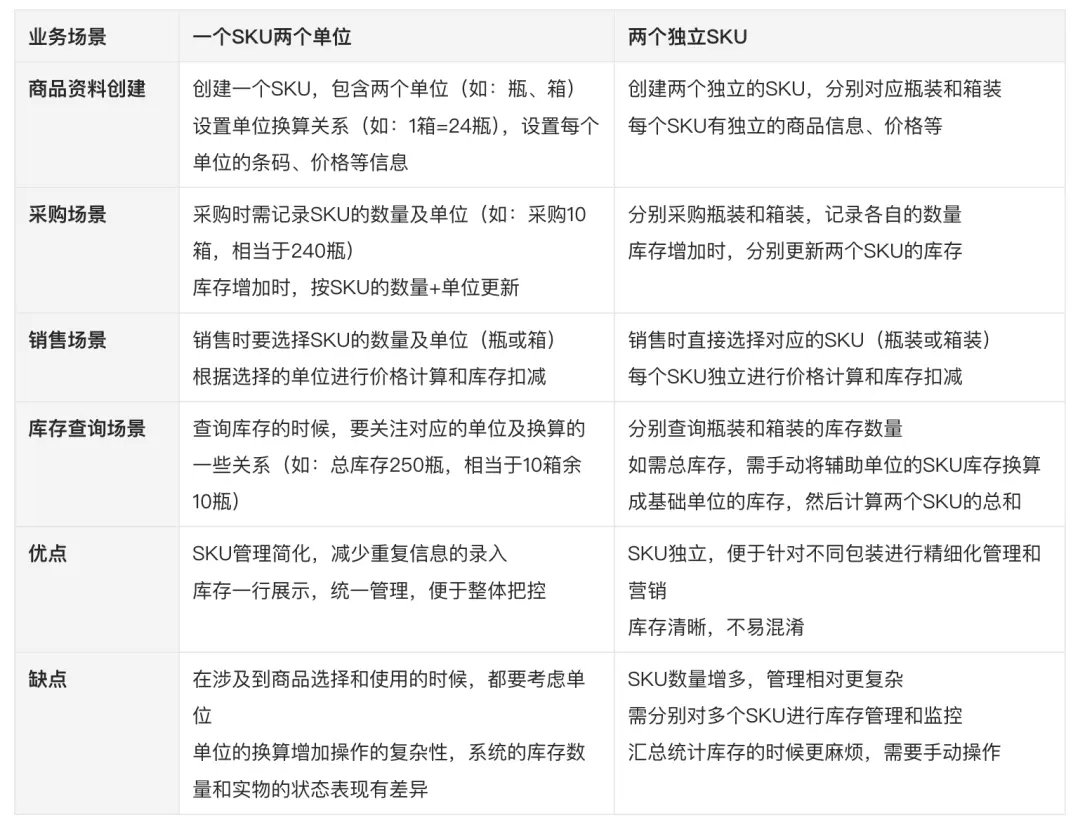 在这种情况下,一瓶水和一箱水的库存、价格、销售渠道等都可以独立管理。 情况二:1个SKU的两种单位如果一瓶水和一箱水被视为同一商品项的不同计量单位,且业务上希望统一管理它们的库存和销售策略,那么它们可以被定义为一个SKU的两种单位。具体来说: