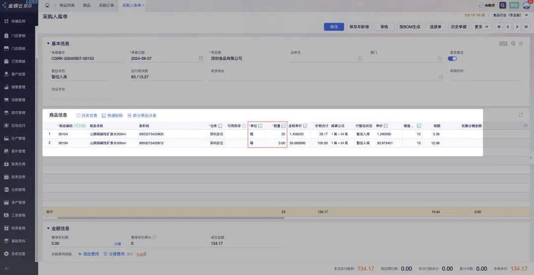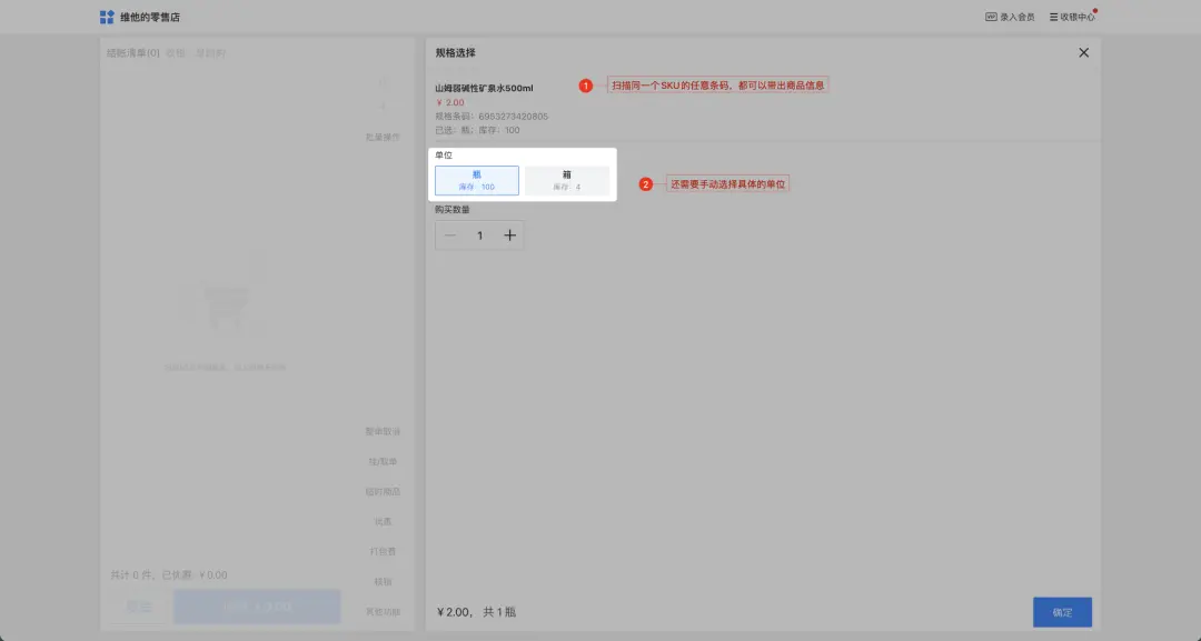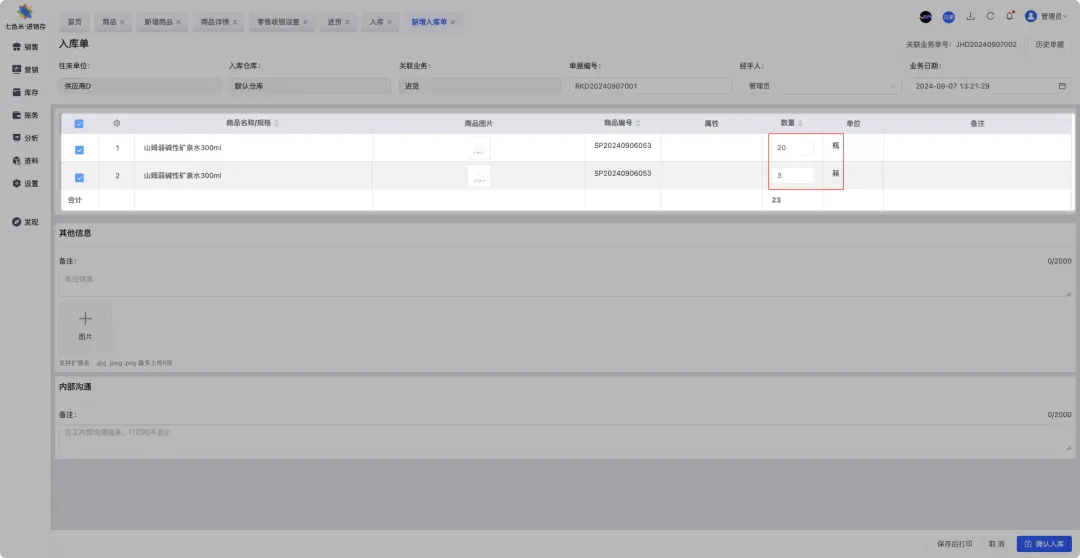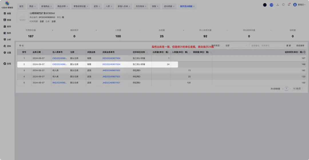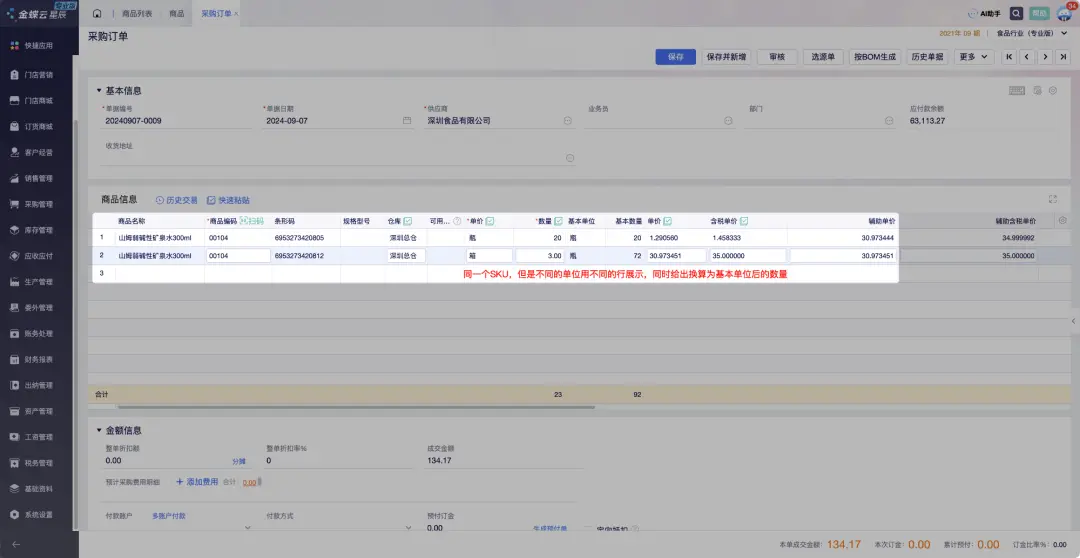 在这种情况下,一瓶水和一箱水的库存、价格、销售渠道等都可以独立管理。 情况二:1个SKU的两种单位如果一瓶水和一箱水被视为同一商品项的不同计量单位,且业务上希望统一管理它们的库存和销售策略,那么它们可以被定义为一个SKU的两种单位。具体来说: