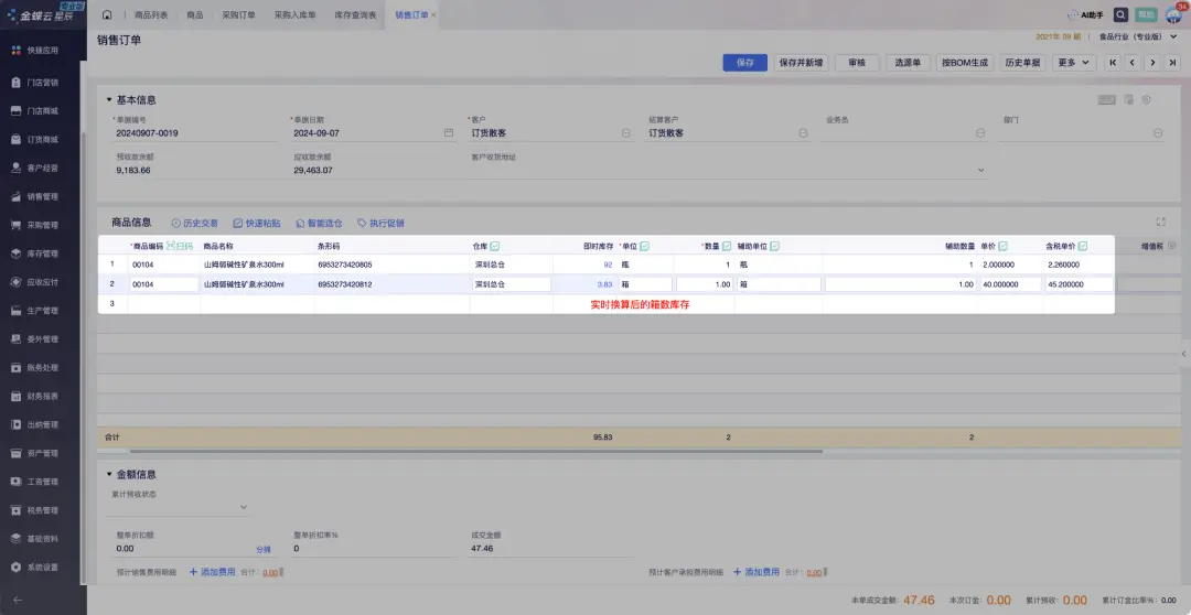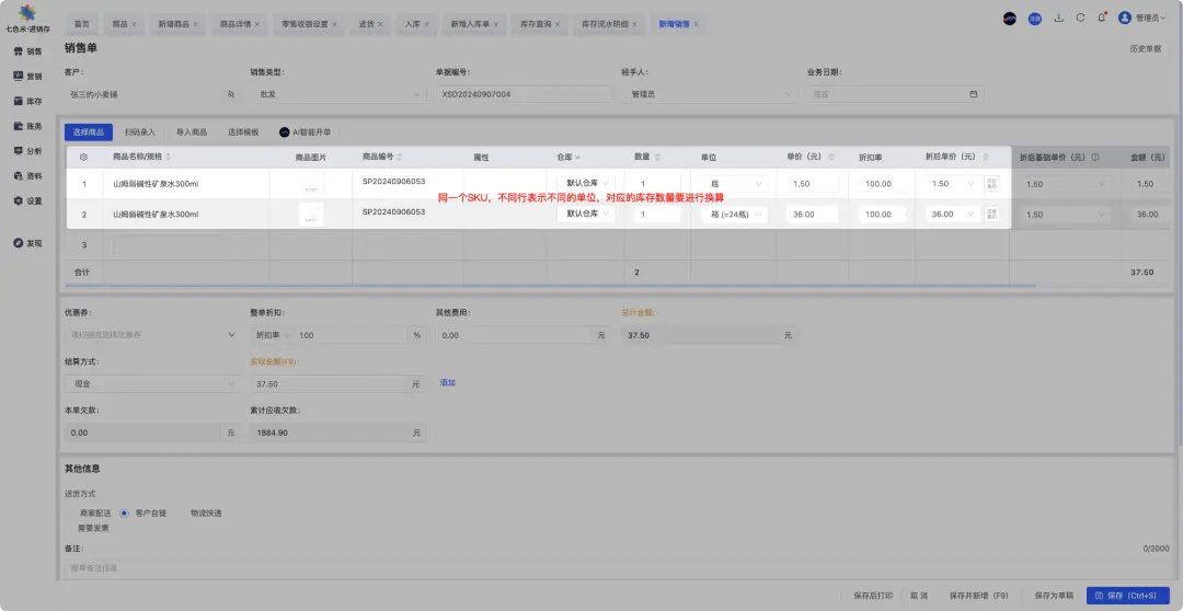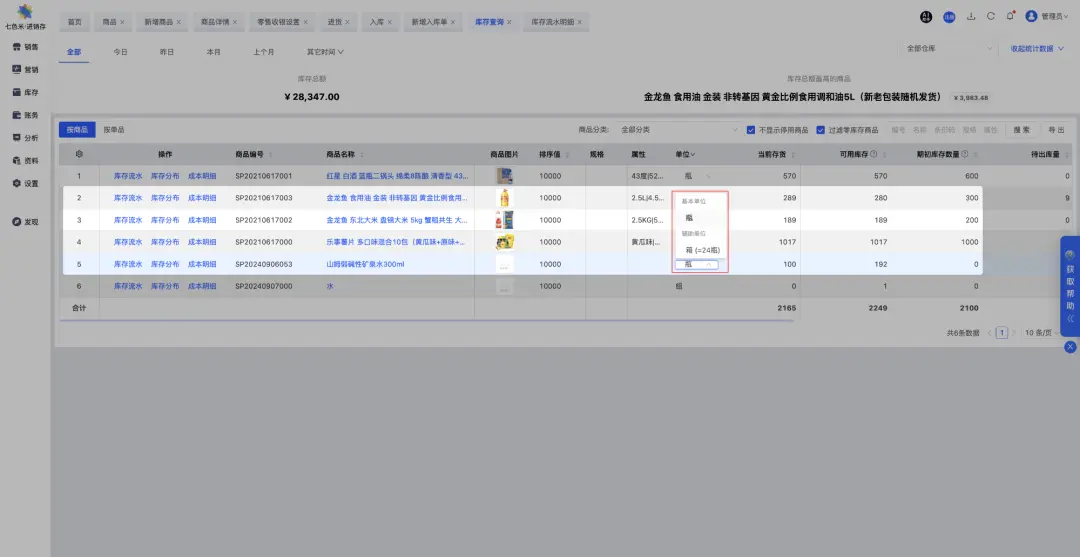 在这种情况下,一瓶水和一箱水的库存和销售信息可以通过单位转换来统一管理。例如,可以定义一箱水包含12瓶水,这样在库存管理系统中就可以通过单位转换来计算总库存量。 在进销存类、零售类系统中往往会优先考虑支持多单位的管理,因为它们面向的客户在实际的业务场景中,经常会有多单位管理的诉求,所以这个功能非常重要,得要优先考虑满足。而在电商B2C业务、简易型WMS中,往往都是按最小单位进行管理,所以对多单位的管理就用的比较少。 接下来,我们就以“零售业务”为参考,同时借鉴若干个市面上成熟的进销存系统、ERP系统等,解析一下对应的供应链系统要如何设计,才能满足“多单位”的业务场景。 二、商品资料的创建 在供应链类系统中,商品的管理是非常常见,也非常重要的一个模块。因为“多单位”的管理是围绕商品进行的,所以在创建商品的时候就要配置好“多单位”的一些配置项。 一般在创建商品的时候,都会先让用户选择一个基本单位,然后再让用户选择“是否启用多单位”的管理。如果选择了启用,那么就会在下方给出“多单位”的换算关系和相关的基础信息。 ![]() ![]() ![]() 当启用了多单位管理之后,需要针对不同的单位维护一些关联的属性,比较常见的就是:单位换算关系,条码信息和价格信息。 ![]() 单位换算关系,是指先确定一个基础单位,然后再新增多个辅助单位,辅助单位 = N个基础单位。例如说“矿泉水”的基础单位是“瓶”,然后辅助单位1是“箱”,那么就要维护“1 箱 = 24 瓶”;如果辅助单位2是“打”,那么就要维护“1打 = 12 瓶”。 条码信息,是指不同的单位会有不同的条码,这样扫描了一个条码之后,可以知道具体是什么单位,这样就可以带出该单位对应的信息。例如说在收银的时候,如果扫描了“瓶”的条码,那么就会带出1瓶水的价格;如果扫描了“箱”的条码,那么就会带出1箱水的价格。 价格信息,是指不同的单位会有对应的价格,这个价格包含采购价格,销售价格,批发价格,参考成本等。例如说一瓶水的销售价格和一箱水的价格肯定是不一样的。 ![]() ![]() 在“七色米”的零售收银场景中,可以通过扫描不同的条码来识别同一个SKU的不同单位,然后再带出相关的价格信息。 在“有赞”的零售收银场景中,扫描不同的条码后都会定位到同一个SKU,然后还需要手动再选择合适的单位,相对来说操作更多了一步,更繁琐了一些。 三、采购场景中“多单位”的应用 当创建完成了一个“多单位”的商品之后,接下来面临的第一个场景就是:采购和采购入库。 在创建采购订单的时候,除了选择对应的供应商,收货仓库等基础信息外,还需要考虑怎么选择商品,怎么展示商品。目前主流的做法是会在选择的商品明细行中引入“单位”字段,告知用户当前选择的是哪个SKU以及对应的单位是什么。 ![]() ![]() ![]() 在采购订单的商品明细行中,会需要选择“单位”,如果选择了“瓶”,然后采购的数量就是用瓶作为计量单位;如果选择了“箱”,那么采购的数量就是用箱作为计量单位。 单位不一样,会导致关联的一些属性信息也不一样,例如说采购价格。所以在维护商品行明细的时候,要结合SKU和单位共同考虑,填写准确的信息,避免造成一些损失。 当采购订单中存在了同一个SKU但是不同单位的2行商品明细,那么下推生成的采购入库单中也会有对应的结构,如下图所示。 ![]() ![]() 四、库存查询场景中“多单位”的应用 当多单位的商品通过采购的方式入库之后,会增加对应的库存数量,因为采购的时候是有明确SKU+单位的,所以在查询库的时候,也需要结合SKU+单位来考虑,而不能仅考虑SKU维度。 在七色米的设计中,是可以在库存查询界面中灵活转换“单位”的,不同的单位会对应不同的数量,系统会实时进行换算。 ![]() 在金蝶星辰的设计中,是先在“商品管理”中配置好,库存查询的展示的单位是什么,然后以配置的单位作为库存统计的对象。同时在库存查询界面中,也会展示辅助单位,这样也可以达到和七色米类似的效果。 ![]() ![]() 一个SKU有多单位,在统计库存的时候一般不会分成多行来展示,而是放在同一行展示,只不过是通过不同的单位来实时换算并给出结果。这样也意味着,如果想要明确的知道真实的库存有几箱,有几瓶的时候,这种统计方式往往不太准确,因为它给出的是一种逻辑层面换算的结果,而不是实物的真实情况。 例如说,一共采购了2箱水,正常统计库存的时候应该是2箱水或者48瓶水,然后通过销售卖了6瓶水,分别从第一箱和第二箱中取出来了3瓶。此时实物应该是第一箱还有21瓶,第二箱也还有21瓶,但是系统做库存统计的时候,结果是剩余42瓶或者是1箱18瓶。 真实情况是实物两箱都拆开了,应该没有整箱了,但是系统统计的时候还是会认为有1箱18瓶,所以这是“一个SKU多单位”统计库存时的一种特性,也可以理解为一种“短板”。 五、销售场景中“多单位”的应用 前面讲到了采购和库存查询,如果理解了其中的玩法,那么在做销售的时候也就不难了,直接套用相关的逻辑即可。在创建销售订单的时候,也要关注销售的商品明细行,关注明细行的单位是什么,数量是什么,这样在校验库存是否足够,要锁定多少库存,扣减多少库存的时候才不会搞错。 ![]() ![]() 无论是七色米还是金蝶星辰在创建销售订单的时候,都可以一行明细表示一种单