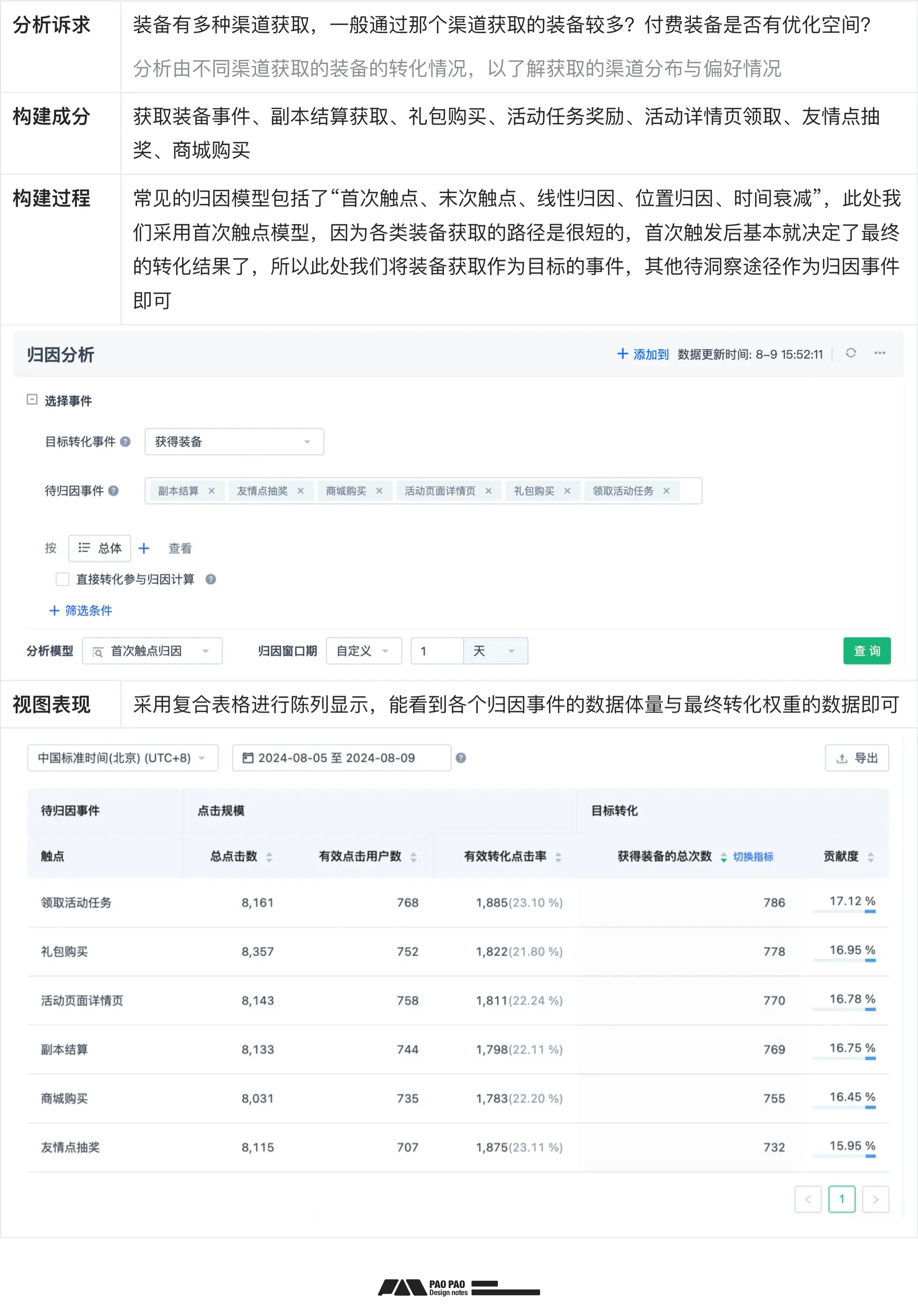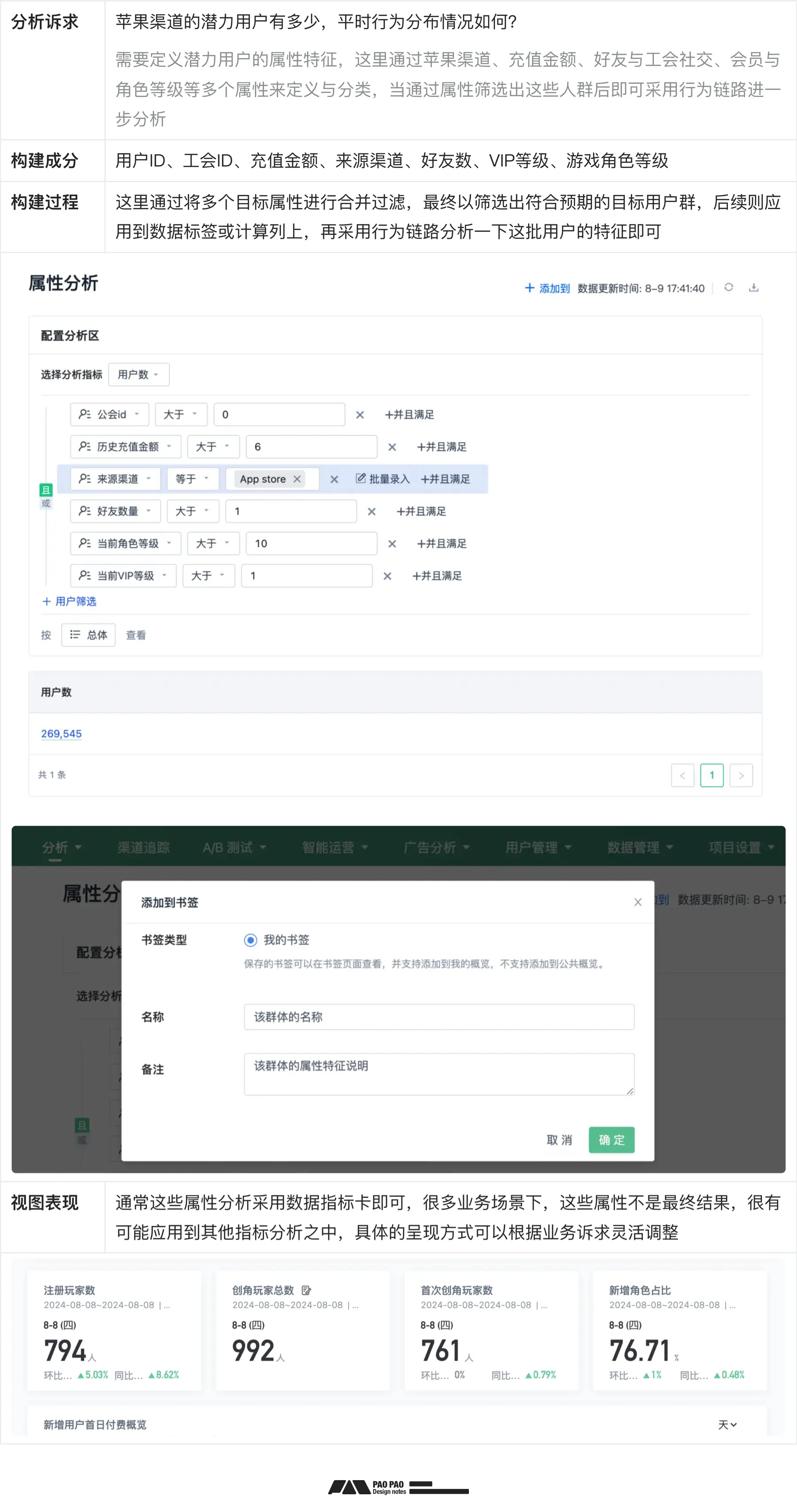 那么说完了数据选用,这里我用神策RPG游戏的Demo数据开始演示如何开始用户行为分析。 Demo地址:https://www.sensorsdata.cn/demo/game.html 事件分析 这都叫啥事儿!分析单个或多个行为指标的数据情况,可以观察出行为指标的趋势变化,不通条件下的数据体量、多个行为指标的趋势关系等。 ![]() 漏斗分析 哪儿出了问题?常用作消费决策场景、渠道增长、任务流程的转化分析,以了解转化流失的情况和原因深入分析。 ![]() 留存分析 还爱吗?常用作用户粘性评估、用户忠诚度评估、市场认可度相关评估对比。 ![]() 分布分析 哪里热闹哦?常用作业务场景的流量分布、不同时段的流量趋势或是核心行为指标的频次分布等洞察。 ![]() 行为路径分析 瞎逛啥呢?常用作用户在产品页面之间的跳转关系示意,以观察用户的活动路径、访问习惯、活动范围与偏好。 ![]() 归因分析 这事儿赖谁?常用作业务核心指标转化相关的事件贡献度分析,用作改善或调整运营策略。 ![]() 用户属性分析 这帮人咋样?常用作用户画像完善、行为趋势或偏好洞察、功能或营销效果对比、用户生命周期、用户标签分类 ![]() 五、行为分析篇实战小结 看到这里,且不说完全掌握相关处理方法与应用,至少各个节点的流程事项能通过数据源串起来了吧。在案例实践过程中,也都是用的一些相对简单的方法不是嘛,因为是案例演示,所以精细化与严谨程度是不够的,但真实的业务场景中,更多的也只是确保数据准确与口径一致,然后搭建报表时确保指标算法无误,并过滤出有效的数据。 ![]() 好了,那么当我们形成报表后,怎样才能知道报表对不对呢?下篇揭晓 下一章《(用户行为分析)-异常修复》终篇 感谢耐心阅读,如果觉得写的还行,就点赞关注一下吧,下次更新先通知你~ 上一章《(用户行为分析)-构建篇》回顾>> 专栏作家 泡泡。专注产品交互领域的体验设计师,擅长思考和UI呈现设计,喜爱交流探讨~未经许可,禁止转载 文章来源:“泡泡”,未经允许不得转载。 文章代表作者观点,版权归原作者所有,热传平台仅提供信息存储空间服务。 |