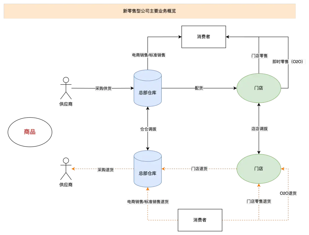 ![]() 如果是货不对板,也可以理解为“某个SKU缺量接收(0接收)”,同时“某个SKU超量接收(按实物到货接受)”,所以也可以把货不对板的场景演化为“缺量接收”。 ![]() 在实际的业务场景中,一般来说采购入库只会允许等量入库或者缺量入库,而不支持超量入库,如果出现了超量的情况,超出的部分要额外做单来承载,这样便于财务核算和供应商对账等。同样的道理,其他方式的入库也大概率会遵循这个逻辑,所以常见的数量差异场景就会缩减至一个,即“缺量的差异场景”。 二、新零售供应链业务中的差异场景 ![]() 通过上面的新零售主要业务概览图可以知道,在新零售型公司的业务中,常见的场景一共有:
