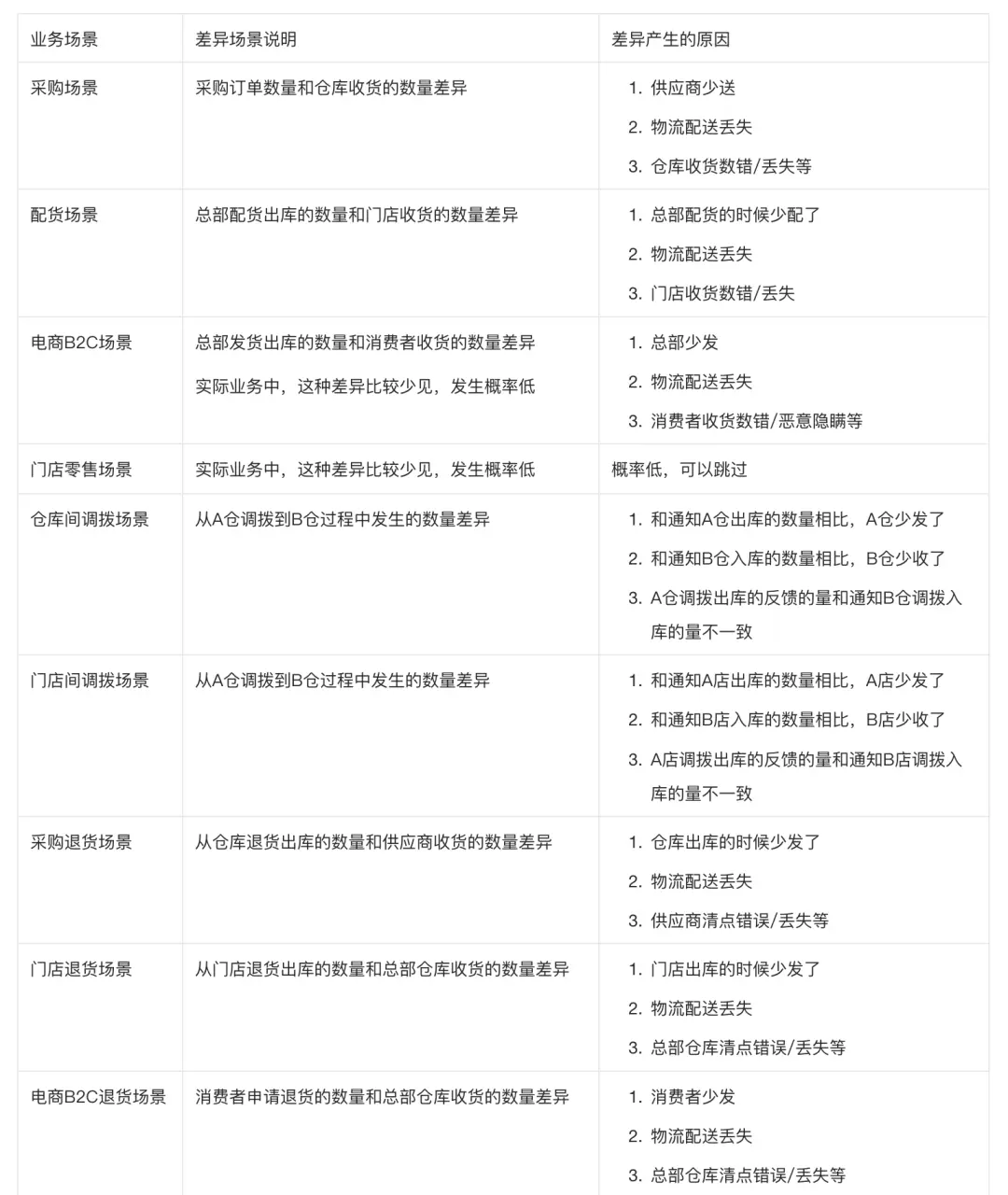 在这些场景中,都会涉及到“实物流”,“信息流”和“资金流”,其中“实物和信息”也一定会有几率产生一些差异,而这些差异就是在新零售供应链业务中常见的差异场景,我们需要先识别差异,定义差异,最后才能针对差异给出解决方案。 ![]() 通过上面的场景分析,可以观察出一个明显的规律,针对数量差异的业务场景,最常见的原因就是: