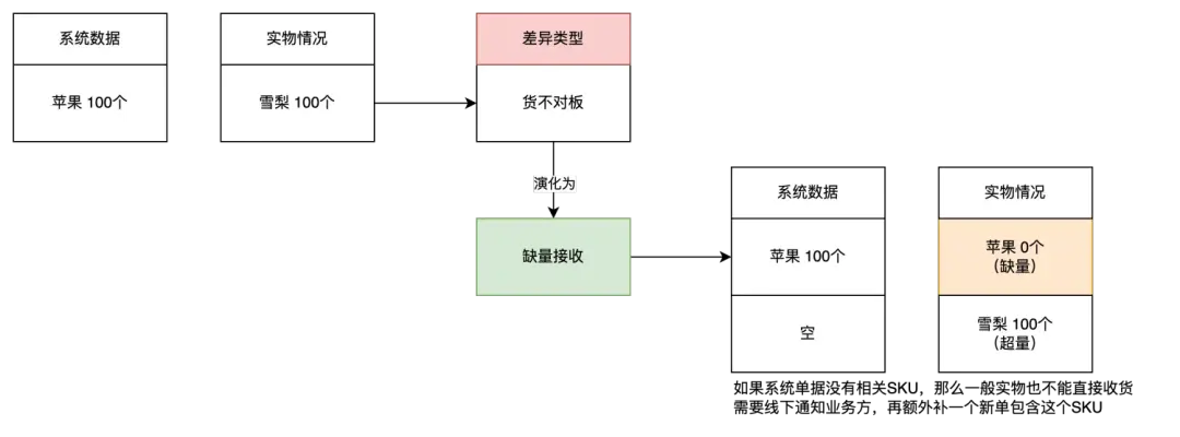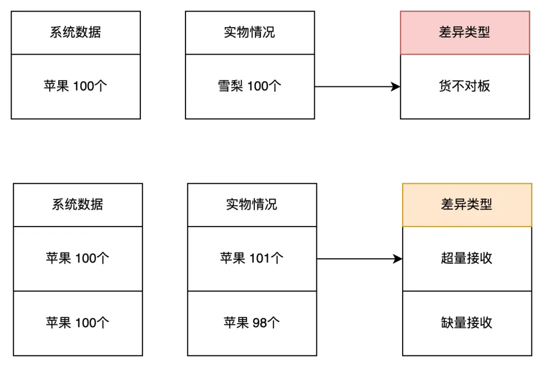 在新零售的供应链领域中,会有很多“系统数据和实物对不上”的场景,因为实物存储位置除了在仓库之外,还会存放在门店中,由此就会衍生很多“差异”的场景。 差异的场景看似是比较小众, 但是随着仓库数量增加,门店数量增加,单据业务量的增加,这一块的业务细节也非常之多,是需要特别重视和关注的。如果没有设计好一套合适的处理方案,出现差异之后很容易导致上下游扯皮,系统库存不准确,技术团队定位问题费时费力等诸多闹心的事情。 本文,就来简单拆解一下新零售供应链中常见的一些差异场景,以及相关的应对方式解析,这些知识不仅适用于新零售供应链领域,也适合其他领域的供应链场景中。希望大家看完之后,可以触类旁通,快速运用到自己的工作中。 一、差异是怎么来的?怎么理解差异? 在供应链实际的业务场景中,实物的处理往往需要依托于具体的指令和要求,而这些信息一般是通过系统的单据来承载的。例如说,供应商送货到仓库后,仓库需要接收清点这些货物,仓库需要根据WMS的ASN(预到货通知单)来执行对应的收货任务。 当系统单据给出的信息和实际操作的实物有不一致的地方,这部分就称之为差异。 还是拿仓库收货入库的场景来距离,WMS的ASN中告知仓库要接收“SKU 1”,数量为100,但是仓库可能收到的商品不是“SKU1”,也可能收到了“SKU1”但是数量并不是100,而是少于100或者多余100。 所以,常见的差异类型可以分成:
