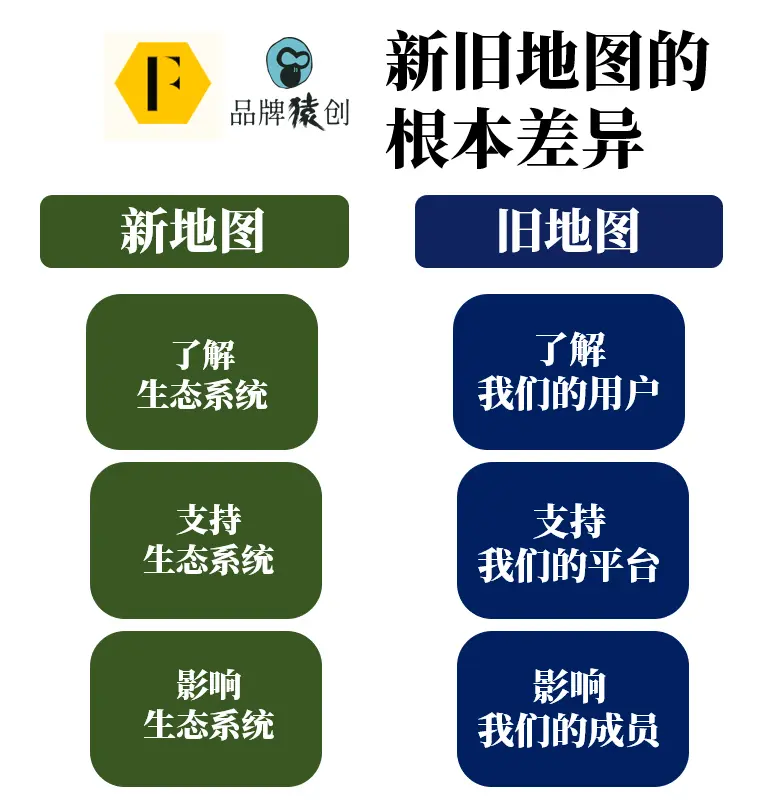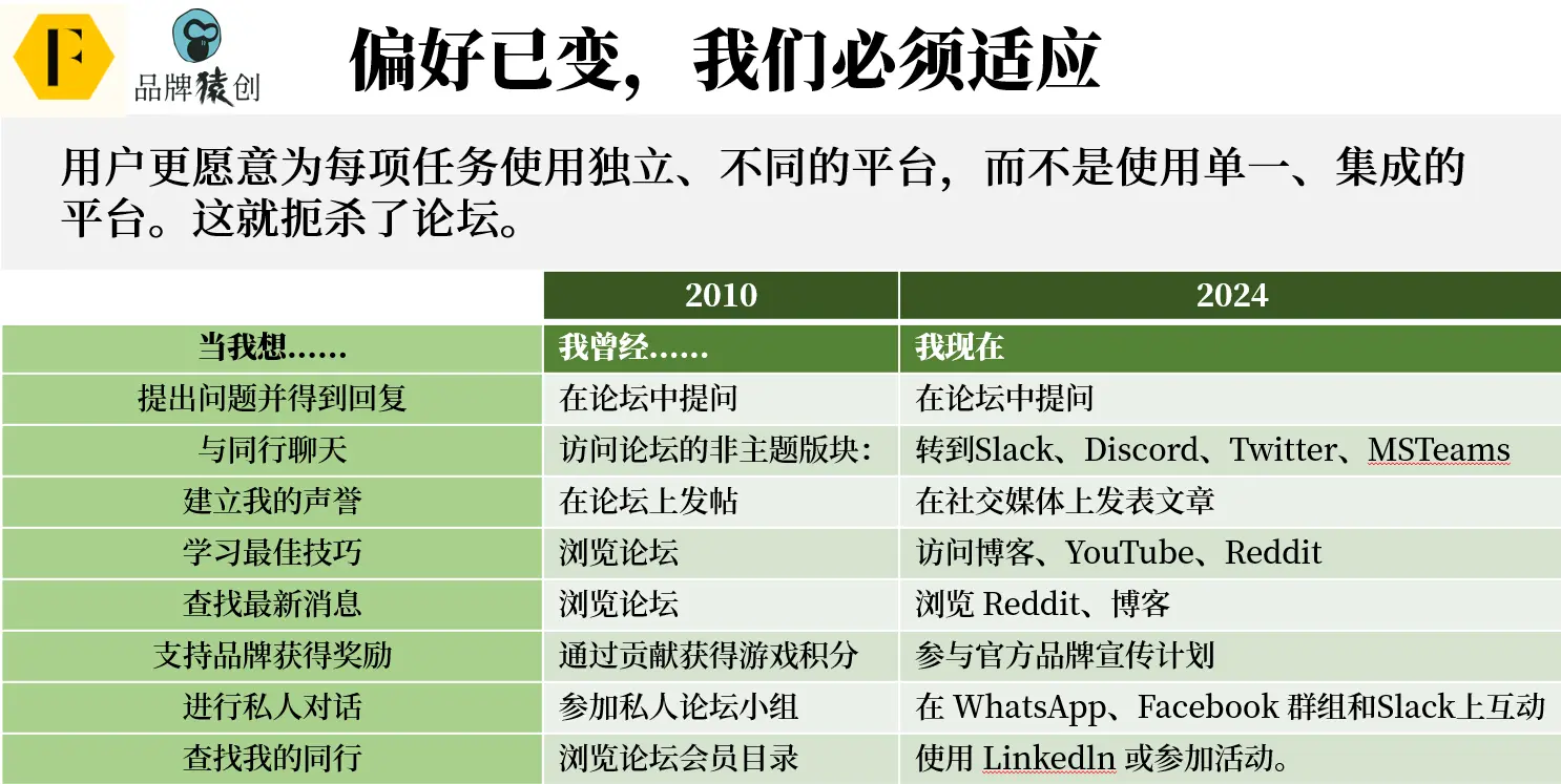 对于大多数人来说,答案很少是 “访问品牌的官方社区”。我们会发现,在过去15年中,我们的行为发生了很大变化,如下图: ![]() ▲ 原图来自feverbee网站,品牌猿翻译整理 另外,必须强调的是,许多品牌社区仍然活跃的唯一原因是搜索引擎的流量。 搜索引擎通常会显示长尾主题的论坛帖子。但是,如果谷歌开始显示来自自己社区论坛的答案,而不是你的论坛,那么你社区中的活动就会迅速枯竭。 这使得许多现有社区严重依赖于善变的搜索引擎不断变化的算法。这是所有官方社区必须面对的挑战。 2、新旧地图的本质区别——“生态”!新玩法在很多方面都与旧玩法不同,但最本质的差异是:出发对象不同。 ![]() ▲ 原图来自feverbee网站,品牌猿翻译整理 新地图的核心是建立在“生态系统”上的: