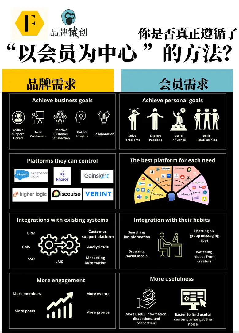 现在,一切都改变了。 如今,任何人都可以在几分钟内创建一个符合会员偏好的社区(微信群朋友圈活动点等)体验,甚至比品牌提供的还要好。 虽然一些品牌依靠组织自身的吸引力来推动社区的发展仍然有效;但对于新兴品牌或组织来说,没有依靠现有的生态系统创建社区基本不可能。 提醒一下,品牌APP也面临同样的问题——AAPP可以作为交付工具,但去连接用户和运营用户,早已没有价值。 更直白的说,东方甄选自建独立APP注定会失败。为什么这么说呢?因为人们的接触信息和社交生活的方式就这两年已经发生了翻天覆地的变化,你还指望人们会下载你的APP看直播,购物和分享内容吗? 无论你的APP有多么强大,活动有多么丰富,它都无法与已经渗透到各个生活生态平台的应用相比:抖音、快手、B站、小红书、美团等等。 二、为什么大部分品牌不愿意更新“地图”? 但为什么很多品牌没有更新过时的社区&社群创建地图呢?因为它在很大程度上满足了组织的需求(往往以牺牲会员的需求为代价)。 下图可以清楚看到问题所在: ![]() ▲ 原图来自feverbee网站,品牌猿翻译整理 组织或品牌通常希望: