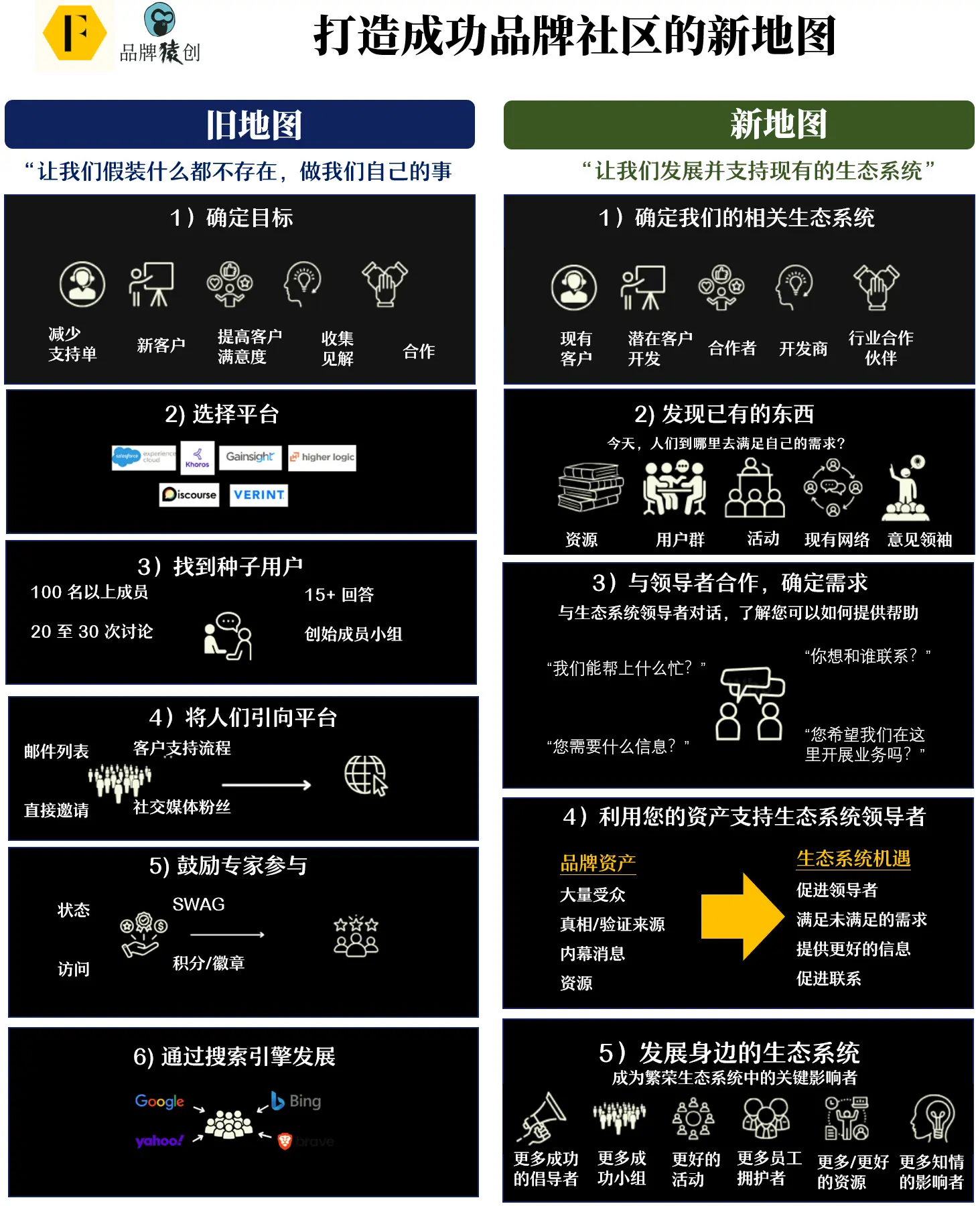 这自然会带来更多挑战(考核责任等),但这些都应被视为有趣的问题,而不是不可逾越的障碍。 下面是新旧“地图”执行步骤对比: ![]() ▲ 原图来自feverbee网站,品牌猿翻译整理 四、构建社区&社群“新地图”的5大步骤! 让我们一起探索新地图的5个关键步骤:①定义生态系统;②规划系统地图;③了解意见领袖需求;④确定提供资源;⑤发展&壮大生态系统。 1、第一步:准确定义你的生态系统!类似品牌定位,社群同样首先要定位:定义生态系统。如何定位则取决于你的「目标」。