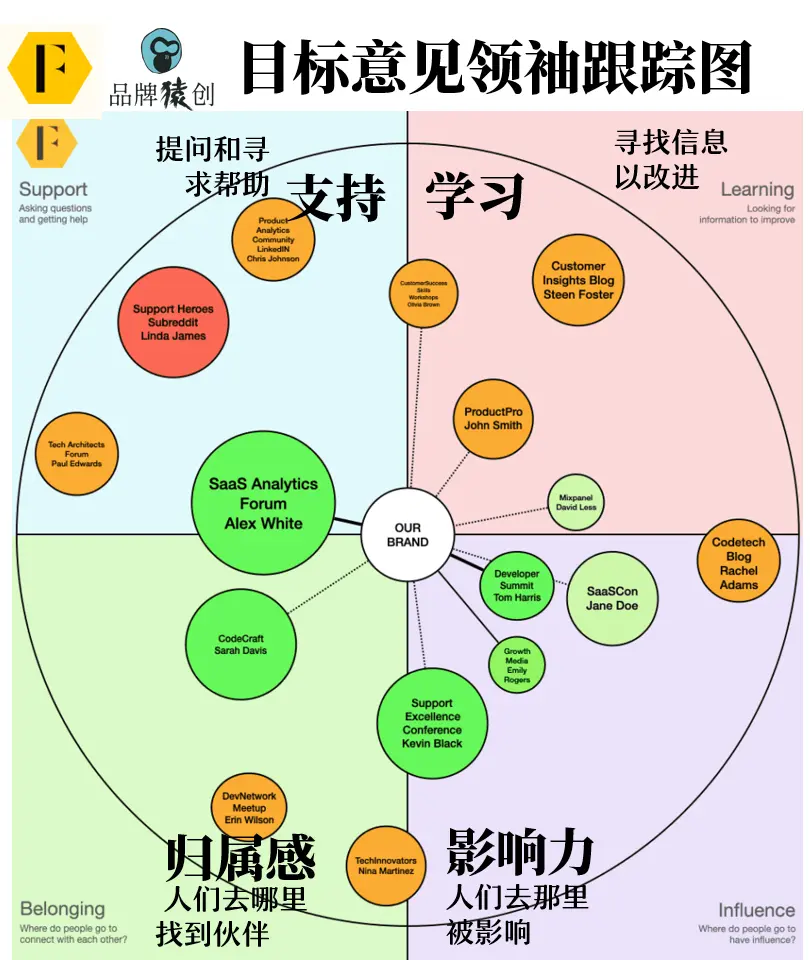 注意,询问每一个问题要追问“为什么”,这才能帮助你了解背后的原因和避坑。 下图应该可以帮助你对当前的社区&社群生态系统有一个非常具体的了解: ![]() ▲ 原图来自feverbee网站,品牌猿翻译整理 通过这一过程,大概能够了解你要支持社区&社群生态系统概况。 特别说明: 如果按地理位置定义社区,应确保你与该群体中具有代表性的样本进行了交谈。如果只与90后受众交谈,很容易得出一份只有90后团体、活动和人物的清单。 3、第三步:与生态中的意见领袖互动,了解需求和如何提供帮助!这一步的目的是探索「支持」生态平台中意见领袖的需求和帮助方法。 这需要了解每个活动、组织、时事通讯和博客的幕后推手,或者是任何第三方群组和社区。 如果不能确定这些活动背后的具体人员,就很难对生态系统产生很大影响。这通常不需要很长时间,你在各个平台上找到的大多数资源、团体和组织都会在某处提供详细的联系方式,稍加研究通常就能收集到更多信息。 我们说的是活动的“具体负责人”,而不仅仅是组织的最终负责人。这里通常不会列出首席执行官的名单,你想知道是谁影响了内容的创作,是谁负责具体的活动等等…… 一旦创建了这份名单,你就可以安排时间与这些群体中的每一位进行交谈,了解他们的动机,看看你能提供哪些帮助。 你的目标是了解他们的「目标」,并发现可以提供的帮助。 这意味着要了解需求和动机——他们为什么要发布/主办这些内容/活动?他们有什么样的受众?什么样的支持可能对他们有用? 这些问题应该包括: