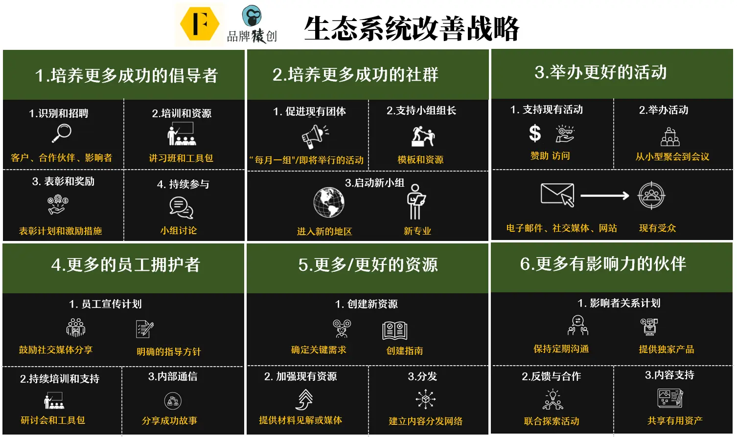 关键是要根据你的研究确定的领导者在生态系统中的影响力来安排活动。 5、第五步:发展&壮大生态系统。最后一步是「不断」执行计划,发展「周围」的生态系统。 下图是一个完整的战略改善步骤图: ![]() ▲ 原图来自feverbee网站,品牌猿翻译整理 这意味着要执行以下6大战略:
