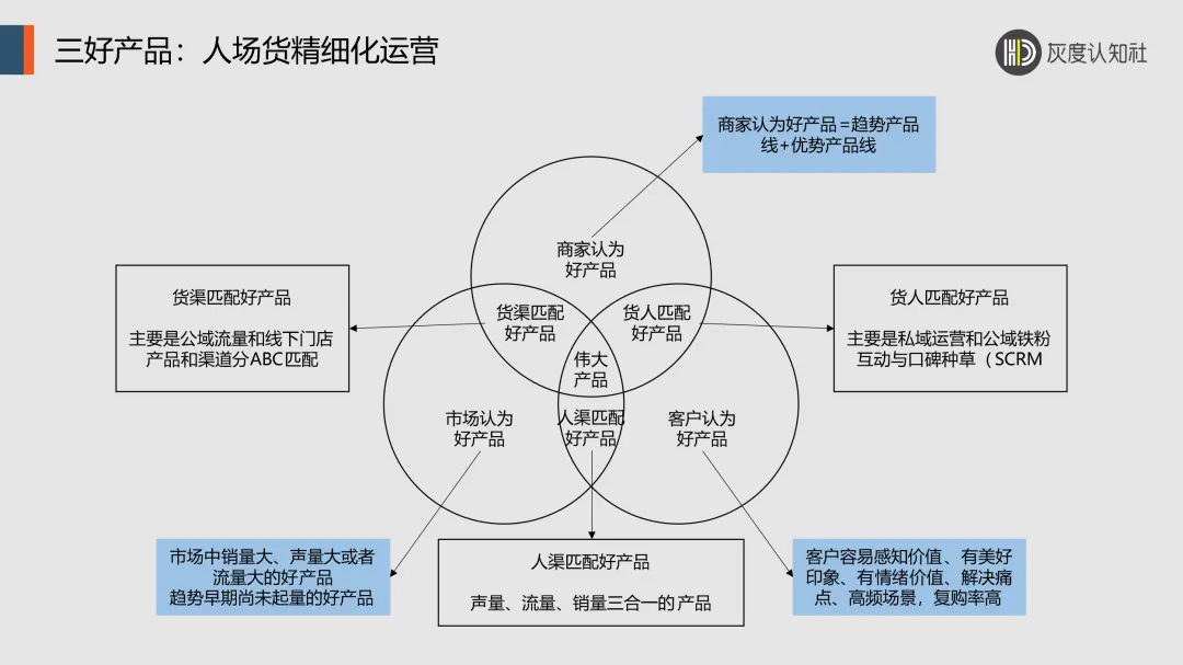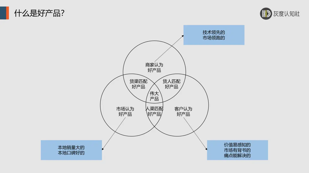 3、商业价值好,指的是公司有现金流有利润。既要考虑符合公司未来战略,同时要兼顾公司当下的资源和能力,还要准备好竞争对手的冲击和博弈。 2. 市场认可的好产品我们经常犯一个错误,把市场合并起来进行统计分析。在这种统计数据中,大量的局部规律都被平均掉了,看不出来了。从而使我们面对一个假象的超级大市场,反而失去了对细分市场的敏感度,大单品也打不出销售宽度和深度。 市场认可的好产品,包括:客群密度、流量动线、竞争对手三个维度。 1、客群密度是什么意思?广义上说,只要花钱,我们理论上可以买到无限量的客户从门店前或电商账号上经过。但是,由于目标客户密度太低,花钱一算账,转化率太低了,企业生存不下去。 于是,我们看到商家在线下首先找到是商圈,因为商圈就代表着一定的客群密度;商家在线上就复杂的多,不是一个简单地入驻天猫、京东或者在小红书、抖音开一个账号。 线上特征是:平台即城市,客群即商圈,社群即商场,账号即门店,文案即导购。 2、流量动线是什么意思?就是线下选址的核心:位置、位置、位置。没有好位置,就没有流量,更谈不上动线。 对于线上,流量是有支付能力的潜在需求。最简单的方法,就是我们用各种关键词去拦截客户的搜索,再想办法引到商家的落地页上去进行销售转化。 3、如果商家所在的市场,完全没有竞争对手,那从一定的意义上说,这可能是一个微不足道的小市场;反之,如果竞争对手过多过强,那商家的竞争性排名才代表着市场地位和竞争优势。 一个数字化水平比较高的公司,它的市场颗粒度定义可以在商圈,可以在商场,甚至可以在门店。这样货渠匹配的数字化成果,既支持了商品效率,也支持了渠道效率。 3. 客户认可的好产品现在为什么卷?因为,大多数企业,还是以产品为导向,以经营产品为主,然后去向市场要流量,向客户要转化率。 摆脱产品同质化竞争和价格战的最好方法,就是双向经营,一边经营产品,一边经营客户。 那客户眼中的好产品,是什么样子的呢? 包括:价值体感、从众心理、个人偏好三个维度。 1、什么叫价值体感?我们前面说过,产品价值和客户价值,不是一回事。产品价值的强项可能是芯片,客户可能完全不懂芯片好与坏,他买的是用来工作的电脑。 这时,产品价值是卖点,客户价值才是买点。客户价值又分为易感知价值和难感知价值。 我们这时,再把客户按照购买欲望分为:高欲望、中欲望、低欲望。欲望是“所见即所想、当下即成交”的巨大动力。那么,如果客户价值很难感知,甚至都没有一点体感,那欲望从何而来呢? 所以,价值体感,既可以是高欲望下买点和卖点之间产生了化学反应,也可以是中欲望下进入了客户购物路径(被种草,被科普,被体验),还可以是低欲望下接受了商家的行为诱导(比如:加入会员第一杯免费)。 2、什么叫从众心理?大部分的消费者,在没有形成个性化偏好之前,或者在产品生命周期的早期,往往戒备心理非常强,或者无从判断和选择。此时,信任有背书、专家有证言、销量有排名的,这些都容易给客户产生批量的安全感,继而促进了大众化销售。 3、什么叫个人偏好?当消费者有购物经验,或者产品极大丰富后,客户的喜好就会分化。客户对品牌的忠诚度,对产品功能之外的情绪价值,都会提升。 三、三好产品是怎么促进业绩? ![]() 就像上图,如果我们幸运地找到了三好产品三者之间的交叉点,那我们就找到了:伟大产品。 可是,伟大产品是可遇而不可求的。 我们往往要从两两交叉开始下手,逐步迭代和优化我们的经营能力和组织能力。