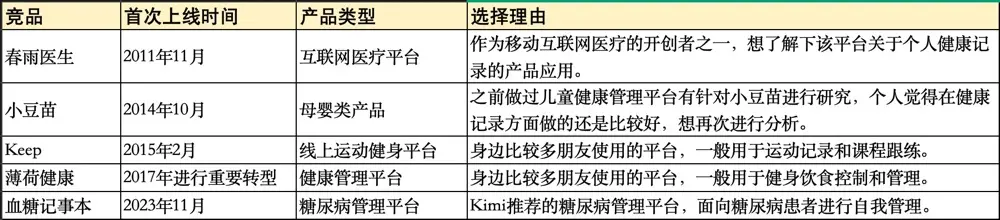 笔者近期在做有关于健康记录相关的产品,体验了相关产品后想就此进行对比分析。 一、竞品筛选 根据个人经验和向周边朋友调研情况,筛选了一些竞品进行分析,竞品按首次上线时间依次排列: