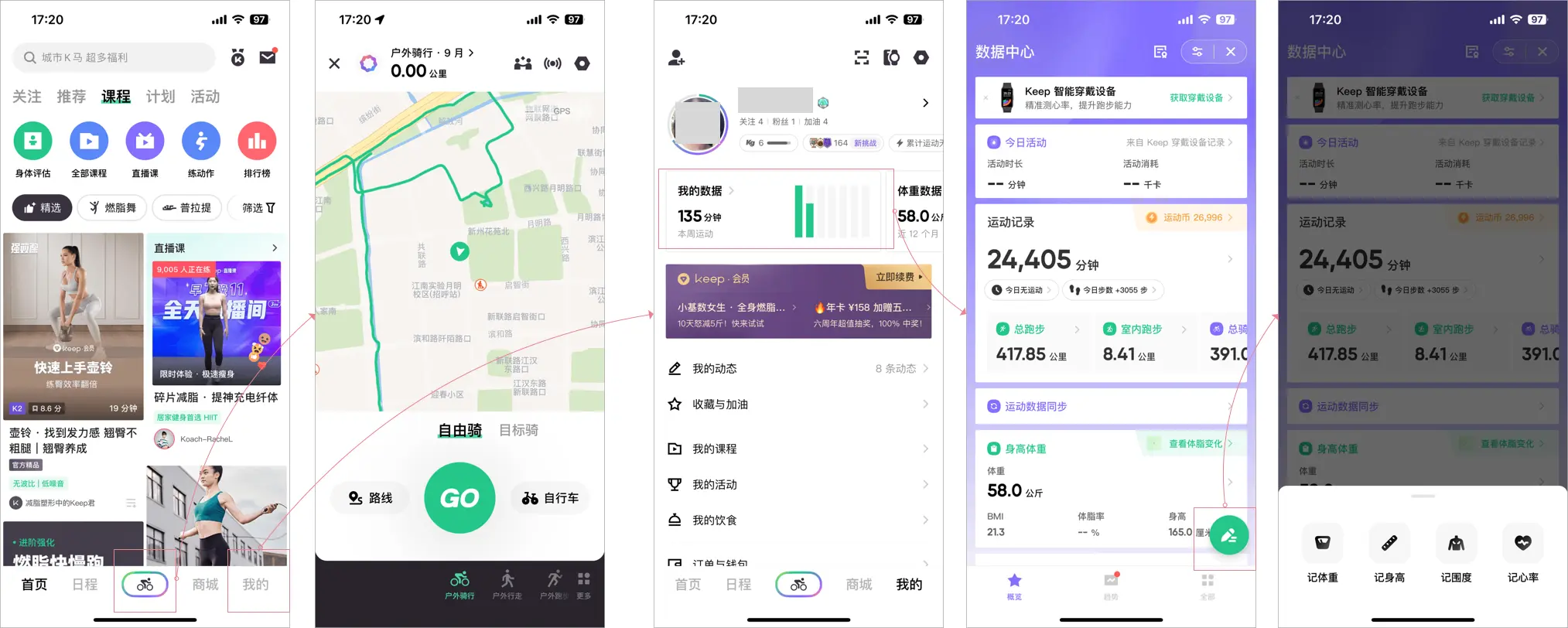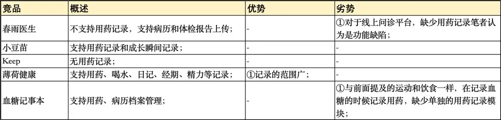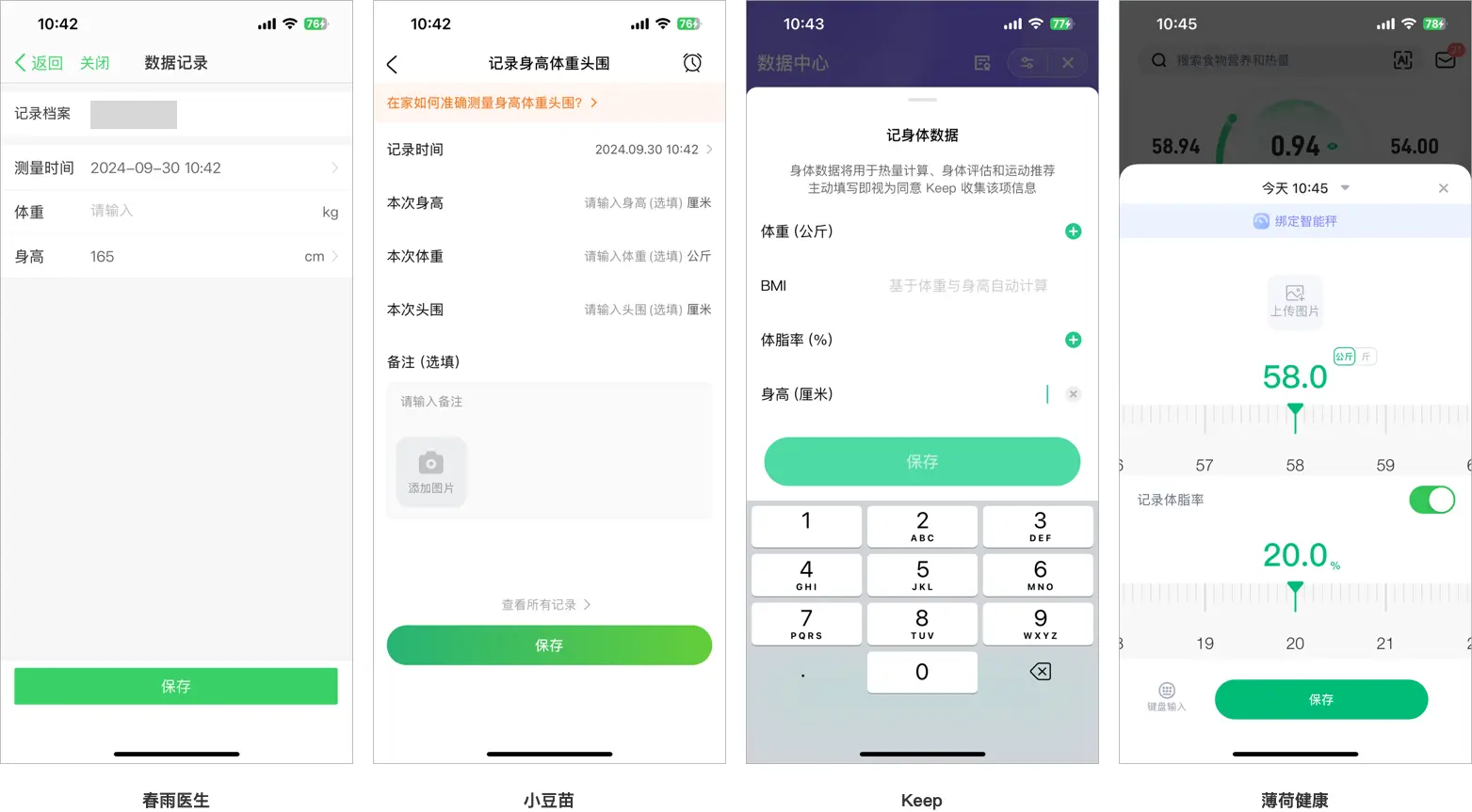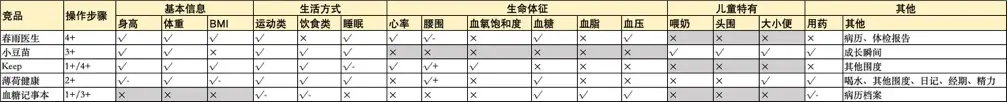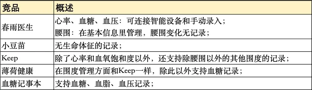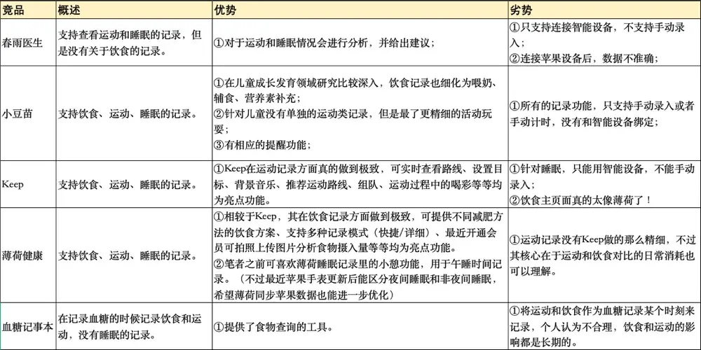 2. 小豆苗小豆苗的竞争优势在于其的疫苗接种功能,辅助功能为健康记录,而且面向是0~6岁的儿童,命名为“喂养记录”,需要至少3步触达:①点击首页的“喂养记录”-》②点击“记录”-》③点击记录日常类型。 ![]() 3. KeepKeep在健身运动方面做到极致,因此其运动的记录非常便捷,点击首页的中间快速记录按钮,至少一步即可进行运动记录,而且会跟随当前潮流,把热门的骑行放第一个入口。而对于其他的健康记录,则至少要4步:①首页点击“我的”-》②点击“我的数据”-》③点击“记录图标”-》④选择对应的记录类型。 ![]() 4. 薄荷健康从薄荷健康的slogan“用薄荷减更多”即可知薄荷主旨在减重管理,其首页即展示各类健康记录卡片,并且体现最近一次记录信息,记录模式也是最方便的,部分类型只需要一步即可达到记录页面,例如“喝水”,首页小卡片上直接显示“增加”按钮,另外一部分,可通过首页卡片进入详情后进行添加或者通过首页“+”按钮再选择需要记录的类型进入记录页面,简单2步操作。 ![]() 5. 血糖记事本血糖记事本将血糖记录历史和记录入口放于首页,血糖记录一步触达;而针对其他记录例如血压等,操作步骤就比较长,至少需要3步,①从首页切换至工具-》②在工具页面选择“血压记录”-》③血压记录点击“添加血压记录”。 ![]() 三、健康记录 接下来笔者将根据项目类型进行对比。 1. 基本信息基本信息涵盖身高、体重、BMI。 各个产品记录页面展示: ![]() 各个产品功能概述和优劣势对比: ![]() 若单从基本信息来看,针对成年人记录,笔者会推荐薄荷健康,操作简单便捷;若是针对儿童,则会选择小豆苗,除了基本身高体重记录外,结合儿童生长曲线给出育儿指导。 2. 生活方式生活方式涵盖运动、饮食和睡眠。 因涉及页面比较多,笔者不一一截图对比了,直接来看各个产品功能概述和优劣势对比: ![]() 针对生活方式的记录,若是针对儿童,笔者会觉得小豆苗更适合;若是像笔者这类对体重管理不看重,但是关注日常运动量、运动路径以及运动时需要鼓舞的人群,笔者强烈推荐Keep;若对体重或者饮食管理非常严格,笔者会推荐薄荷健康; 3. 生命体征接下来看看生命体征,纵向对比,貌似没有一个产品涵盖所有的体征项目,尤其是小豆苗,没有任何生命体征相关的记录。 ![]() 聊到生命体征记录这部分,其实没有较明显的优劣势,大体都是连接智能设备读取数据并且用图表形式展示,此外,支持手动的录入,差别仅在于支持的范围。