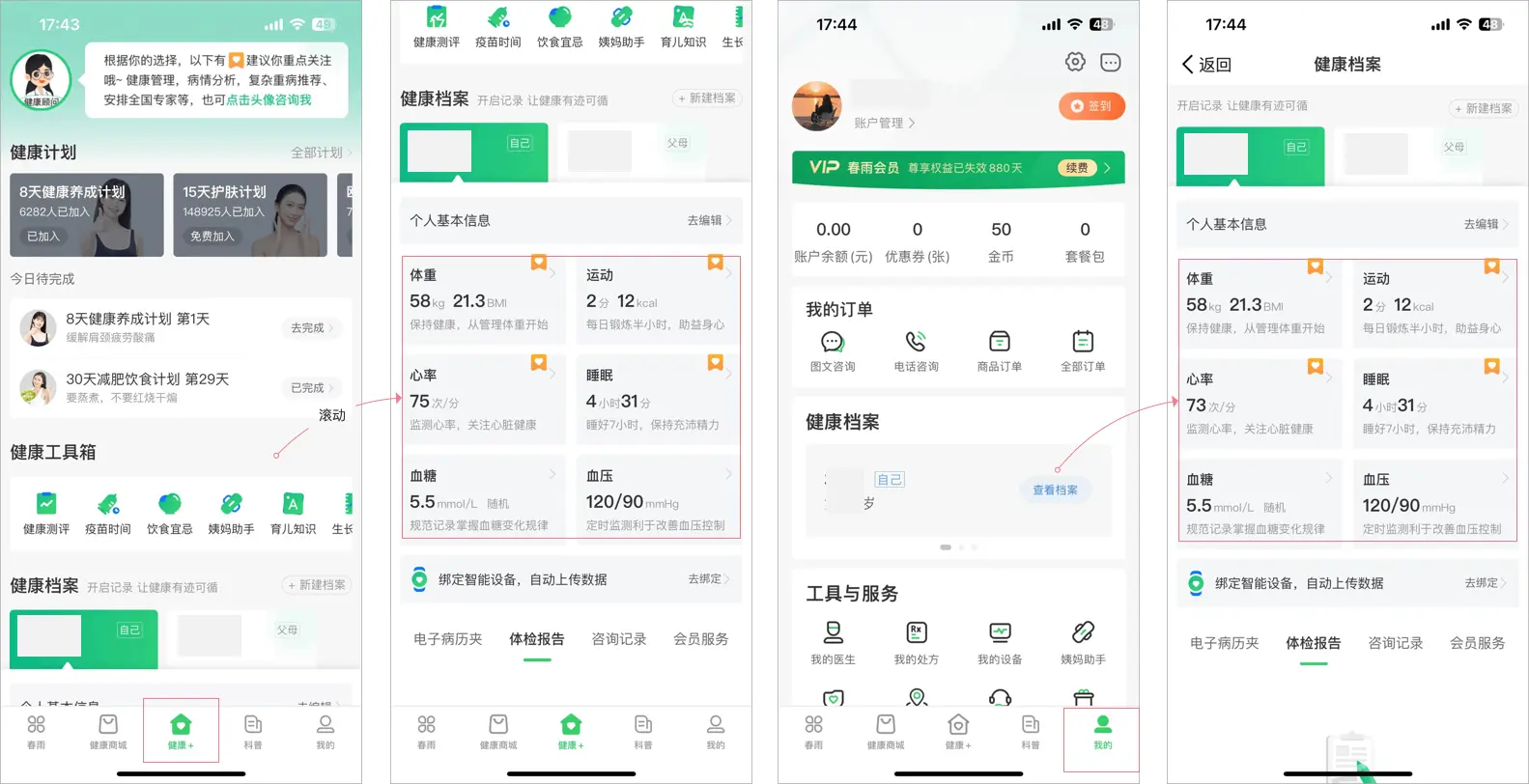 ![]() 二、产品布局 从入口层级可以看出不同产品对健康记录的重视程度,将记录的项目划分成几个类型分别为基本信息、生活方式、生命体征、儿童特有和其他,分别来看各个产品的布局。 ![]() 1. 春雨医生春雨将个人健康记录归于个人健康档案内,支持管理家庭成员的档案,若需要进行本人的对应类型的健康记录,操作步骤至少需要4步: ![]()