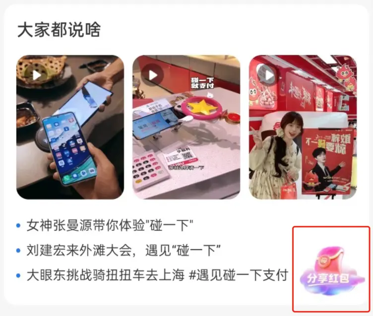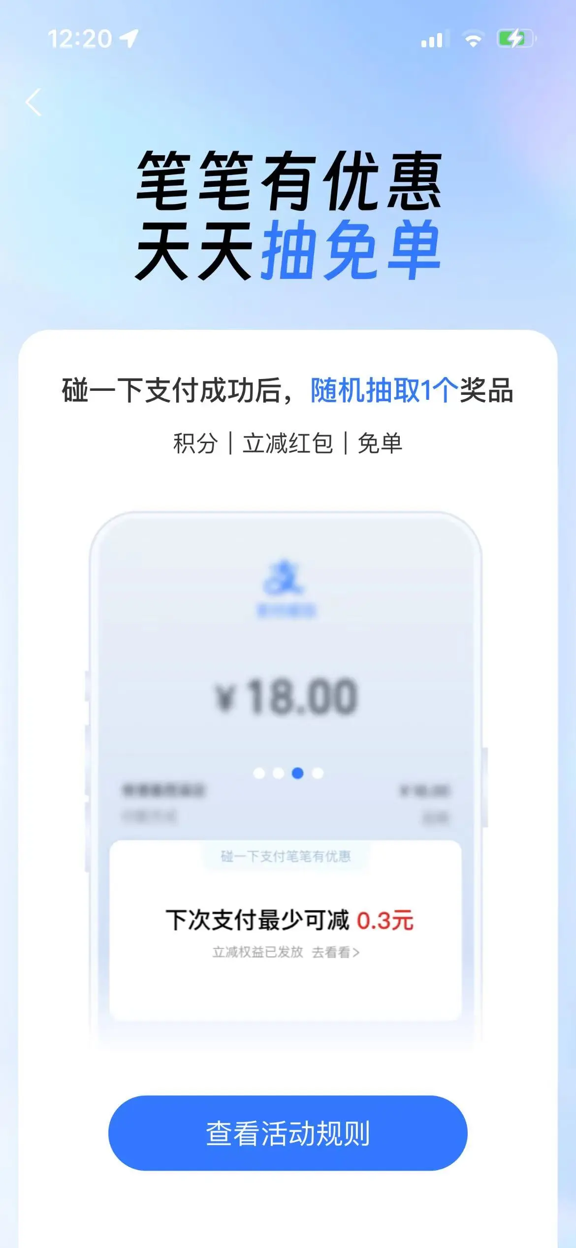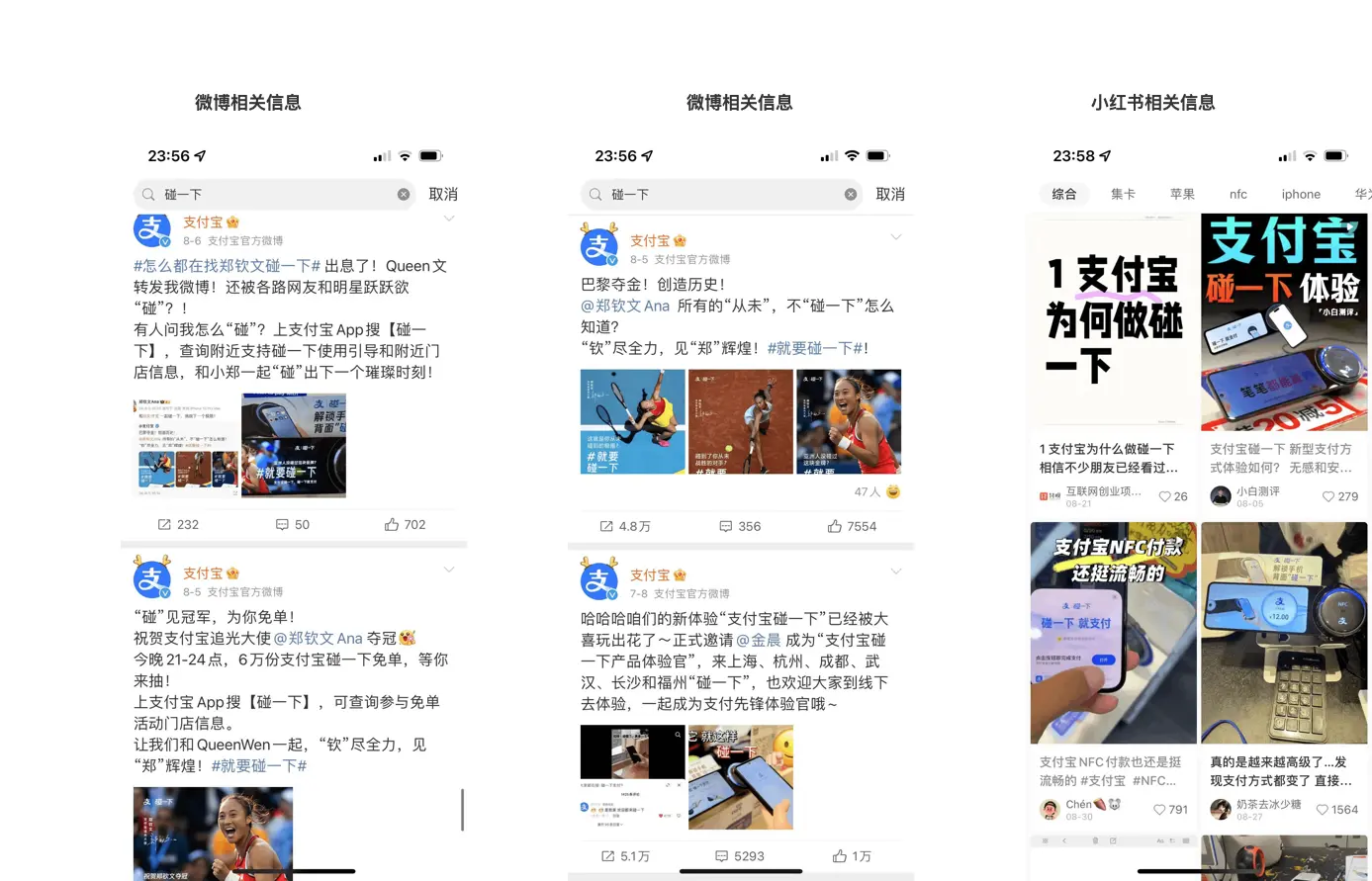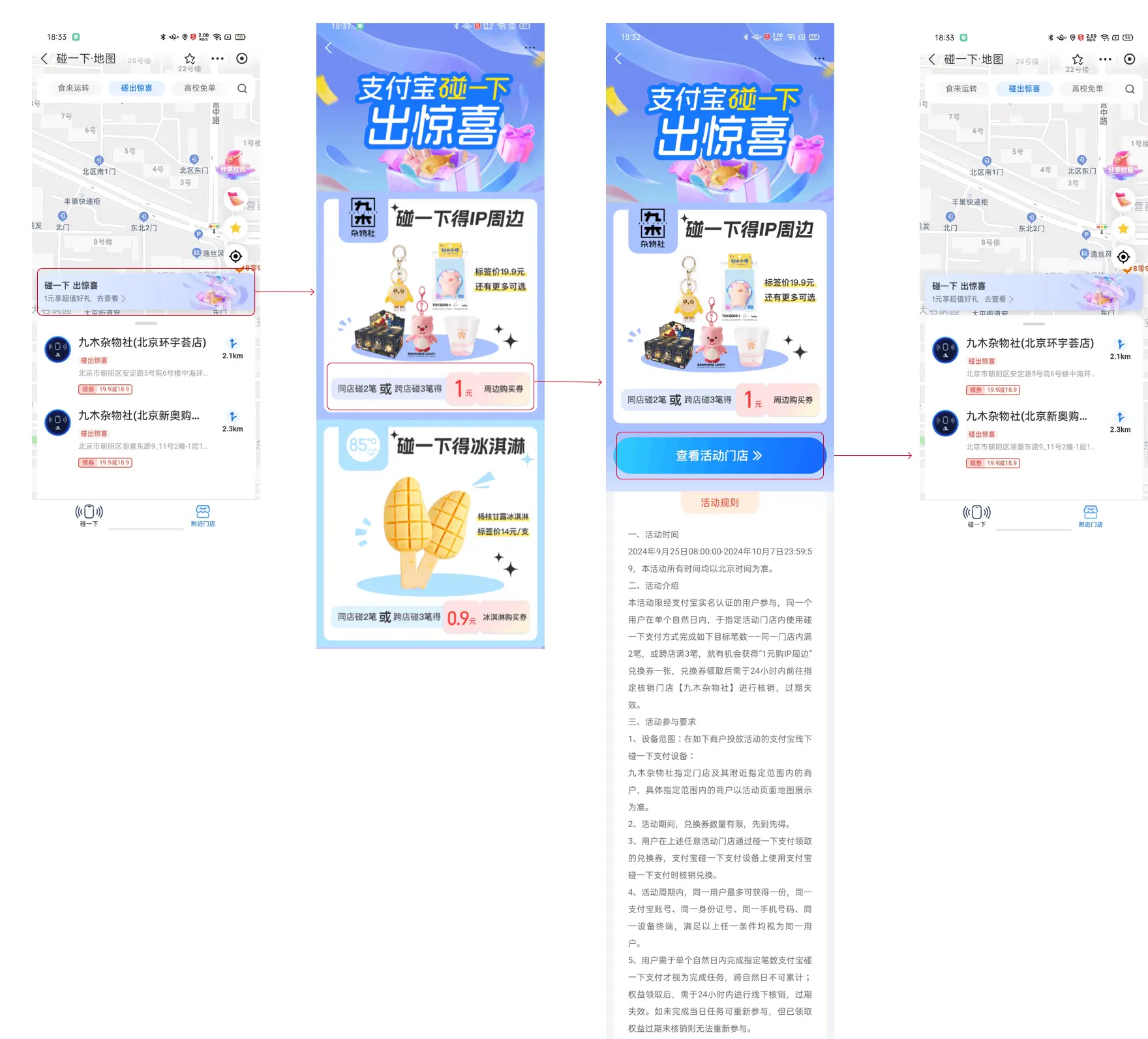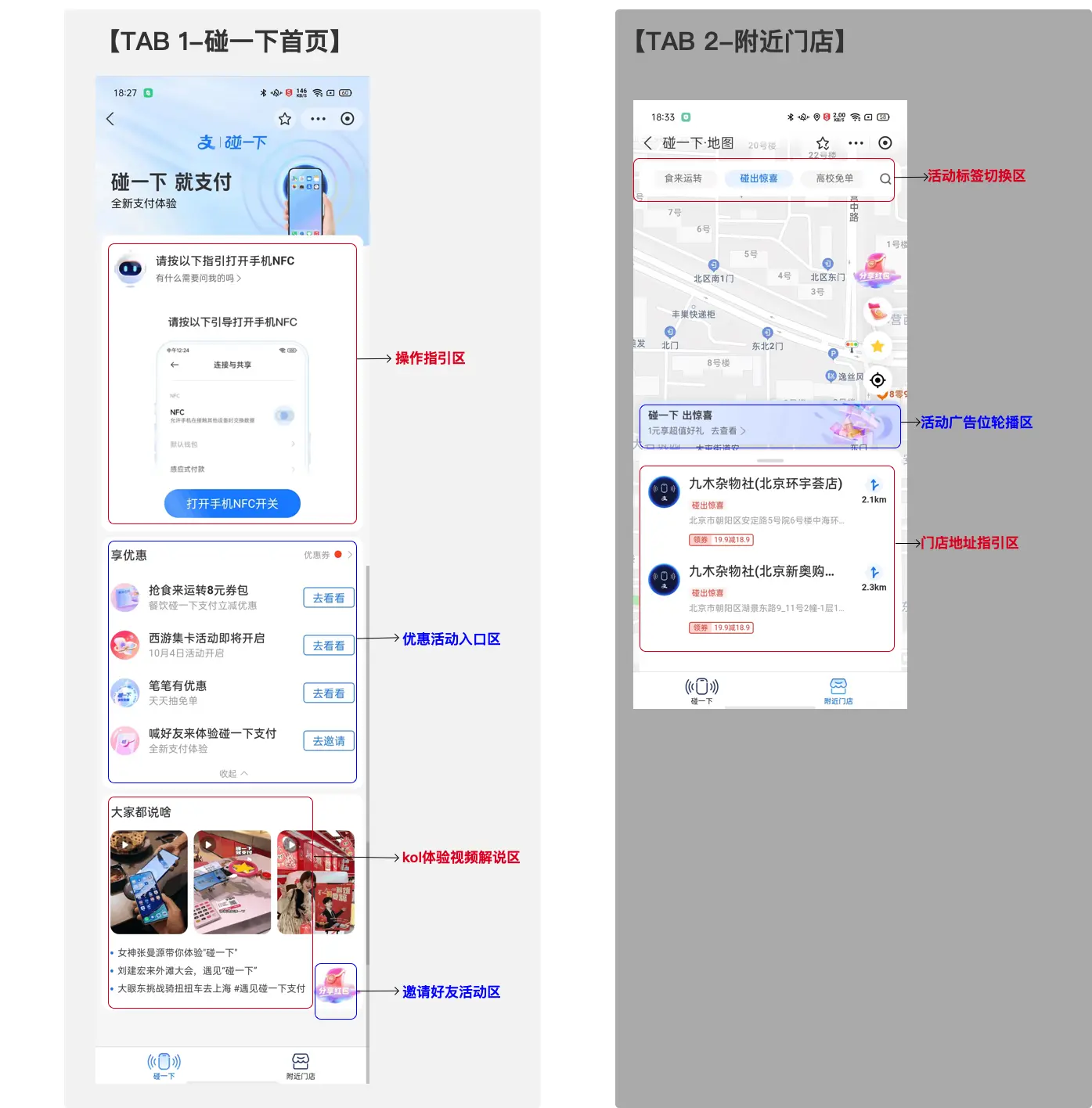 最近被支付宝新升级的支付方式“碰一下”新闻刷屏,据公开资料显示,支付宝“碰一下”上线以来2个月的推广速度是刷脸支付同期的6倍,深受年轻人欢迎。 01 支付宝“碰一下”是什么? “碰一下”是支付宝于2024年7月8日推出的支付功能。用户无需扫码,在手机解锁和NFC开启状态下,碰一下支付宝支付设备跳转支付确认页即可完成支付。 该功能是条码支付体验的新升级,原来扫码支付得需要解锁手机、打开 app、寻找付款码三步才可支付,而“碰一下”直接拿手机碰一下,只需1步即可支付,大大提升了支付的便利性。 02 “碰一下”运营活动拆解 “碰一下”功能上线2个月的推广速度是刷脸支付同期的6倍,除了自身功能便捷性的原因之外,还离不开平台精心策划的运营活动。 本文重点将围绕“碰一下”的活动玩法进行拆解分析,为活动运营工作者就如何提升新功能使用率的问题提供学习参考。 1. 丰富的优惠活动策略1)笔笔有优惠,天天抽免单 优惠政策:只要使用碰一下支付,即可抽奖,奖品范围有:积分、减免优惠红包、免单。每个用户不超过100份奖品。 ![]() ![]() 以免单为最大优惠噱头,吸引新用户到店体验“碰一下”支付。 (下图为支付宝首页banner广告图) ![]() 2)8元餐饮优惠券——“食来运转卡” 支付宝与指定线下餐饮店合作,用户可去活动入口领取1张食来运转卡,卡内含4张2元优惠券,在规定有效期内,只有使用“碰一下”支付,才可享受优惠减免。 ![]() ![]() ![]() 3)西游集卡兑好礼 每使用1笔“碰一下”且实付金额达1元以上,即可随机获得1张西游记人物卡,卡片范围有:沙僧卡、八戒卡、唐僧卡、悟空卡、白龙卡。卡片可兑换各种奖品或红包,活动期间每天10点-22点整点更新奖品库存,以此来吸引用户多次体验碰一下支付功能,培养使用习惯。 ![]() 4)邀新用户体验,得红包 该政策意在利用社交裂变效应扩大用户基础,优惠内容简单总结为:邀请用户体验,双方都有红包奖励。 政策说明:自己分享个人专属二维码,邀请好友扫码,好友即可得到随机面额的红包(仅支持在“碰一下”支付场景可用)。只要好友使用“碰一下”支付,自己就可领随机面额的红包奖励。 官方提示,如果是支付宝纯新用户,红包金额会越大。 ![]() ![]() 5)“碰一下”支付得1元周边购买券 与指定线下门店合作,同店使用2笔“碰一下”或者跨店使用3笔”碰一下“,即可获得”1元购IP周边兑换券“1张(即满19.9元减18.9元),比如标签价为19.9元的周边,1元即可购买,兑换券有效期为24小时。 ![]() 2. 注重用户体验的界面交互进入活动界面,底部有2个TAB,分别为【碰一下】首页和【附近门店】页。【碰一下】首页核心功能是操作指导和活动入口引导,【附近门店】页核心功能是地理位置导航。 ![]() 1)TAB 1-【碰一下】首页功能区拆解 (1)操作指引区 会根据用户手机当前情况,灵活调整展示不同的指引说明,同时提供机器人自助解答,降低操作理解成本。 ![]() (2)优惠活动入口区 首页展示所有重要的优惠活动主题,方便用户快速进入自己感兴趣的活动说明页。活动玩法信息参照在上文提到的【丰富的优惠活动策略】内容。 ![]() (3)kol体验解说视频 首页下方专门设置了【大家都说啥】板块,主要内容是kol使用“碰一下”的过程体验解说视频,激发用户对新鲜事物的好奇心,也增加了信任背书,期望吸引用户尝试新功能。 ![]() (4)邀请好友活动 邀请好友活动在首页有2个广告位入口,一个是【优惠活动区】的最后一行活动“喊好友来体验碰一下支付”,另一个是下图的“分享红包”悬浮图片广告位。 ![]() 2)TAB 2-【附近门店】页功能区拆解 该页面的核心功能是为用户提供可参加活动的附近线下门店位置(猜测提供的是附近4km以内的门店)。页面上方会设置不同的活动标签,标签范围有:笔笔赚、食来运转、碰出惊喜、高校免单。同一个门店可参加1个或者多个活动,门店信息也会显示活动标签。 点击不同的标签,下方的门店指引区信息也会随之切换。点击具体的门店按钮,即可唤起地图导航,整体用户流程路径设计清晰、操作丝滑。 ![]() 3. 多渠道宣传线上社交媒体:支付宝利用微博、抖音、小红书、微信等社交平台,除了官方之外,也会邀请KOL、网红、明星合作,通过图文或短视频等形式展示“碰一下”功能的使用方法和优惠活动,突出功能的便捷性,提高用户认知度。 社交媒体信息示例图: ![]() 官方app:在支付宝app首页设置活动宣传banner,以抽免单为活动噱头。 支付宝app首页banner图: ![]() 线下商圈&多品牌合作试点推广:选择一些具有代表性的城市和知名品牌商家进行试点,通过创意广告牌、海报等物料和专属优惠活动来宣传 “碰一下” 活动,吸引用户关注和体验。 从公开的新闻媒体报道了解到,当前支付宝“碰一下”已服务重庆、上海、成都、武汉、长沙、杭州、青岛等50多个城市,与知名品牌联合推广,注重先覆盖人流密集区域商圈。 以下截图来源于湖南日报: ![]() ![]() 创意视觉设计:设计创意宣传海报,突出 “碰一下” 的活动亮点,搭配醒目的色彩和有强烈情绪的文字表达,比如“敢不敢”、“爽”等,常用感叹句式或者反问句式,吸引用户的注意力。 以下图片来自网络: ![]() 专业权威科技大会宣传:今年9月5日-9月7日,上海举办了的以“科技创造可持续未来”为主题Inclusion·外滩大会,被全球科技趋势报道的权威媒体《