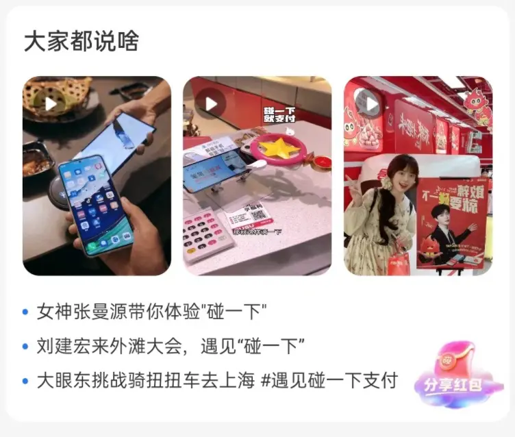 4)视觉设计创意有趣:宣传海报以明亮艳丽的色彩和充满强烈情绪表达的文字(多用于感叹句式或者反问句式)相结合,能快速抓用户眼球。 2. 建议以下建议意在提升“碰一下”活动的用户参与体验和功能使用率,仅代表个人看法,并非完全正确,仅供参考。 1)活动界面的【大家都说啥】模块,视频资源较少。如果能丰富更多有趣角度的视频体验,且赋予不同的标签,比如设计操作解说、网红店打卡、花式玩法、前沿科技等标签,应该更能吸引用户了解并体验“碰一下”功能。 2)可以设计一些趣味的用户互动活动玩法,既提升用户参与率,又增加该功能的信任背书。比如: