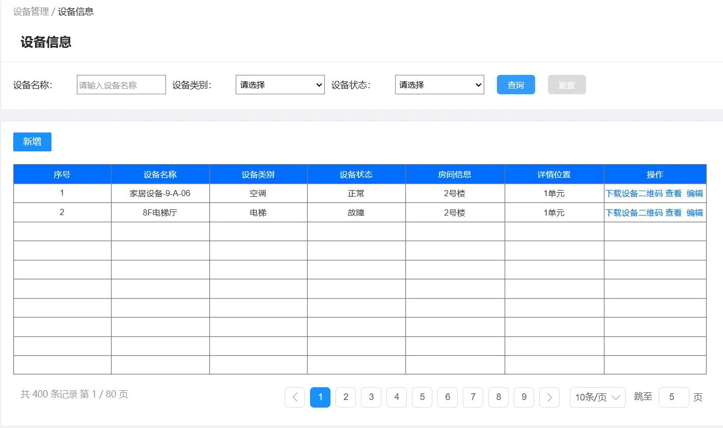 - 点击新增按钮,跳转到设备维保新增页面;设备新增页面,设备编码、设备名称、设备类别、具体位置、使用年限、安装日期、设备状态、联系人、联系电话和设备图片必填;