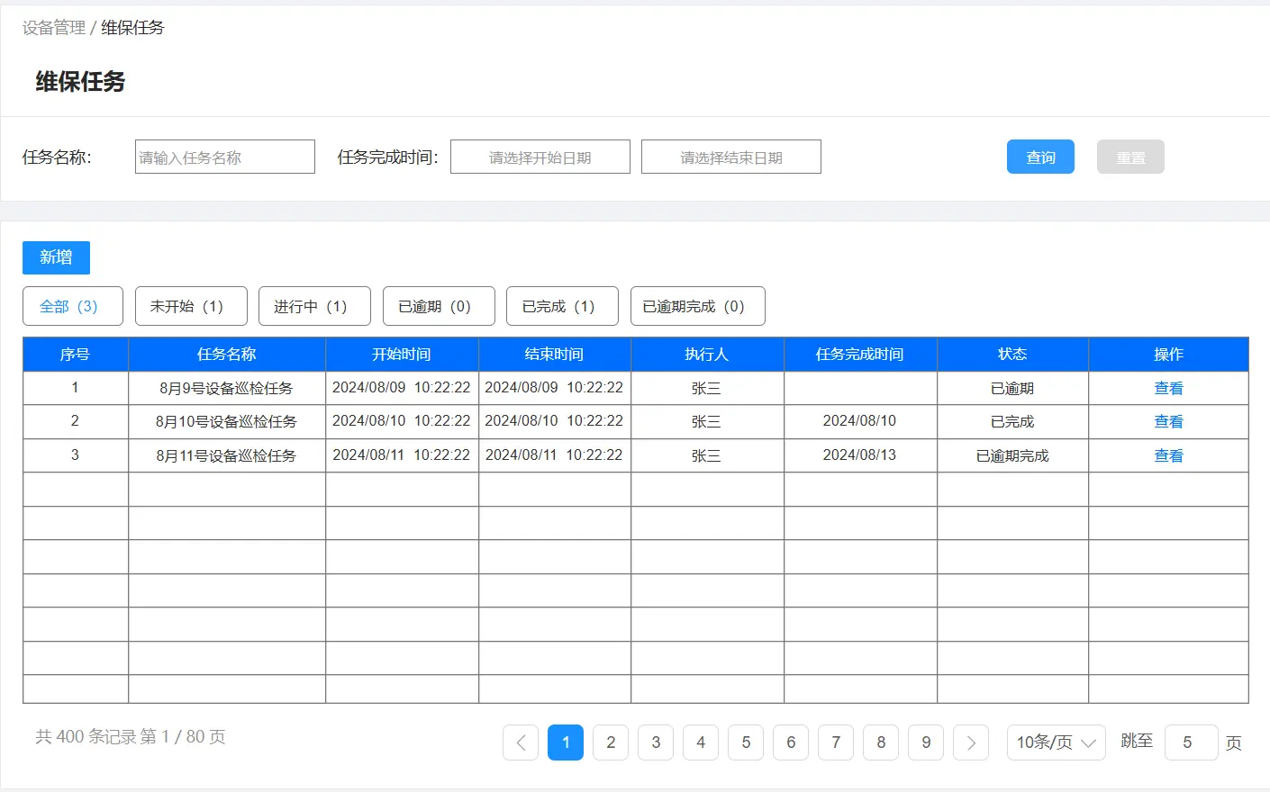- 状态说明:未开始,设备维保任务执行人未点击开始设备维保任务;进行中,设备维保任务执行人开始设备维保任务,设备维保任务关联的维保设备未全部保存维保结果;已逾期,当前时间超过设备维保任务结束时间,设备维保任务关联的维保设备未全部保存维保结果;已完成,当前时间小于设备维保任务结束时间,设备维保任务关联的维保设备全部保存维保结果;已逾期完成,当前时间大于设备维保任务结束时间,设备维保任务关联的维保设备全部保存维保结果;
