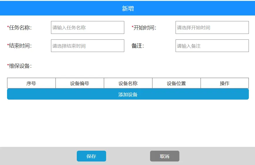 - 点击新增按钮,弹窗显示新增页面;新增页面,任务名称、开始时间、结束时间、执行人和维保设备必填;