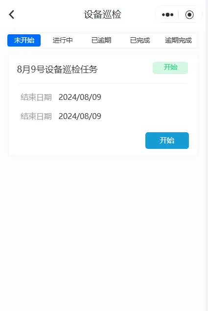 - 设备巡检列表页支持按照设备巡检状态查询,设备巡检状态:未开始、进行中、已完成、已逾期和已逾期完成,默认显示未开始的设备巡检信息。