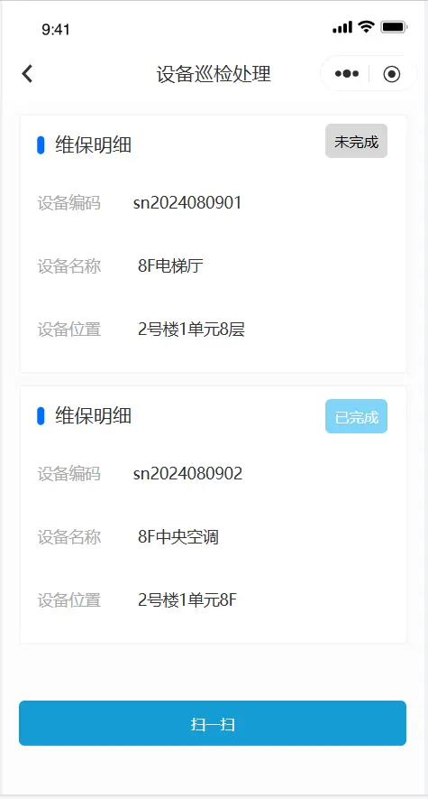 - 维保明细页面,点击扫一扫按钮,请求微信扫一扫功能,扫描设备二维码,跳转到设备巡检详情页面;