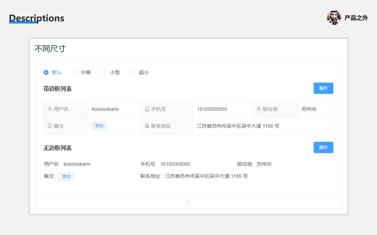 学会这些,我感觉离出海赚刀乐又进了一大步。 04 细节掌控 一个常规的后台列表页,包含的内容其实并不多,主要有“搜索、筛选、操作、表格、分页”等组件。 ![]() 如果按之前的方法,用 Axure 原型绘制一个日期时间选择器,基本功较差的产品小白,很容易搞出实现成本超高的离谱方案。 这样效率太低不说,前端一般也不会鸟你。(我今天心情不好,你这个方案懒得写,要么你就给我下楼买杯咖啡~ 一些效率高点的产品老油条,要么自己做个组件、要么东拼西凑不知哪来的组件库,直接拖拽搞定。 除此之外,为了满足更友好的交互体验,可能还需要写大概几十字的规则介绍。 内容包含“支持点击今天/明天/本周类似的快捷选项、结束时间默认 23:59:59”等说明。(原型仔可能就跳过了,我眼里只有界面。 这也是我一直以来都习惯的文档形式,现在看来耗时又耗力,前端还没精力、没耐心完全看完。 那按伪代码的方式,要怎么描述呢? 以 Element 组件库为例,其实你只要指定它的日期时间选择器组件 DateTimePicker,然后加上一些属性即可。 ![]() 例如:DateTimePicker :default-time=”[12:00:00, 23:59:59]” :picker-options=”[今天, 明天, 本周, 本月, 今年]” 换样式就更简单了,花几秒钟改个值的事情。 Element 库中的描述列表组件 Descriptions,一般用于显示用户信息。 ![]() 我只要把 Descriptions :column=”3″ border 的 column 改值和去除 border 属性,就能得到一行显示任意数量字段的无边框列表。 这种伪代码的需求文档,让我更清晰知道一个组件库的能力边界和适用场景。 以至于对方案的样式和细节把控,也得到了大幅提升。 再有开发说这个不能做,不用我教,你也知道该怎么办了吧? 05 批量产出 互联网中产生价值的前提是,创造优质的结构化数据,而这正是 AI 最擅长的领域。 当我用结构化伪代码的形式,代替之前的图形化产品文档后,我发现原先一个较通用的模块级产品文档,需要产品花 1~3 天完成。 现在用 AI + RPA 批量产出,效率至少提高 10 倍,极限时间大概 2 小时。 思路大概是这样:Template + Prompt + AI + Workflow + RPA。