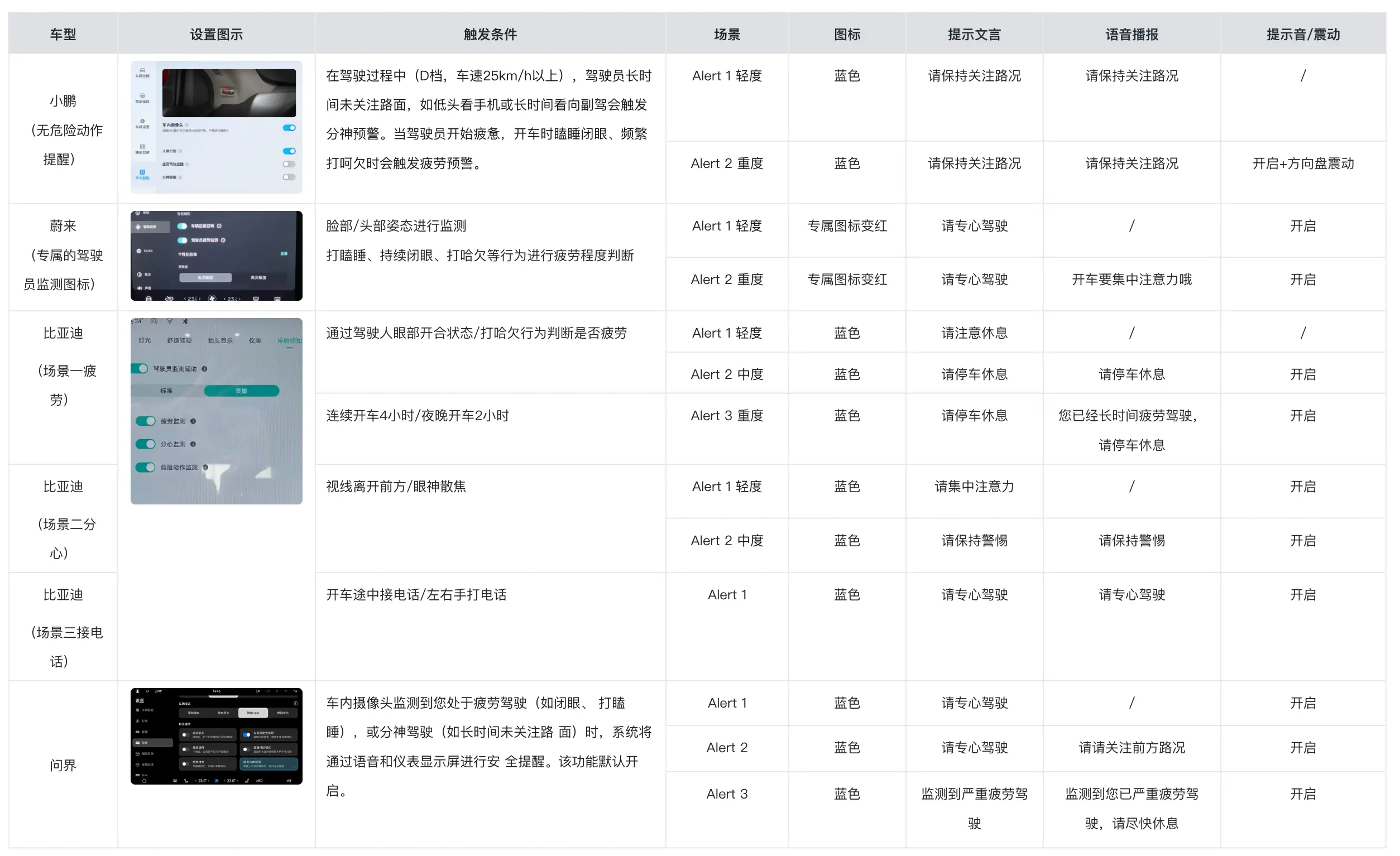 1.2.3 核心功能 ![]() 二、行业情况 2.1. 竞品分析通过对各车企DMS功能的梳理,以蔚来、小鹏、比亚迪为例,分别从出发条件以及视听触多维度进行分析;