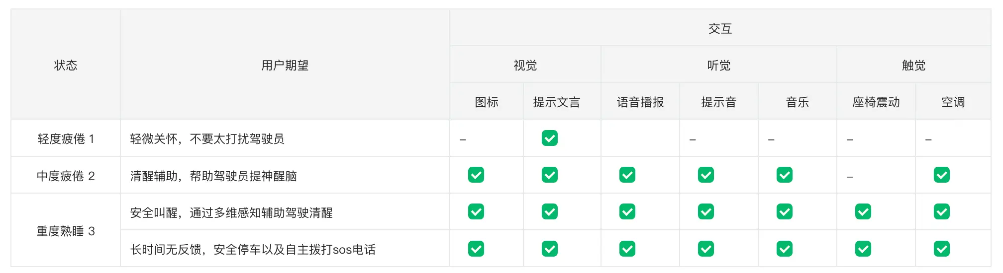 4.2. 不同疲劳等级下的功能设计通过人体的多维感知,来帮助驾驶员清醒驾驶,从而减少疲劳驾驶的风险。 除了传统的TTS和chime音外还可以增加音乐或者空调吹风等方式辅助驾驶员: